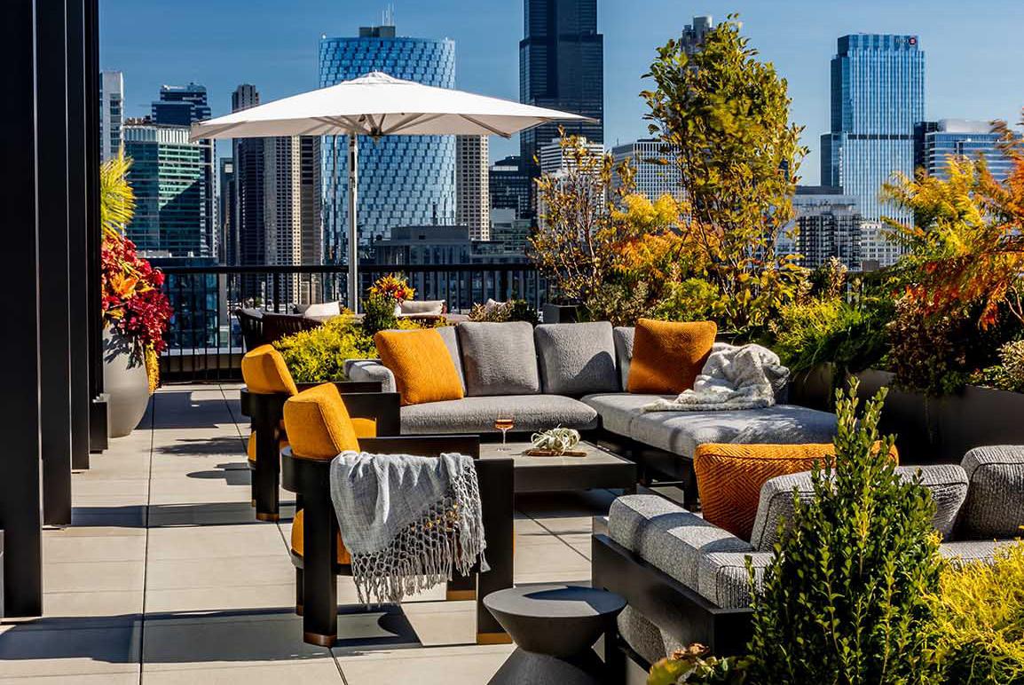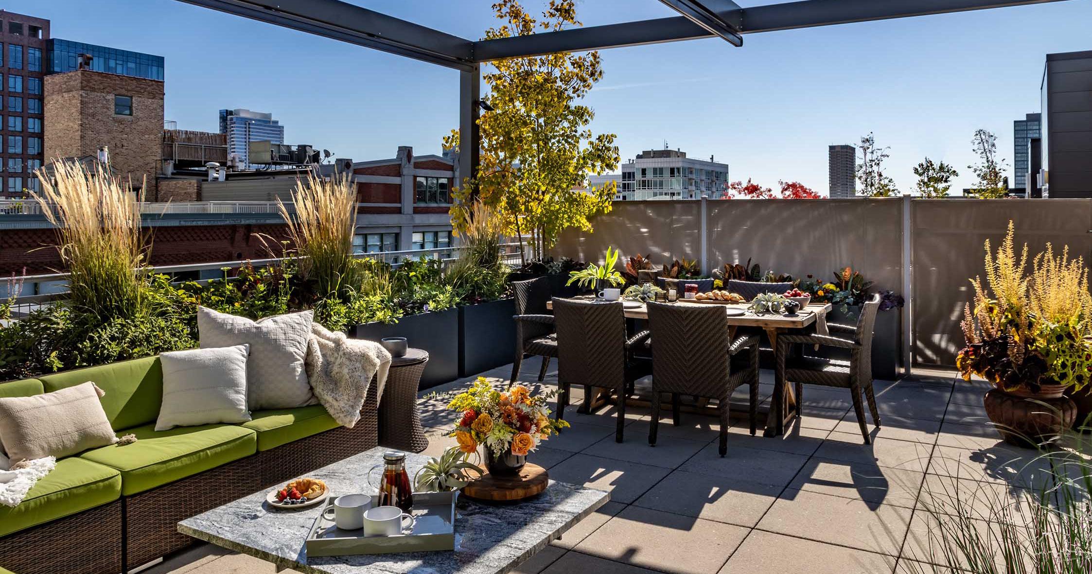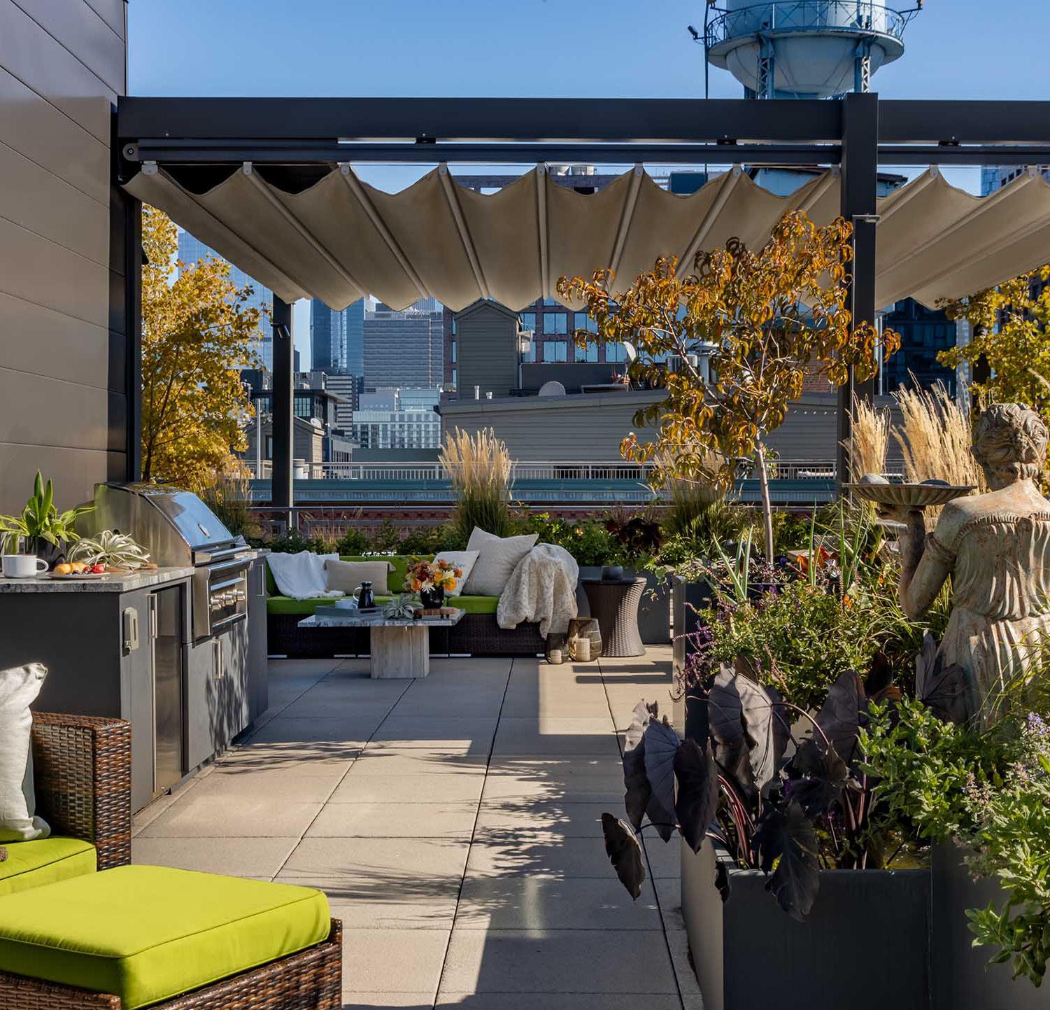 To soften and scale the expansive penthouse terrace, large sequences of aluminum planters were filled with mixes of trees, shrubs, and perennials, creating distinct conversation areas while preserving Chicago skyline views. Plant textures and colors were specifically selected to complement the exterior furniture and contrast beautifully with the aluminum facade and planters. A dog run and full kitchen add functionality, elevating the client’s experience and bringing daily luxury to the large rooftop terrace.