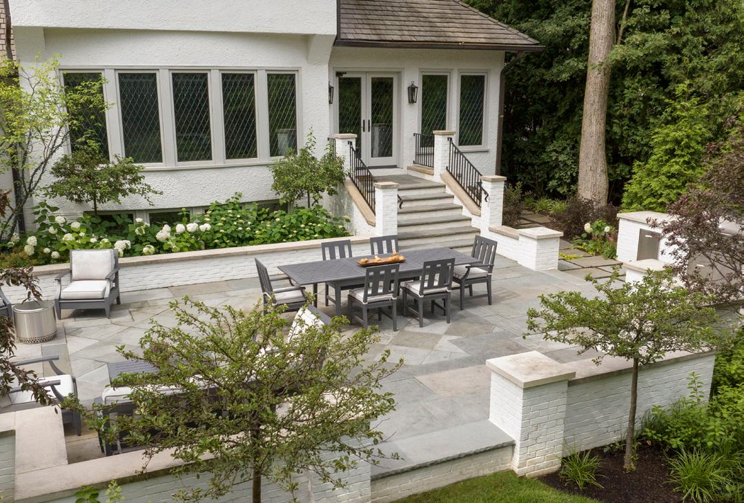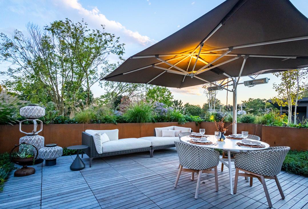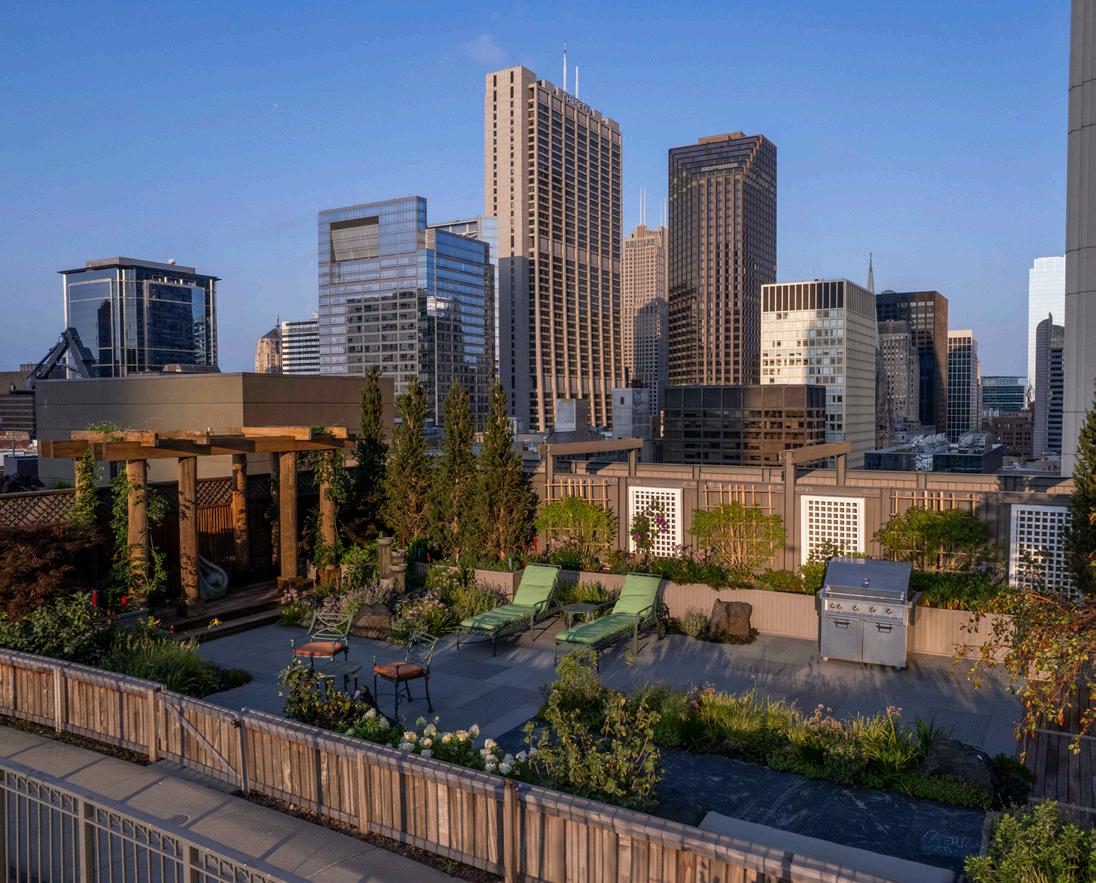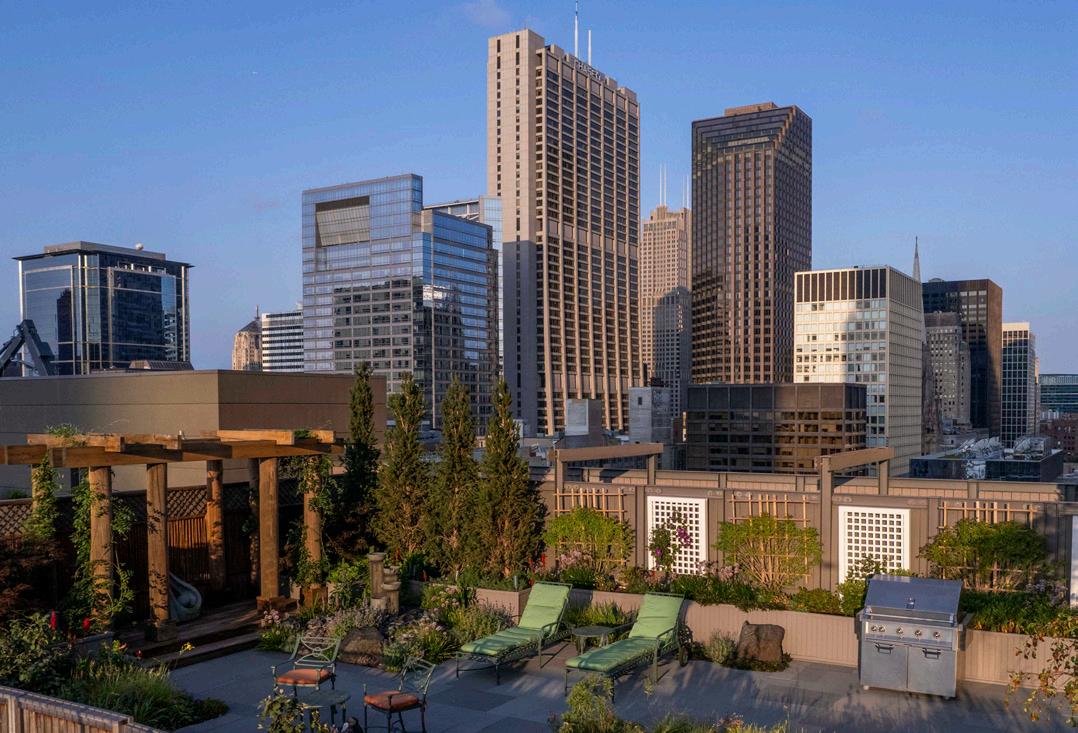 To soften and scale the expansive penthouse terrace, large sequences of aluminum planters were filled with mixes of trees, shrubs, and perennials, creating distinct conversation areas while preserving Chicago skyline views. Plant textures and colors were specifically selected to complement the exterior furniture and contrast beautifully with the aluminum facade and planters. A dog run and full kitchen add functionality, elevating the client’s experience and bringing daily luxury to the large rooftop terrace.