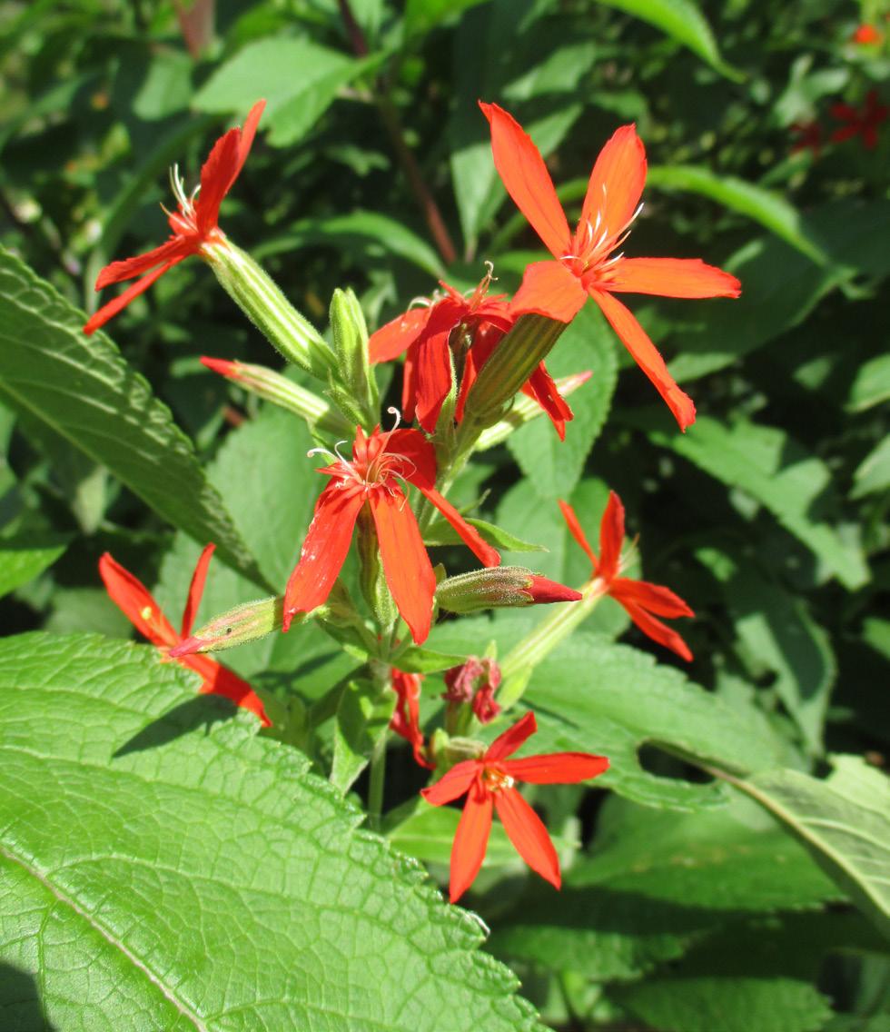 Silene regia is one of few red-blooming prairie plants native to the Midwest and is also on a short list of those pollinated by hummingbirds. Also called “prairie fire”, royal catchfly features five-petaled, tubular, bright scarlet blooms (2” diameter). The narrow petals are slightly toothed and flowers feature conspicuous, extended stamens. The common name “catchfly” is due to the sticky hairs on the calyx and stems. The impactful flowering period is typically July and August and ruby-throated hummingbirds are not shy about visiting. Black swallowtails are also a very frequent visitor looking for a “nectar fix”!