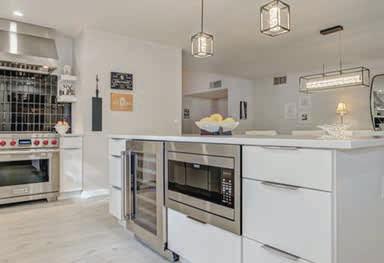 There's a breakfast nook off the kitchen, and a separate dining room with large windows that look out into the forest. The master bedroom has a full bath, a double vanity, and a walk-in closet. The second bedroom is perfect for family or friends, and there's a guest bathroom with step-in shower. Plus, there's a huge laundry room with washer, dryer and cabinets.