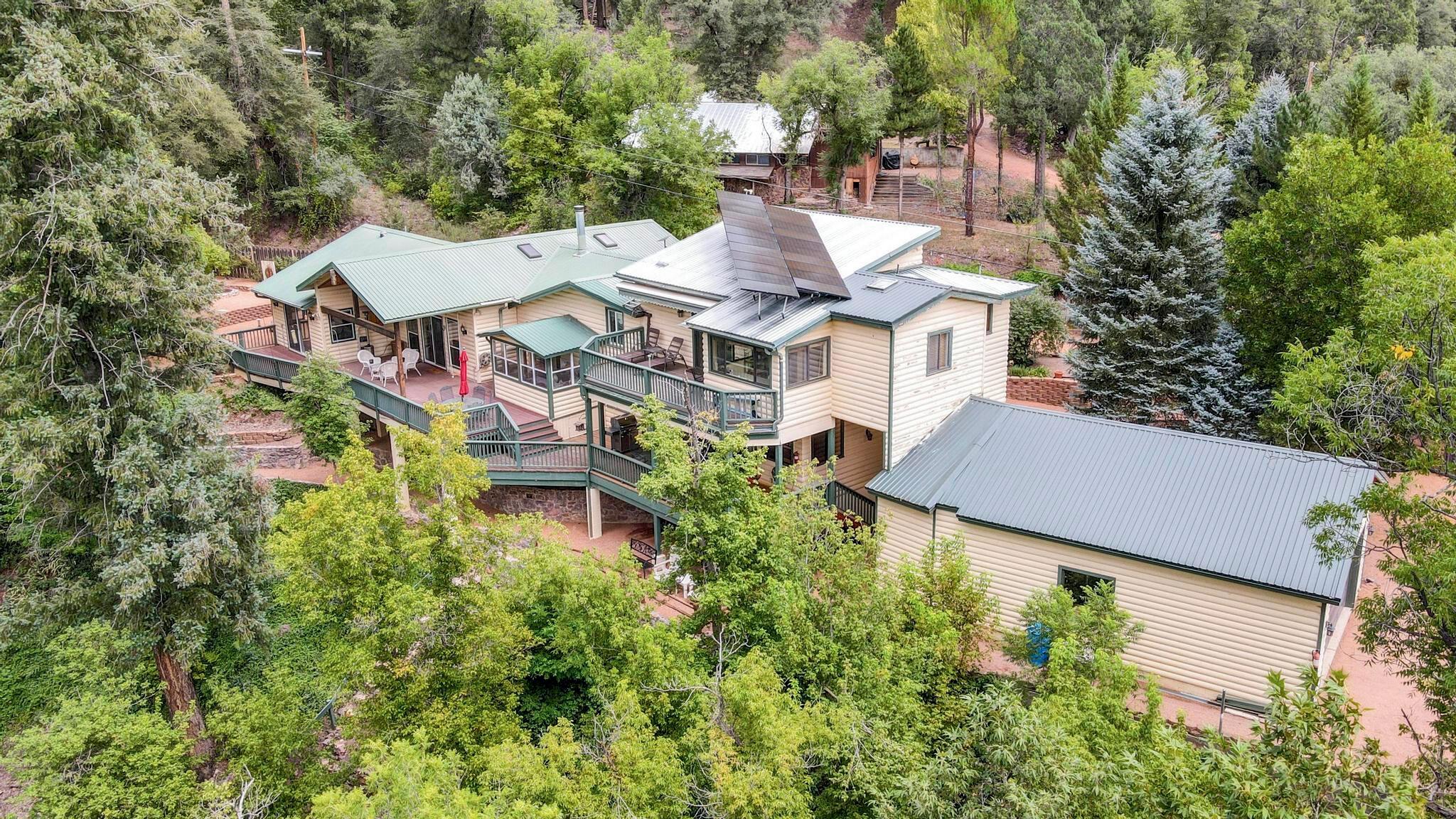 2103 E Filaree Circle, Chaparral Pines Golf Community: Breathtaking mountain views from this 5BR, 6 bath, ±3735 sf mountain home with an attached 2-car garage plus a detached 2-car garage / heated workshop, and owned solar panels. Separate guest quarters are complete with kitchenette, bath, and a private view deck. Open-concept family room, kitchen w/ eat-in dining, breakfast bar and pantry, wood-burning stove w/ rock accents, and floor-to-ceiling windows. The main-level primary suite features a F/P (gas), walk-in shower, jetted tub, and a walk-in closet. There are two guest rooms, one with en suite, and there's a home office. The wrap-around Trex decks are covered and open, and there's a hot tub. Upgrades include a paver driveway, two whole house "quiet" fans for fresh evening air, surge protection for the entire home, and R60 roof insulation in both the guest quarters and main home, ensuring extra-low utilitiy costs. $1,299,000 (90673)
