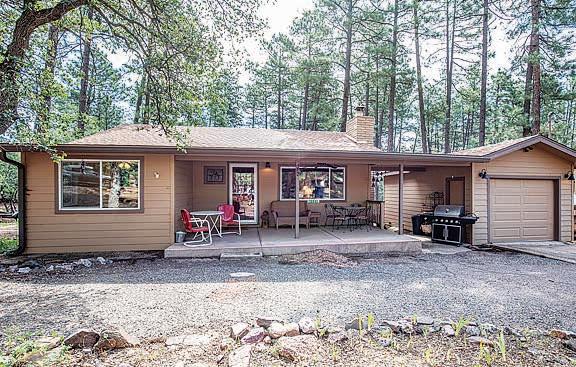 5451 W Pinon Drive: Wellmaintained cozy cabin on 1.23 wooded acres backing the Nat’l Forest. 3BRs, 2 baths, 1042 sf, gas fireplace in the greatroom, beautiful wood / vinyl flooring, master with access to huge decks, both covered and open. $499,000 (90342)