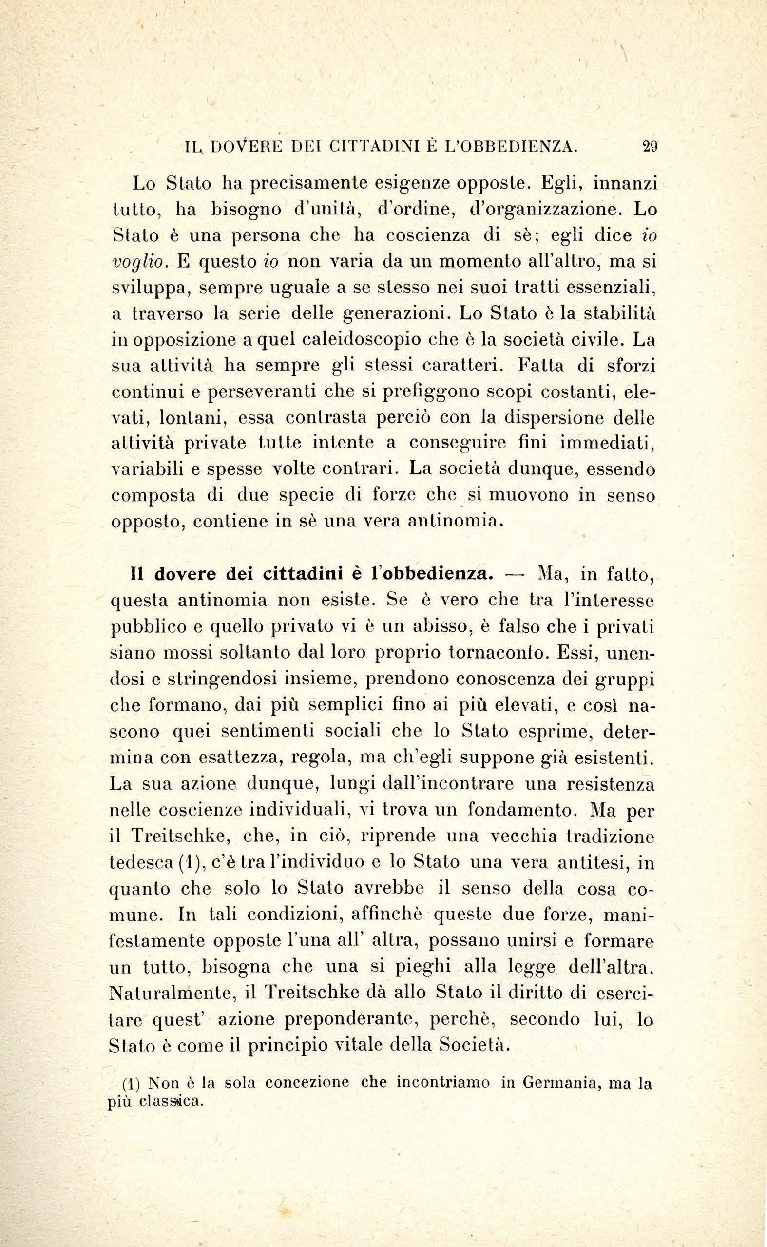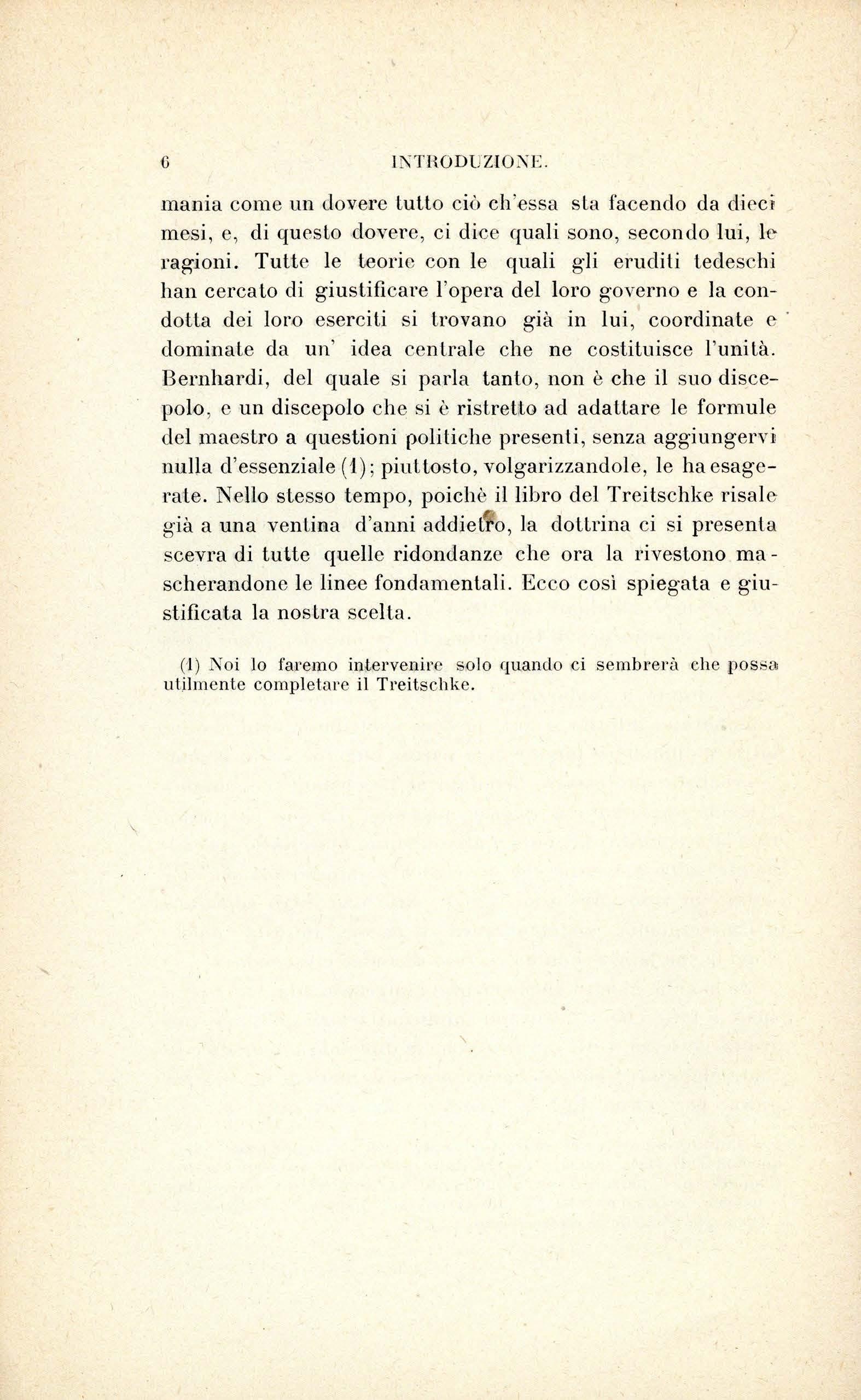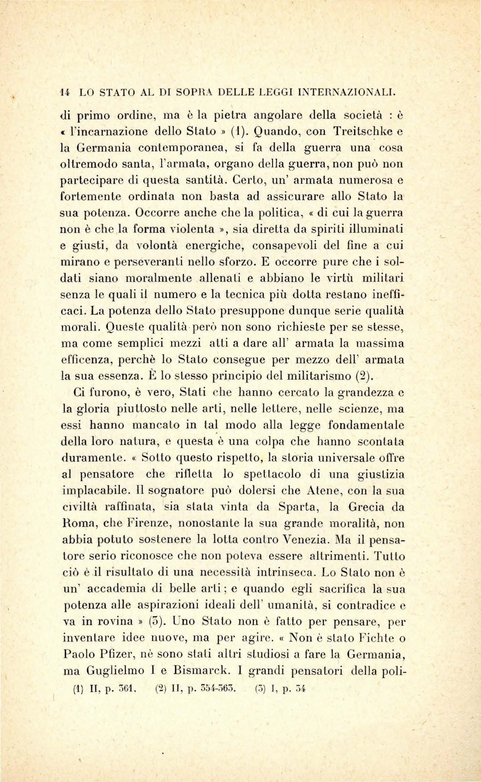 Questa disposizione mentale sarà studiata seguendo il Treitschke . - Per d escr i ve rlo , n o n sa rà ne c essario c h e n oi n e ce r c hi amo qua o l à g li e lementi p er poi ra cco g li e rli e riunir e g li uni a g li a llri più o meno artifi c ia lm e nt e U n o sc rittor e t edesco h a es po s to quc s Lo sis t ema pe r s uo propri o c o nt o, c on una piena e c hi ara co no sce nza d e i prin c ip1 s ui qua li ess o rip osa e d e ll e co n seg u e nz e c h e"se ne pos so no trarr e: è Emi co vo n Treit sc hk e nell e s ue va ri e opere , m a più sp ec ialmente nell a s ua P oliti/e ('I). Dunqu e noi n on po ss i a m o fa r cosa mi g li o r e c h e pr e nd e l'lo per g uid a e far e in modo c h e