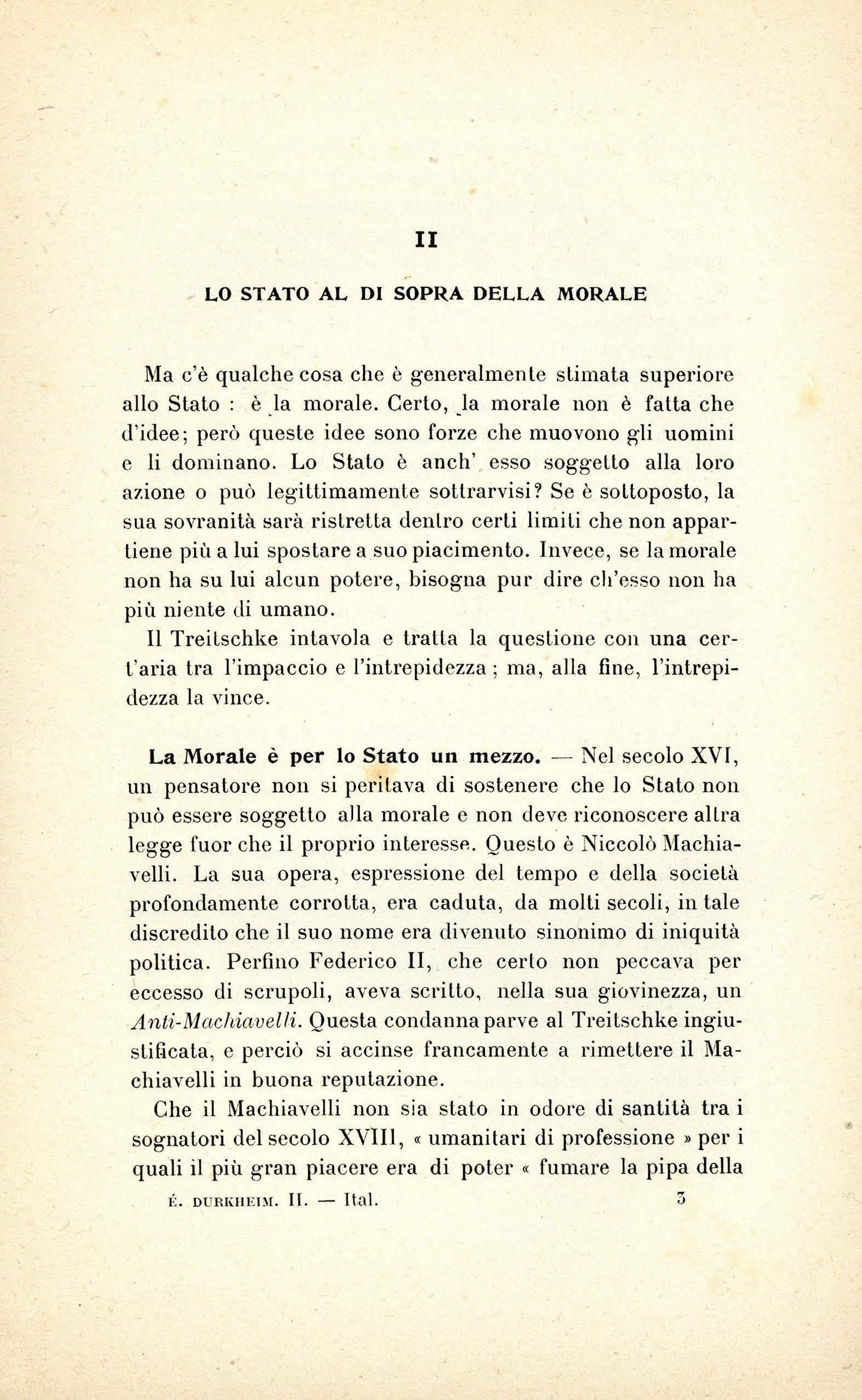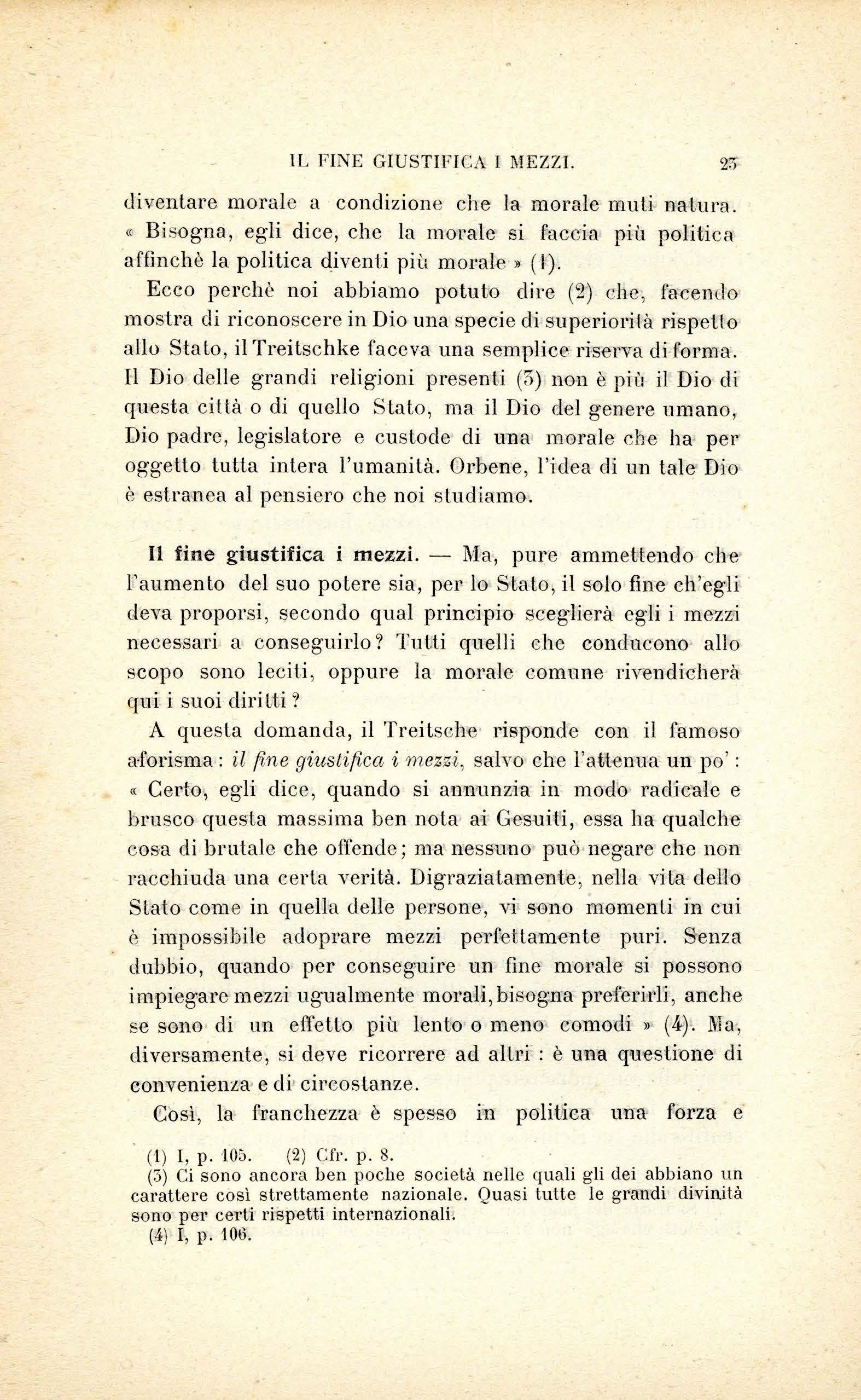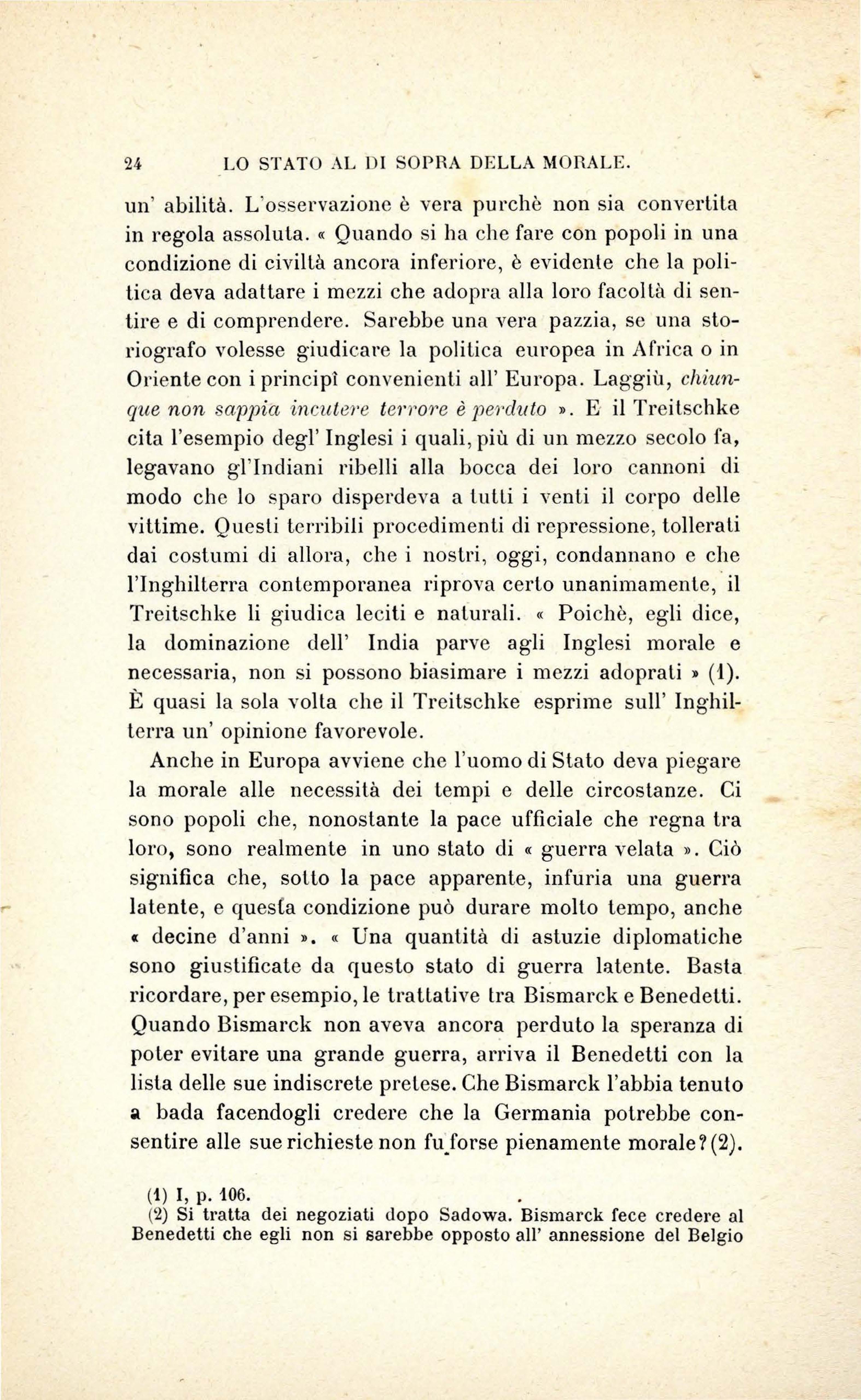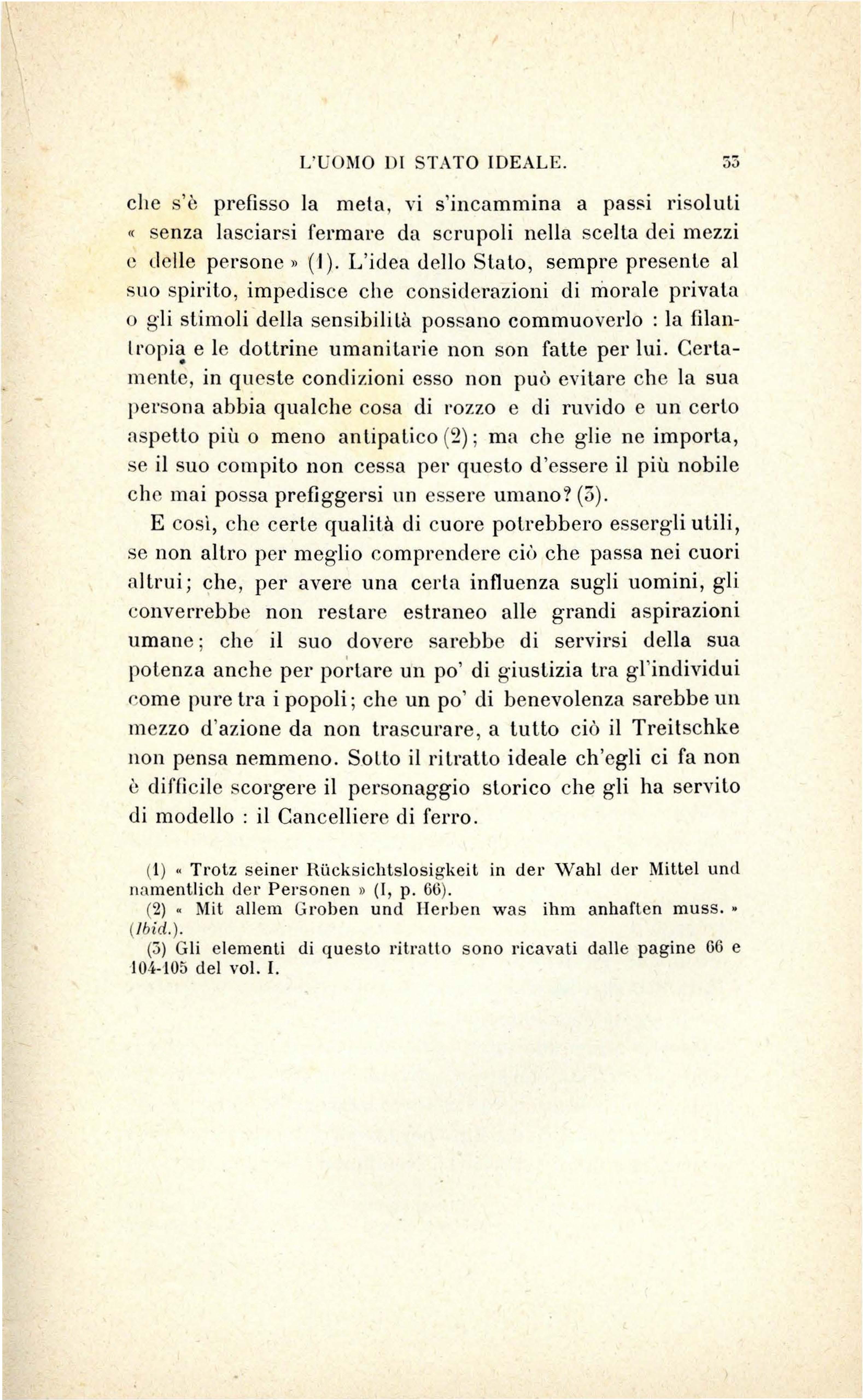 Questa disposizione mentale sarà studiata seguendo il Treitschke . - Per d escr i ve rlo , n o n sa rà ne c essario c h e n oi n e ce r c hi amo qua o l à g li e lementi p er poi ra cco g li e rli e riunir e g li uni a g li a llri più o meno artifi c ia lm e nt e U n o sc rittor e t edesco h a es po s to quc s Lo sis t ema pe r s uo propri o c o nt o, c on una piena e c hi ara co no sce nza d e i prin c ip1 s ui qua li ess o rip osa e d e ll e co n seg u e nz e c h e"se ne pos so no trarr e: è Emi co vo n Treit sc hk e nell e s ue va ri e opere , m a più sp ec ialmente nell a s ua P oliti/e ('I). Dunqu e noi n on po ss i a m o fa r cosa mi g li o r e c h e pr e nd e l'lo per g uid a e far e in modo c h e