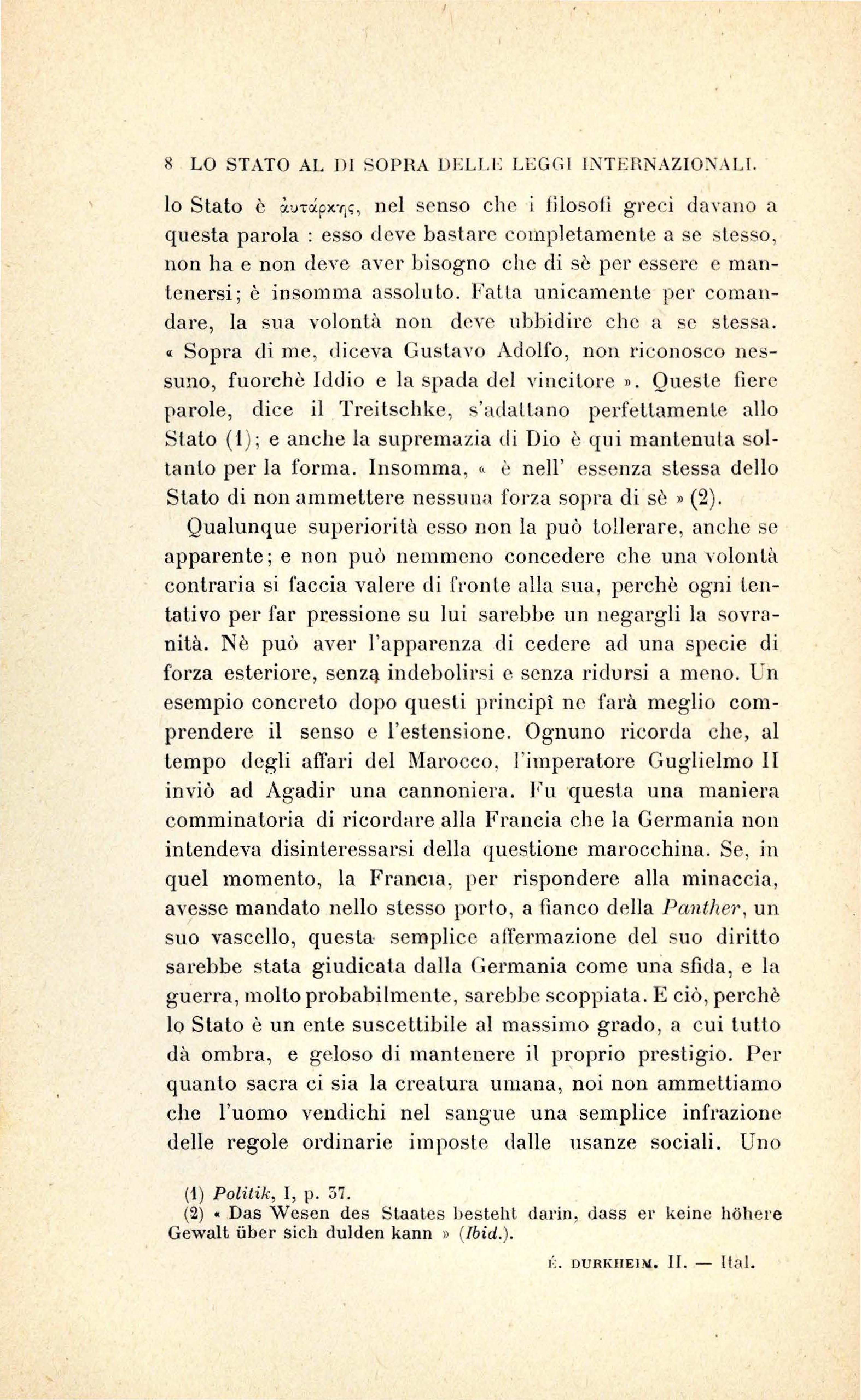 Qualunque s u per i or it à esso non la può l o ll e rare , anc h e se apparente ; e non può n e mm e no co nc ed ere c h e un a v olon t à co ntraria s i faccia valer e di fronte a ll a s u a, per c h è ogn i t e ntativo per far pr.essione s u lui s ar e bb e un negarg li la so vranità. Nè può aver l'apparenza d i cedere ad una s pec ie di forza es t e rior e, se nz & ind ebo lir s i e se nza ridur s i a m e n o. U n ese mpio co n c reto dopo qu es ti prin c ipi n e fa r à meglio compr e nder e il s e nso e l' es tensi o ne . Ognuno ri corda c h e, a l t e mpo d egli affari d e l Maro cco, l' imp eratore G u g li elm o Il inviò ad Ag a dir un a c annoni e ra . Fu ·questa una ma ni e ra co mmin a tori a di ricordar e a ll a Francia c he l a Ger mania non intend e va disinter ess ar s i d ell a qu es ti one maro cc hin a. Se, in quel mom e nto , la Fr a ncia , per ri sp ond ere a ll a min accia, avesse mandalo nello s t esso porlo, a Ganco d ell a Panth ei·, un s uo vasc e llo , qu es ta- se mpli ce affe rmazi one cie l s u o diri tt o sarebbe s lala giudi ca l a dalla Ge rmania come un a s fida, e la g u e rr a, molto probabilm e nte, sa r e bb e sco ppiala. E c iò, p e rch è Io Stalo è un e nl e s u scetl ibil e al ma ss im o gra d o, a c ui Lulto dà ombra, e ge loso di mant e n e r e il proprio prestigio. Per qu a nto sac r a ci sia l a crea tu ra umana, n o i n on amm e tti amo c he l'uomo ve nd ic hi n el sa n g u e un a sem plic e infra zion e d ell e regole ordinari e impo s t e dalle usa nz e soc iali. Uno