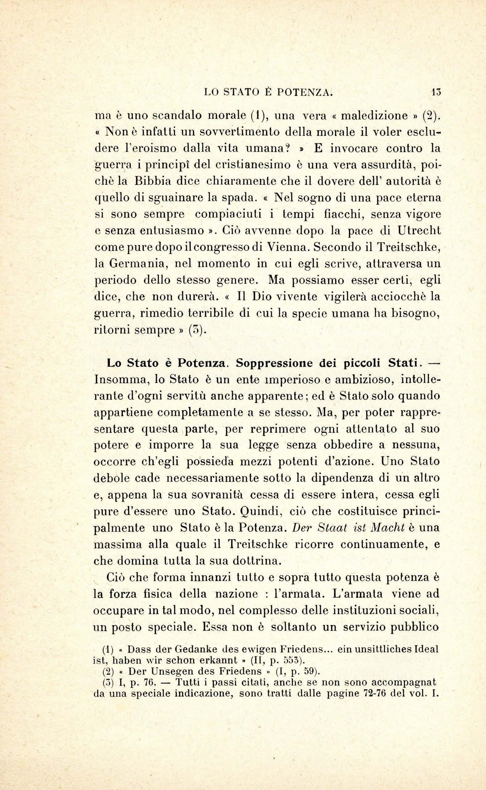 Da tutto c iò il Tre il sc hk e d e du ce ch e l' e sist e nz a dei picco li Stati è una sopr av vivenza infondata, e g iudi c a n a tural e c h e debbano s parir e: il loro de s tino è qu e llo di esse r e in g oiali d ag li Slali grandi. E poich è la di g nità di g rand e Sta to non è ri co nosciut a pienament e che in cinqu e Potenz e (l'll a lia ci è pr ese ntat a soltanto a ll a v i g ili a di es se r e amm es s a in questa a ri s tocrazia dei popoli e urop e i )( 4) , è facil e pr e ved e r e c he cosa div e nter e bb e la ca rt a d ' Europ a s e l e id ee d e l Tr e it sc hke, ch e s ono quell e d e lla Ge rm a nia cont e mporan e a , do v es sero a ve re e ff e tto.