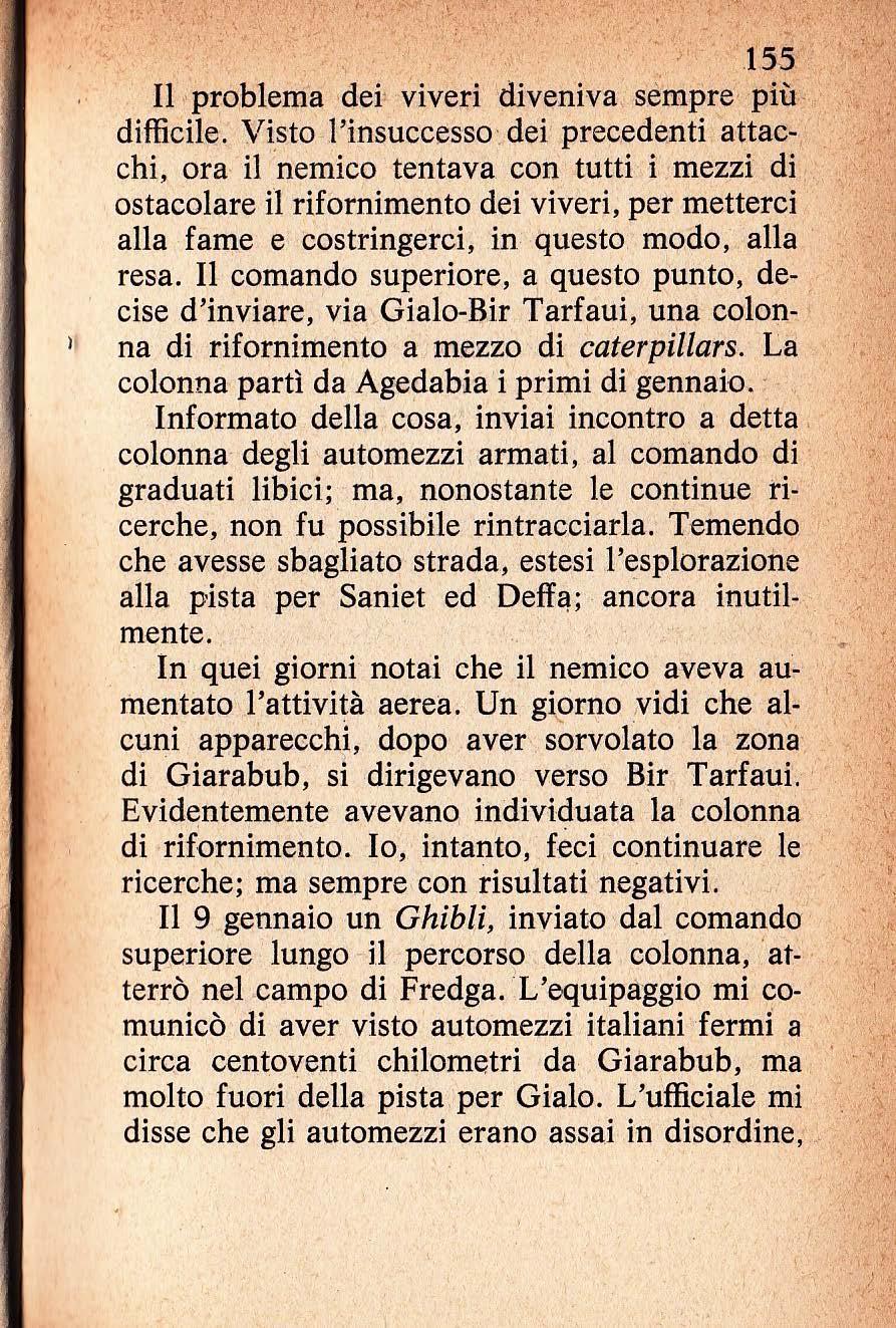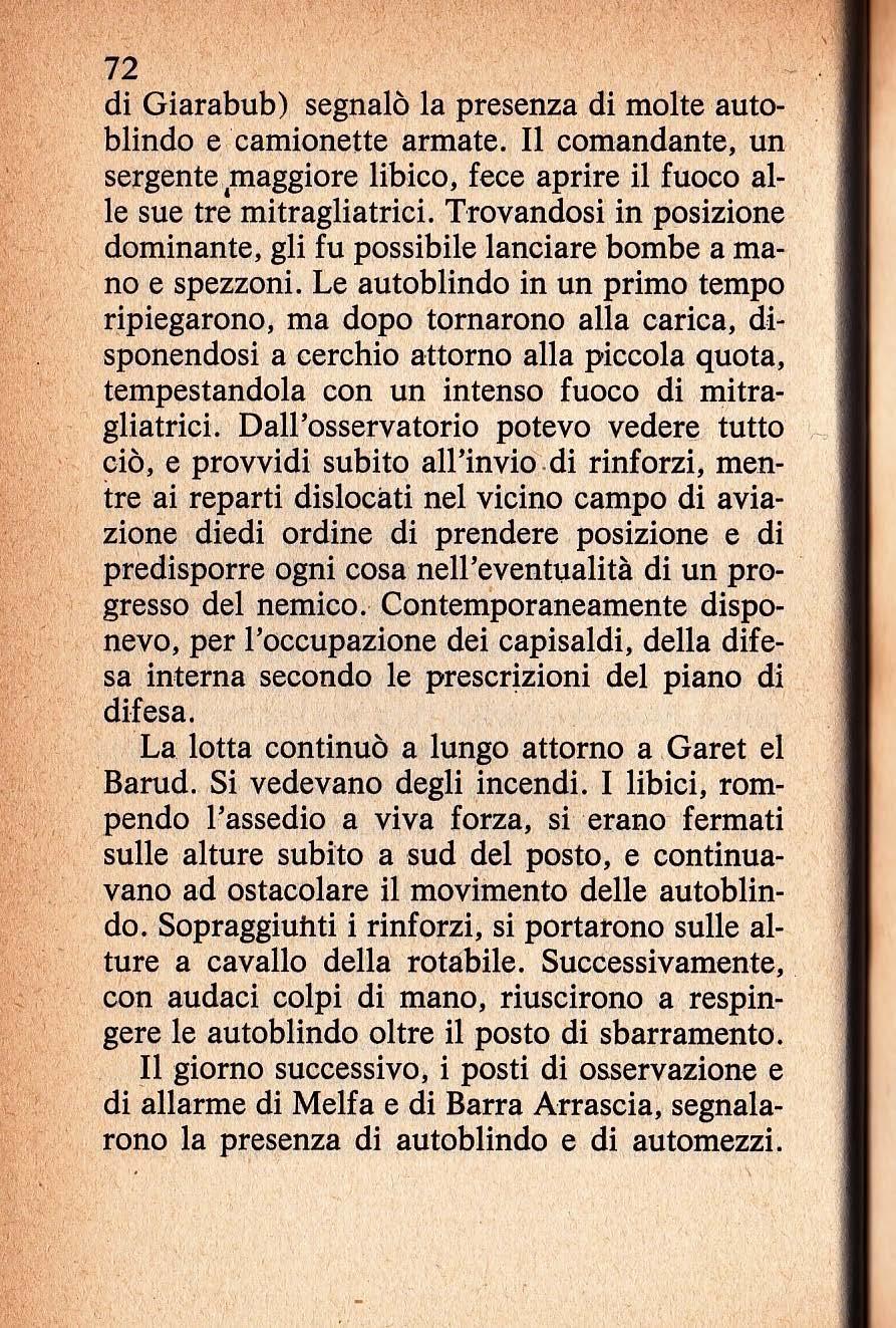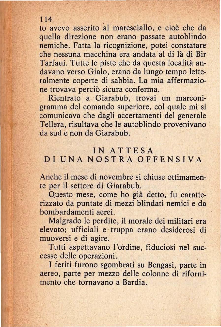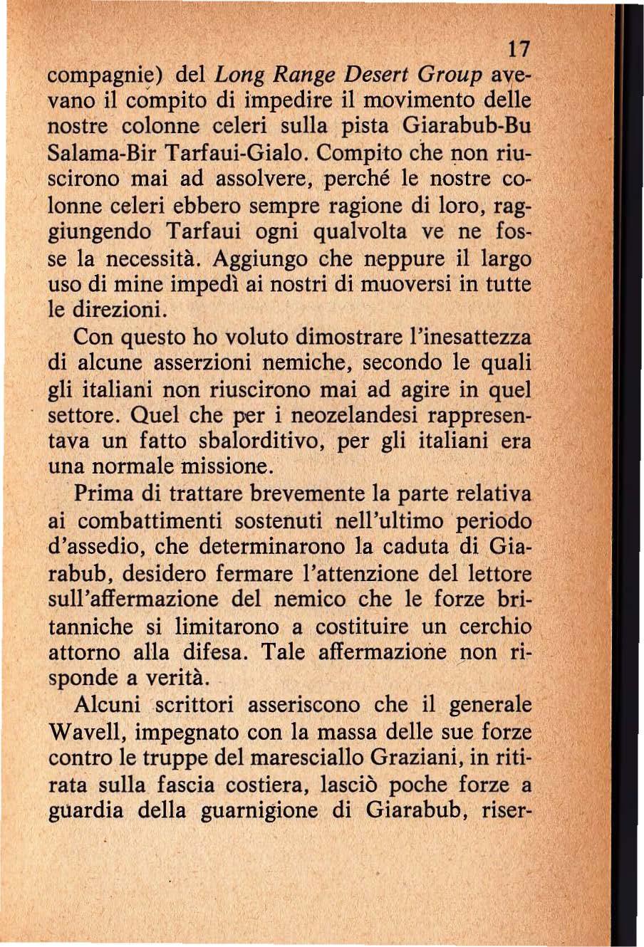 Anche la stampa nemica ha , alla fine, riconosciuto il valore dei difensori di. Giarabub . Ho letto alcune pubblicazioni inglesi relative alla campagna di Wavell. In quelle pubblicazioni sono descritti i combattimenti di Sidi Barrani e quelli di Bardia, Tobruch , Derna, Soluch, che portarono l'armata britannica alla conquista della Cirenaica. Alcuni scrittori hanno magnificato l'azione del Long Range Desert Group nel deserto libico, ed il concorso da esso dato ai francesi alla conquista dell'oasi di Cufra . I.n quasi tutte le descrizioni, c'è una marcata acidità con-