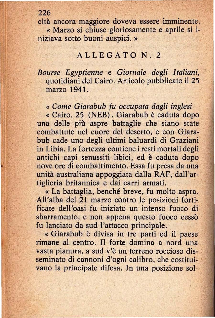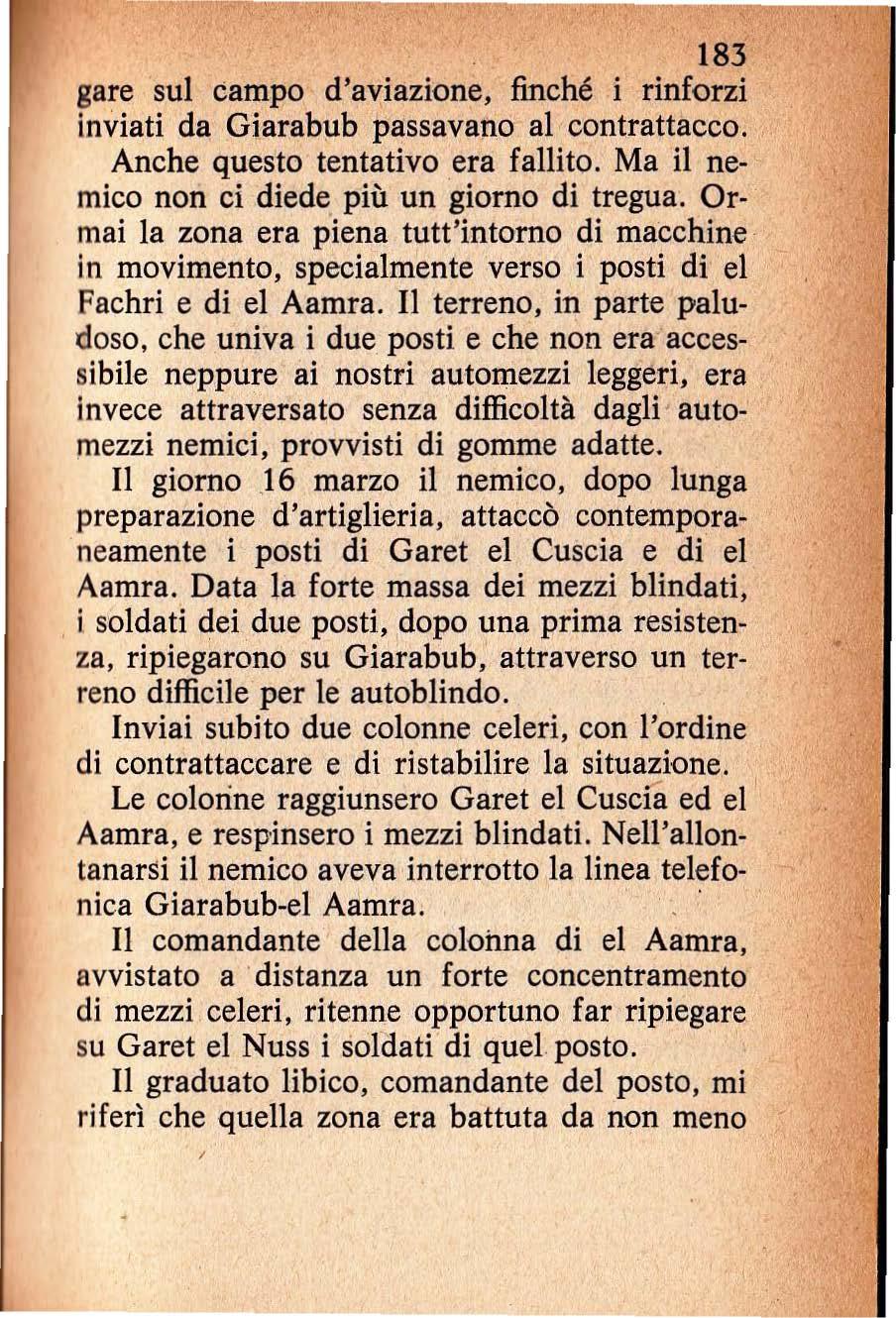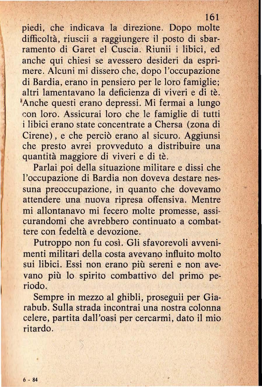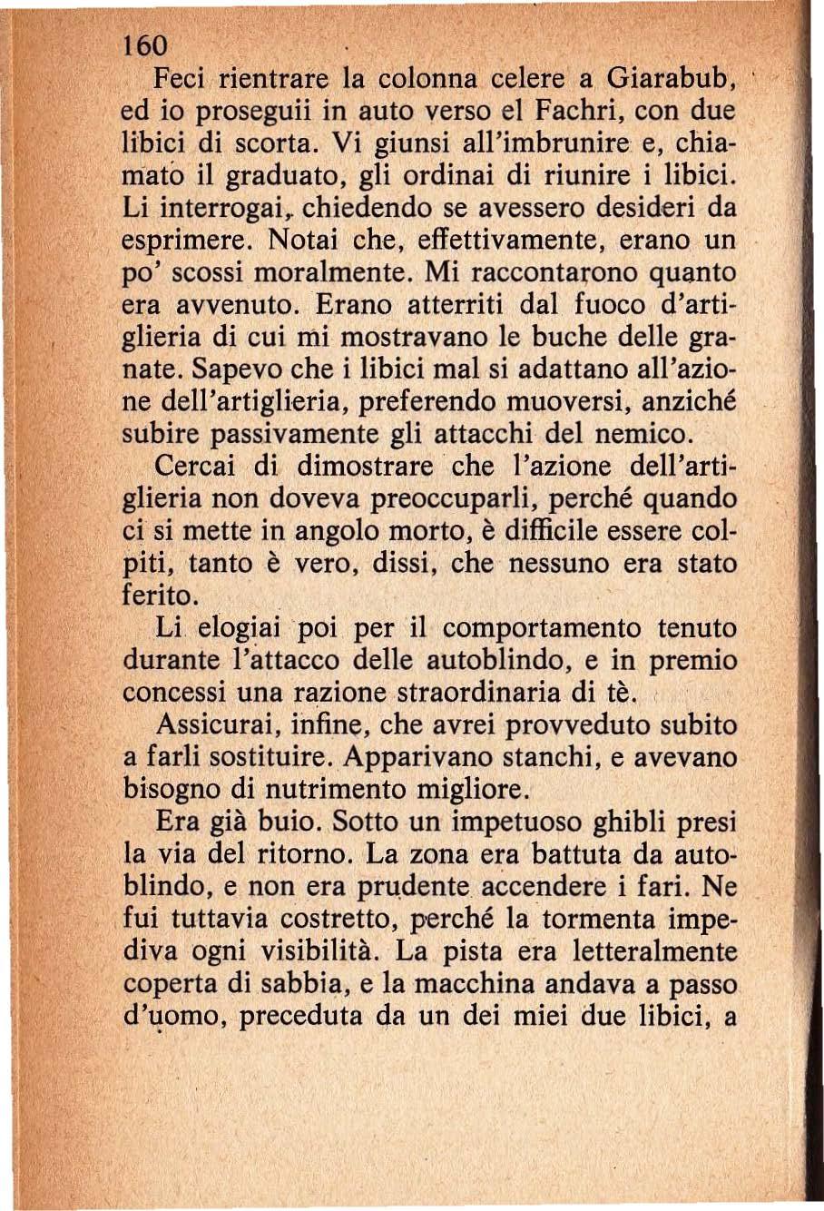 Anche la stampa nemica ha , alla fine, riconosciuto il valore dei difensori di. Giarabub . Ho letto alcune pubblicazioni inglesi relative alla campagna di Wavell. In quelle pubblicazioni sono descritti i combattimenti di Sidi Barrani e quelli di Bardia, Tobruch , Derna, Soluch, che portarono l'armata britannica alla conquista della Cirenaica. Alcuni scrittori hanno magnificato l'azione del Long Range Desert Group nel deserto libico, ed il concorso da esso dato ai francesi alla conquista dell'oasi di Cufra . I.n quasi tutte le descrizioni, c'è una marcata acidità con-
