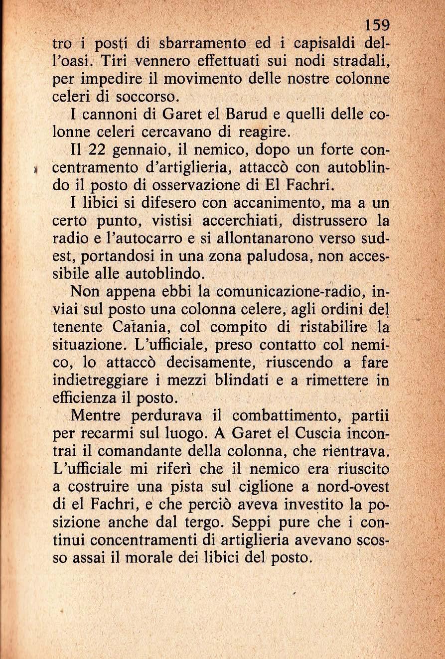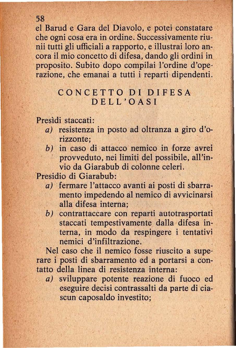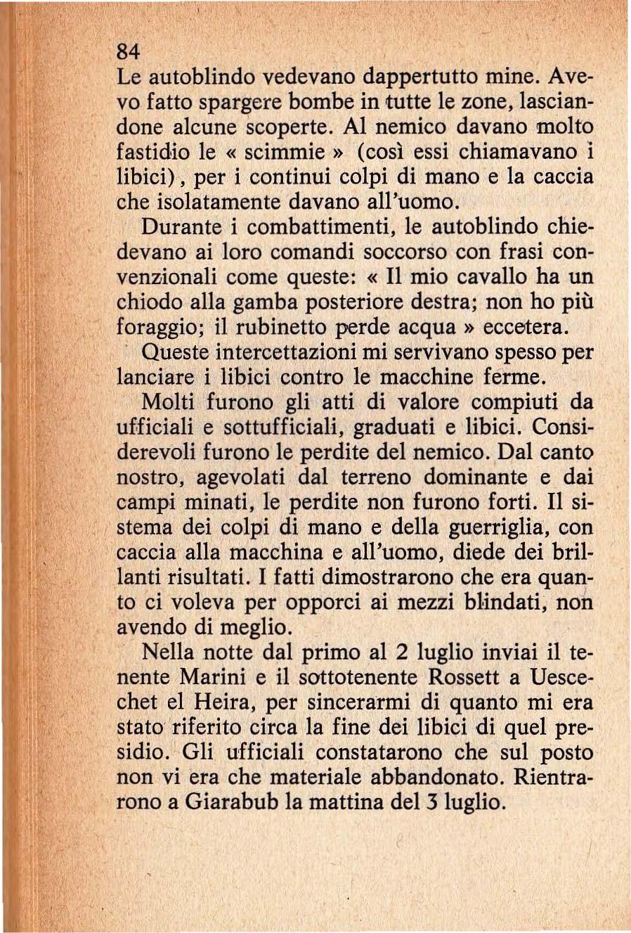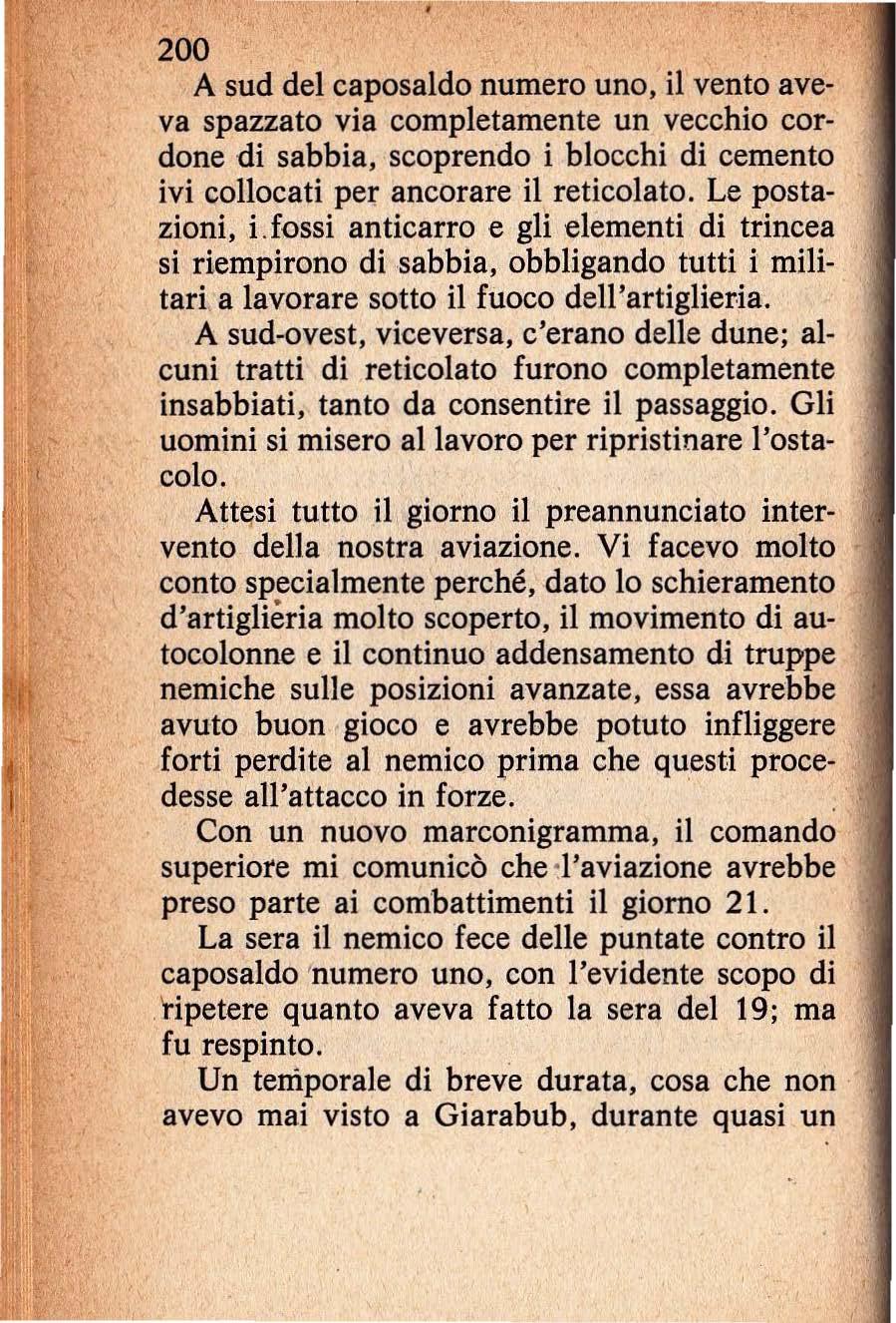 Anche la stampa nemica ha , alla fine, riconosciuto il valore dei difensori di. Giarabub . Ho letto alcune pubblicazioni inglesi relative alla campagna di Wavell. In quelle pubblicazioni sono descritti i combattimenti di Sidi Barrani e quelli di Bardia, Tobruch , Derna, Soluch, che portarono l'armata britannica alla conquista della Cirenaica. Alcuni scrittori hanno magnificato l'azione del Long Range Desert Group nel deserto libico, ed il concorso da esso dato ai francesi alla conquista dell'oasi di Cufra . I.n quasi tutte le descrizioni, c'è una marcata acidità con-