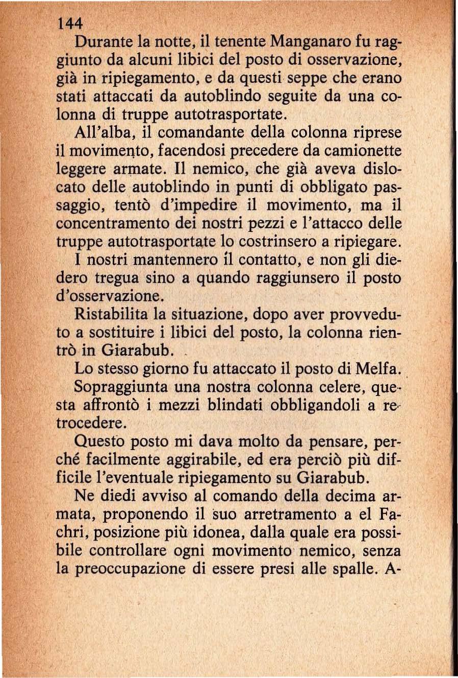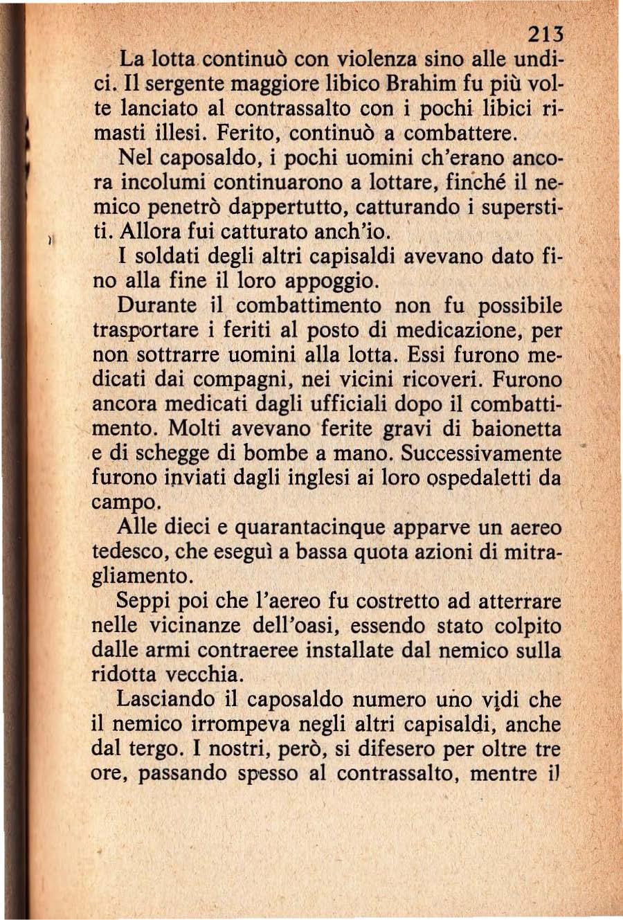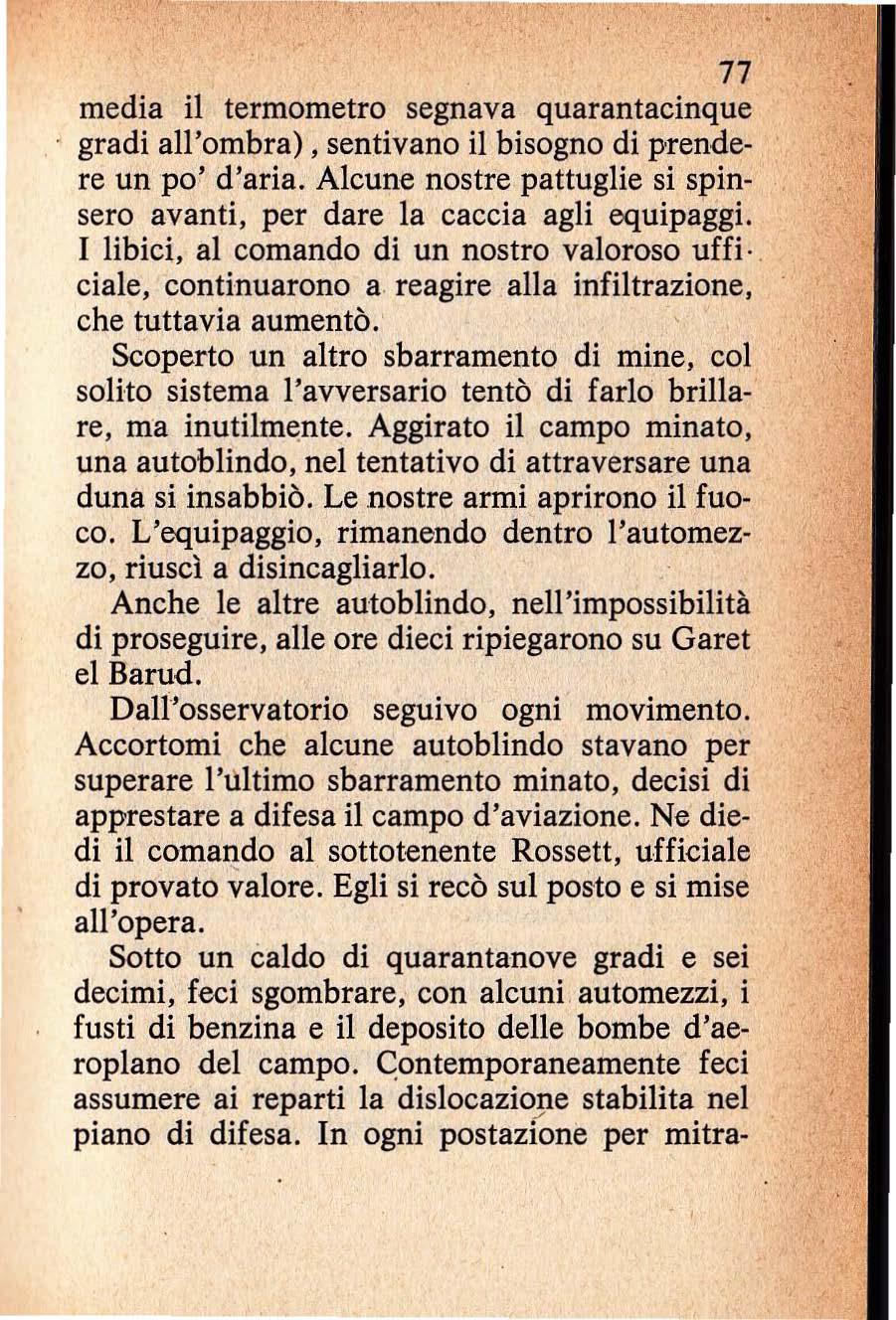Gli altri ufficiali del mio comando trascinarono più volte al contrassalto i pochi ·nazionali e i libici rimast i illesi, r iuscendo ad arginare , in un primo tempo , l 'ondata nemica.