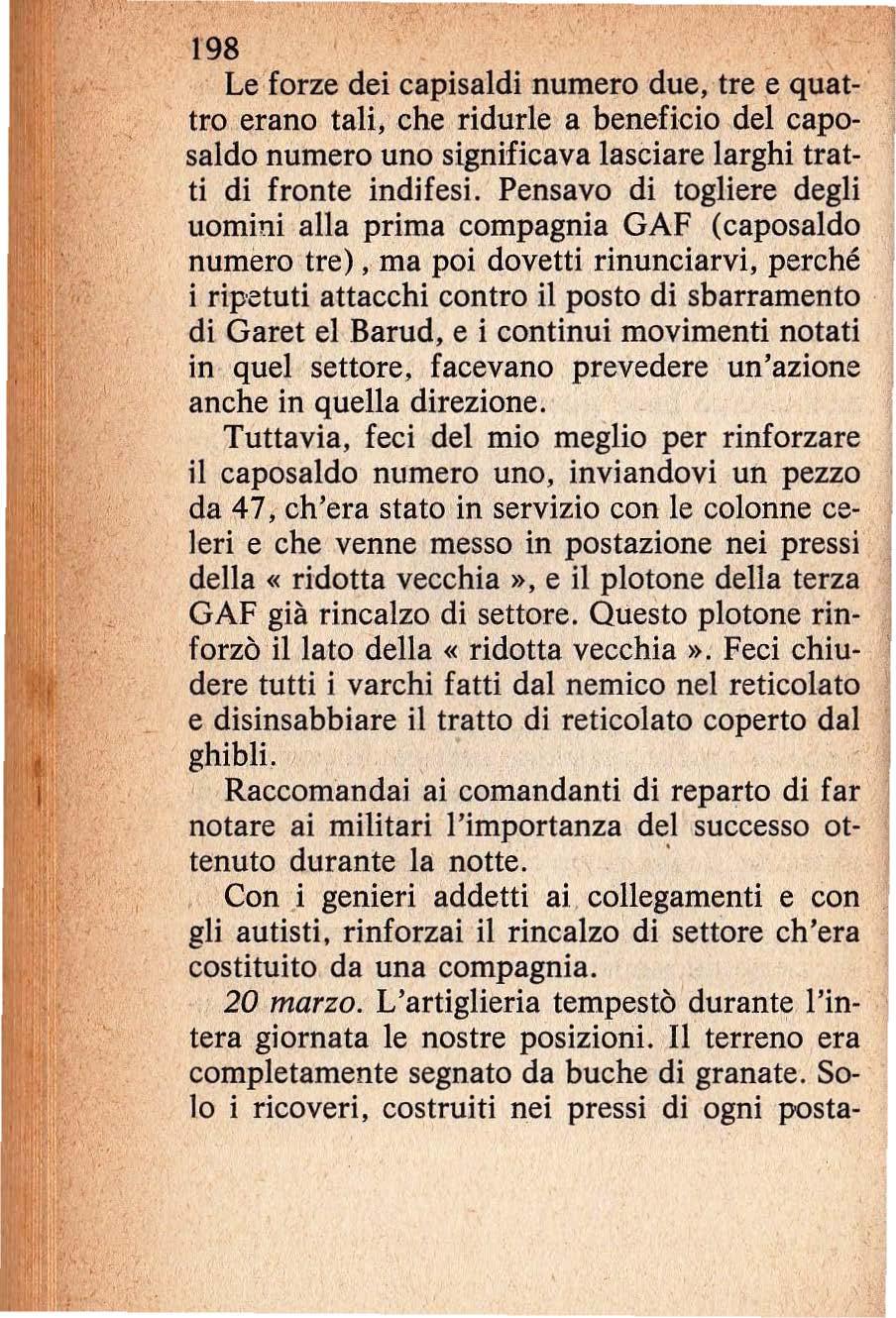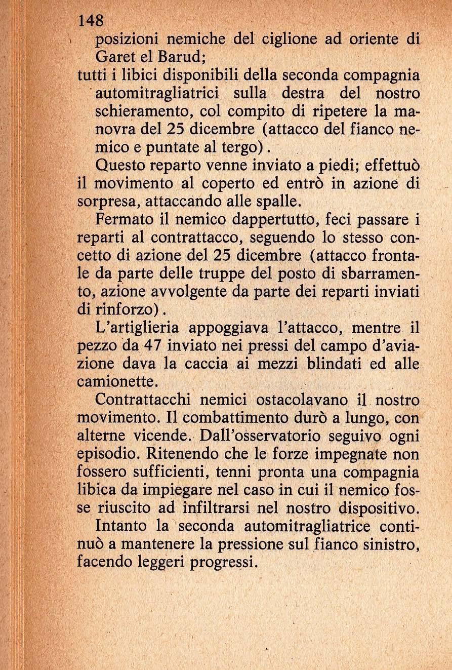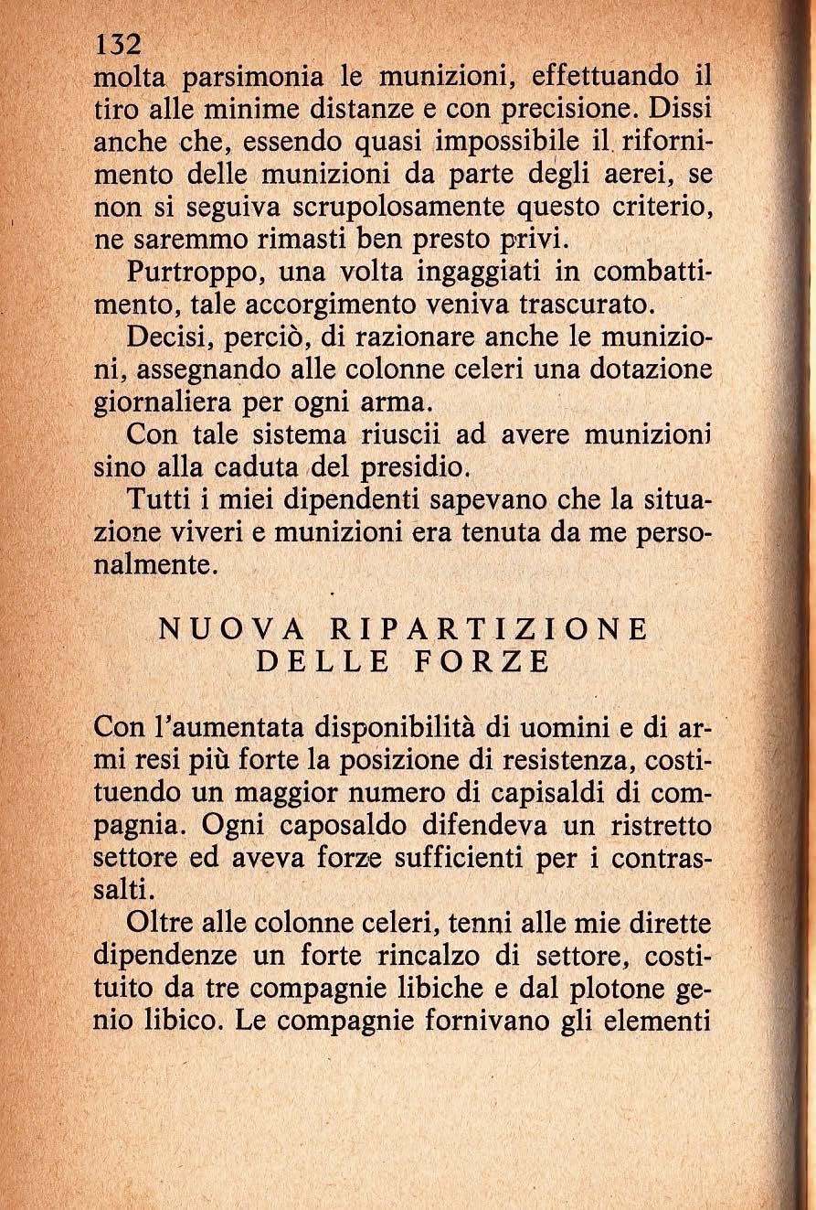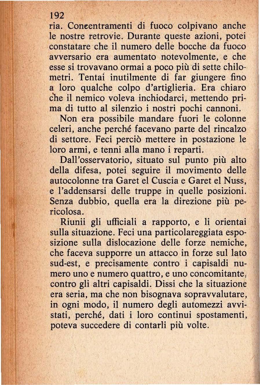 Speravo ancora di riuscire a mantenere queste ultime posizioni sino a sera . Avrei preso degli uomini degli altri ca pisaldi , e contrattaccato durante la notte per rioccupare le posizion i dominanti del caposaldo , ch 'erano la chiave della difesa del presidio . Lanciai, perciò , più volte i libici rimasti alle mie dipendenze. Es si rallentarono l ' urto nemico, ma malgrado il loro valore, non riuscimmo ad allargare la morsa , che sempre più ci si stringeva attorno.