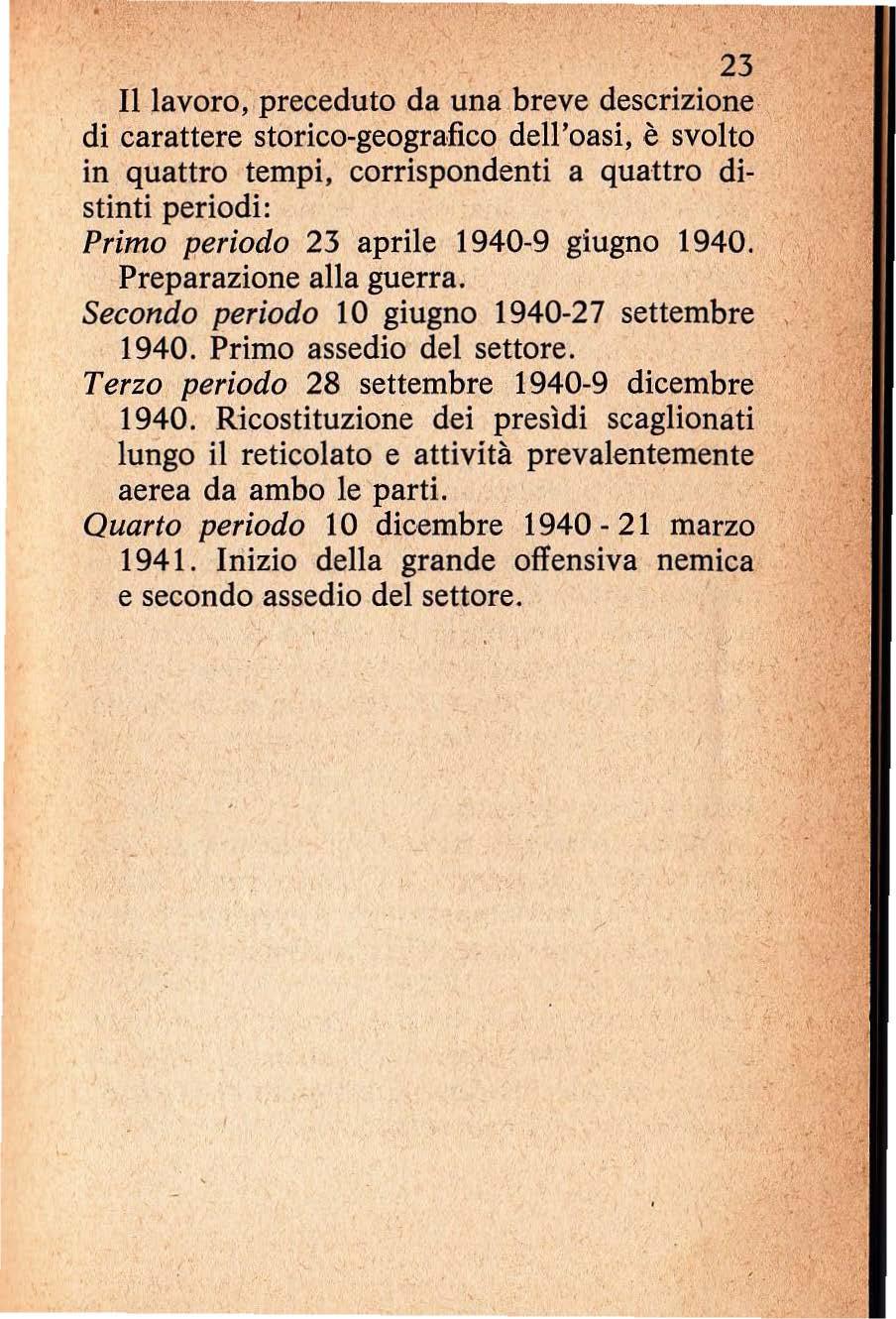 Nei primi anni della mia prigionia di guerra pensai di descrivere gli episodi più importanti della difesa di Giarabub. Desideravo fare un lavoro organico, riferendomi a tutto il periodo del miò comando . Mi occorrevano le date e i dati di forza dei combattimenti sostenuti dal presidio dal 10 giugno 1940, inizio delle ostilità, a1'21 marzo 1941, epoca in cui il presidio venne sopraffatto dalle preponderanti forze nemiche. Naturalmente il lavoro sarebbe stato possibile se avessi posseduto il diario giornaliero, che fu chiuso in cassaforte, e sotterrato, prima della mia cattura, nei pressi del posto di comando. Le continue perquisizioni che venivano effettuate nei campi di prigionia, mi fecero desistere. Farmi prendere un lavoro del genere significava, allora, portare a conoscenza del nemico riotizie segrete, dati di forza, mezzi, armi. organizzazione difensiva, campi minati, eccetera; per quanto molti documenti dei comandi fossero caduti in mano nemica, durante l'offensiva di Wavell.