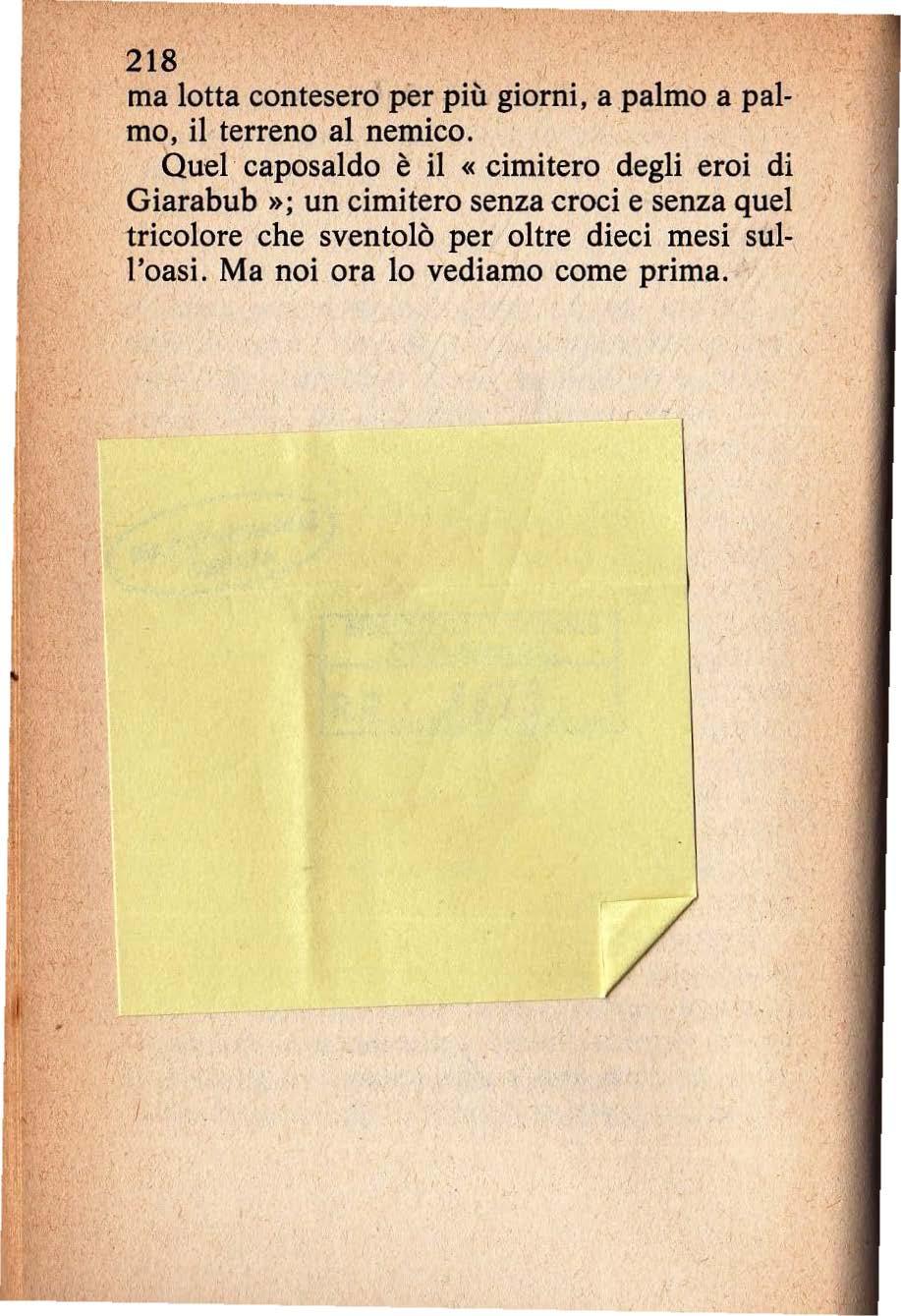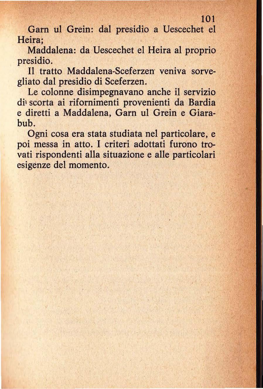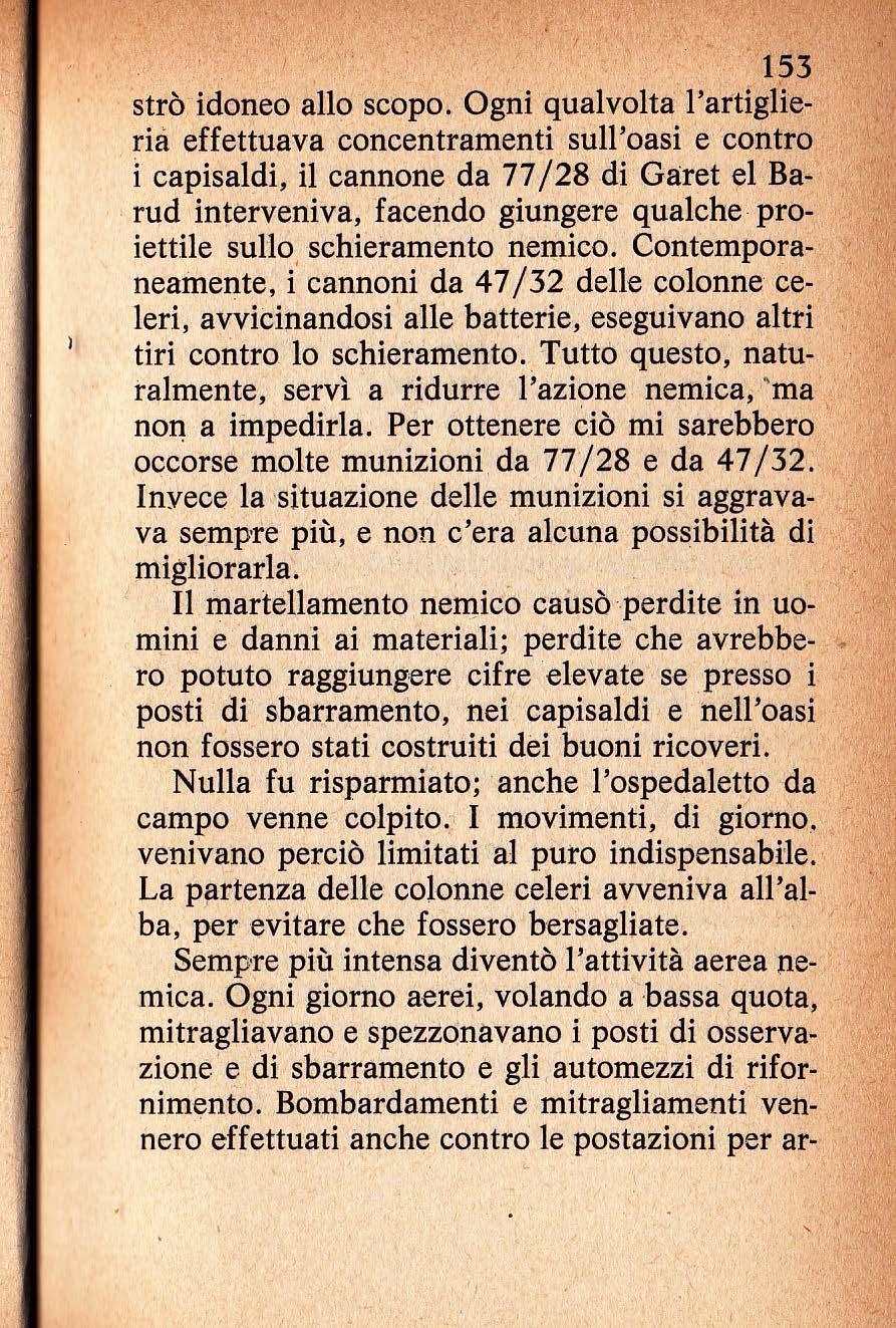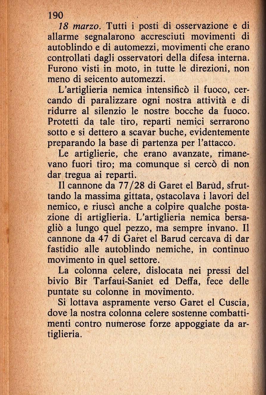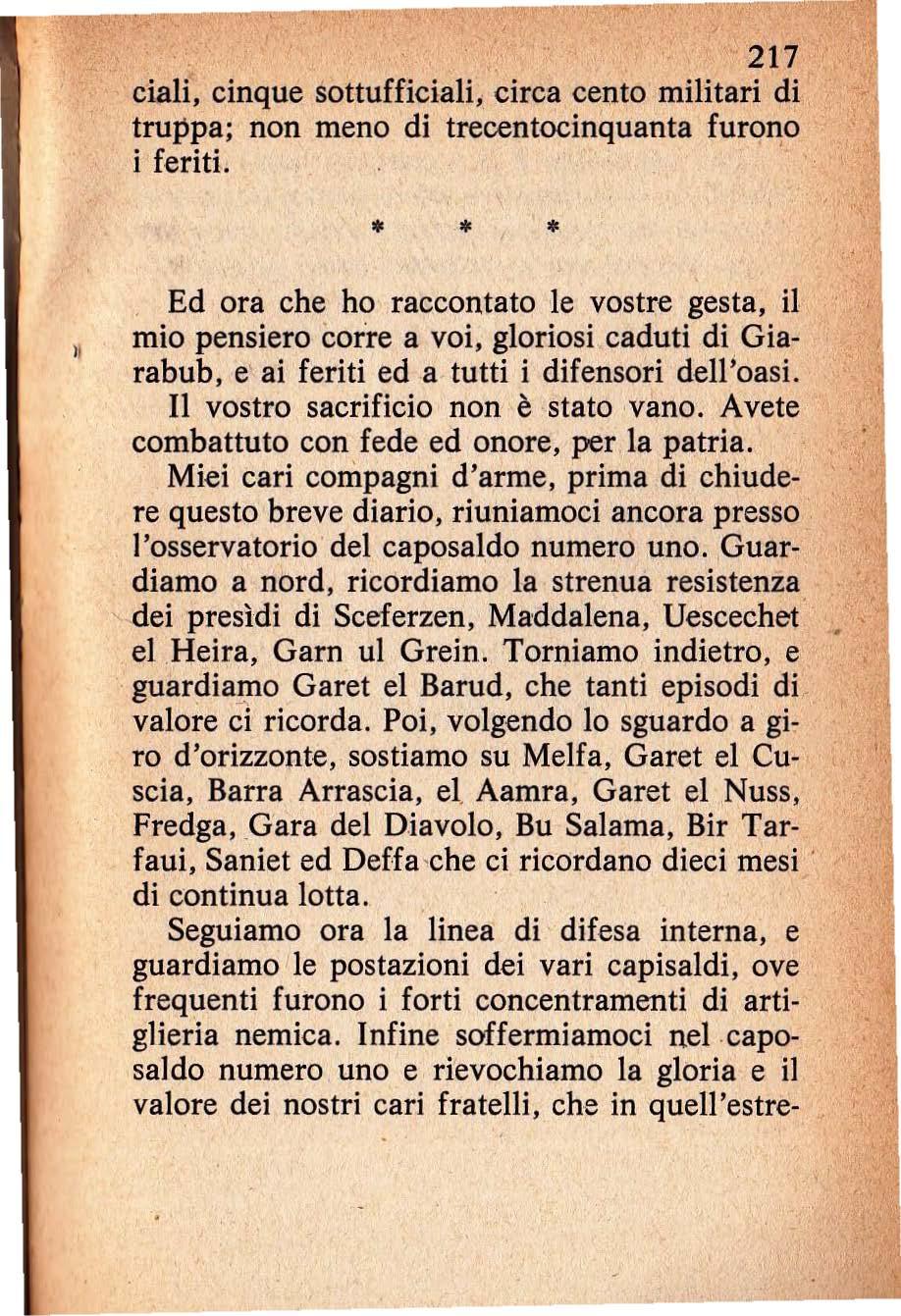 Miei cari compagni d'arme, prima di chiudere questo breve diario , riuniamoci ancora presso l'osservatorio ' del caposaldo numero uno . Guardiamo a nord , ricordiamo la strenua resistenza dei presìdi di Sceferzen , Maddalena , Uescechet el Heira , Garn ul Grein. Torniamo indie tro, e guardiap.o Garet el Barud, che tanti episodi di valore ci ricorda. Poi, volgendo lo sguardo a giro d 'orizzonte , sostiamo su Melfa, Ga~et el Cuscia, Barra Arrascia , el Aamra, Garet e! Nuss , Fredga , Gara del D.iavolo, Bu Salama , Bir Tarfaui, Saniet ed Deffa -che ci ricordano dieci mesi · di continua lotta .