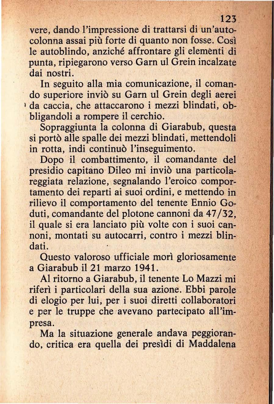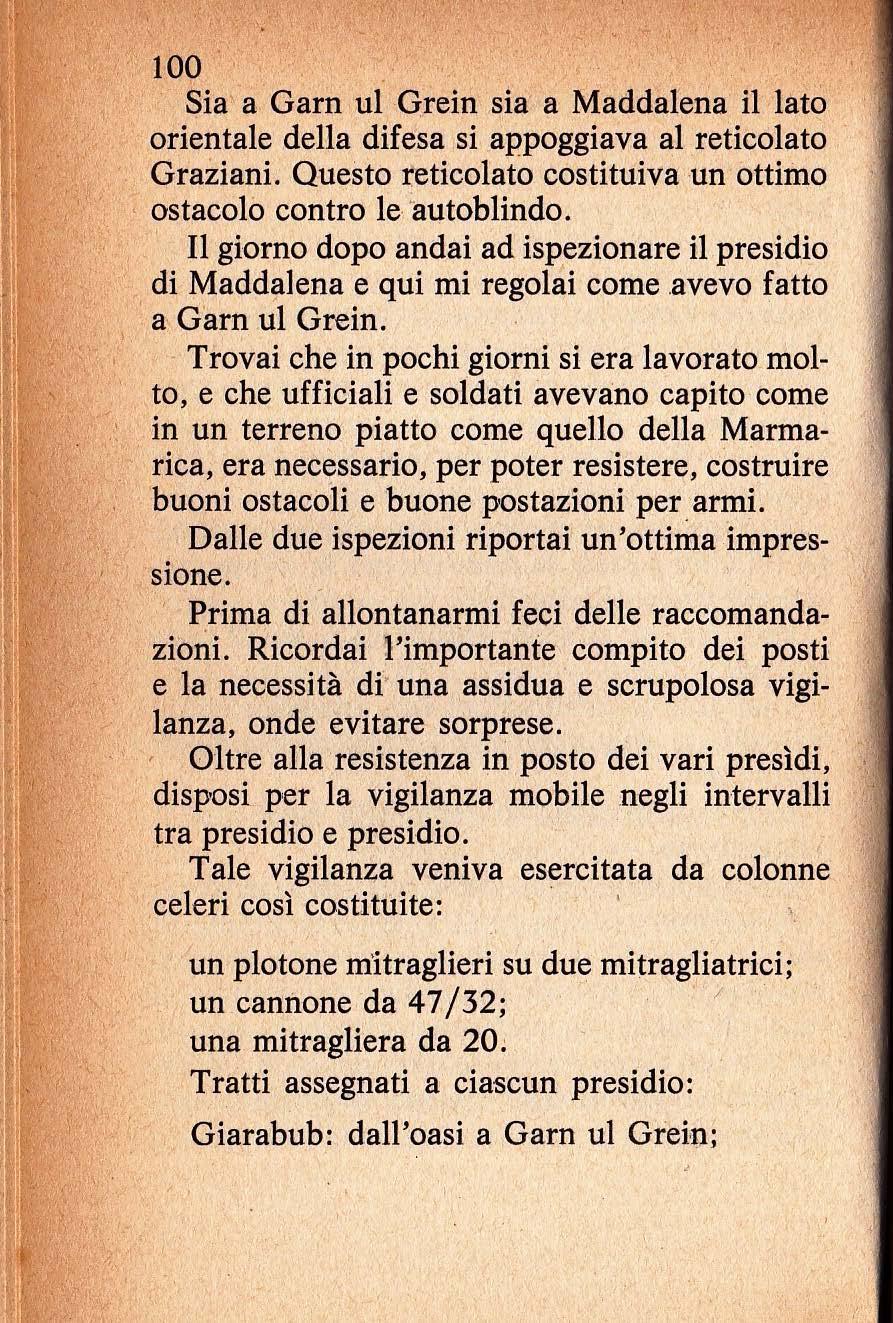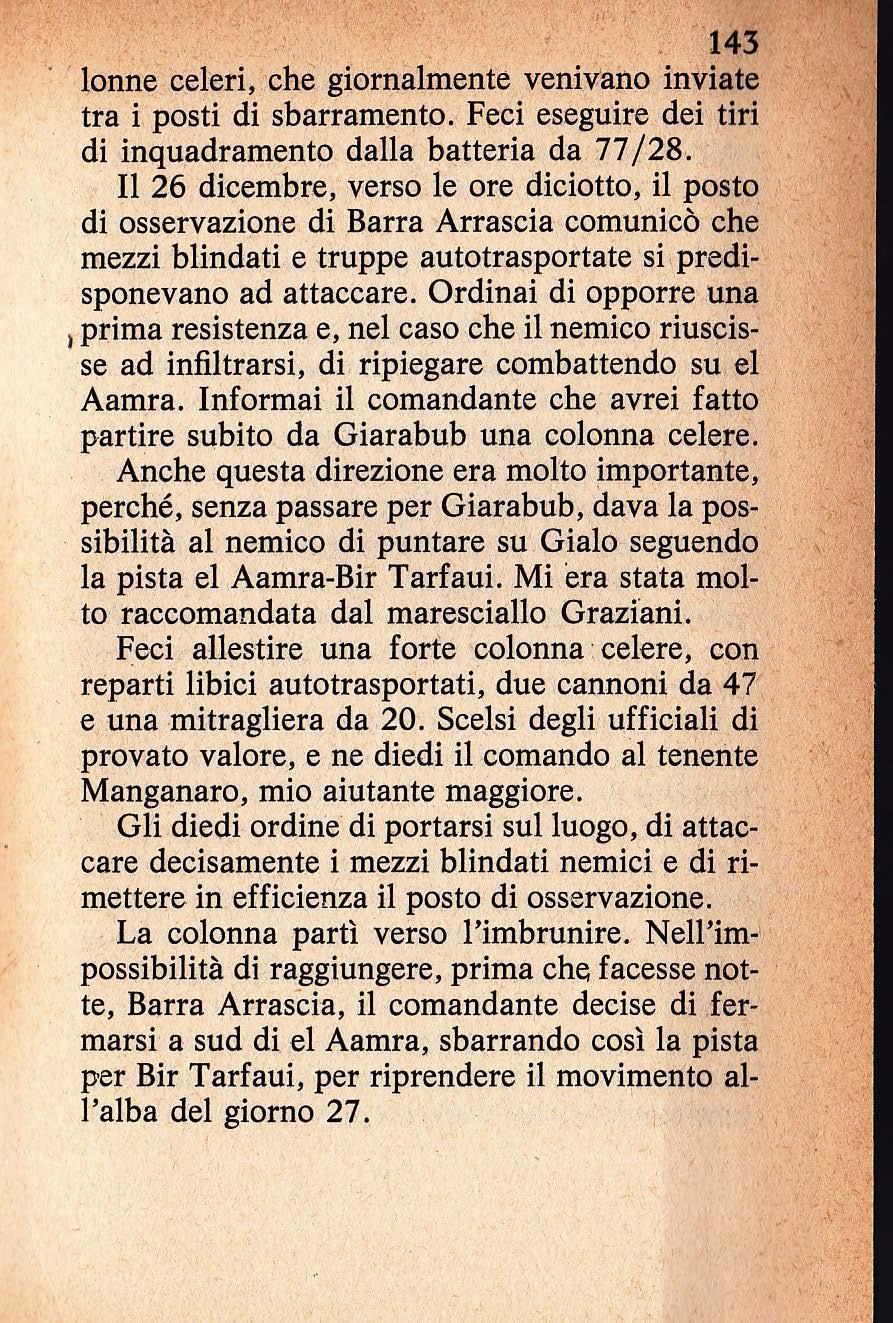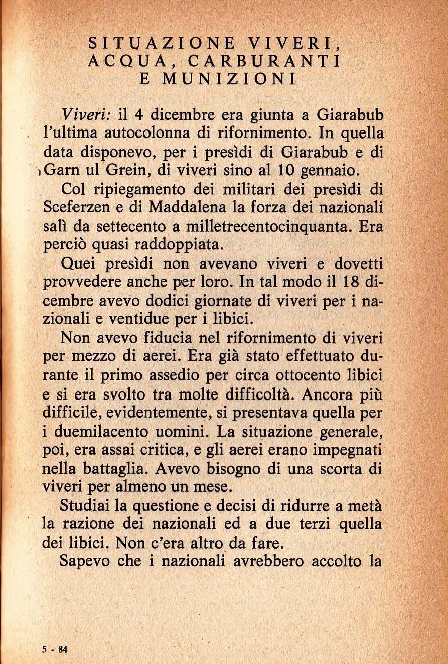 Così nessun accenno viene fatto sull'attacco notturno sferrato da autoblindo contro una nostra colonna di automezzi vuoti, scortata da pochi uomini, inviata da Giarabub a Maddalena per il ritiro dei materiali di quel presidio, attacco brillantemente respinto, che consentì ai nostri di giungere a destinazione.