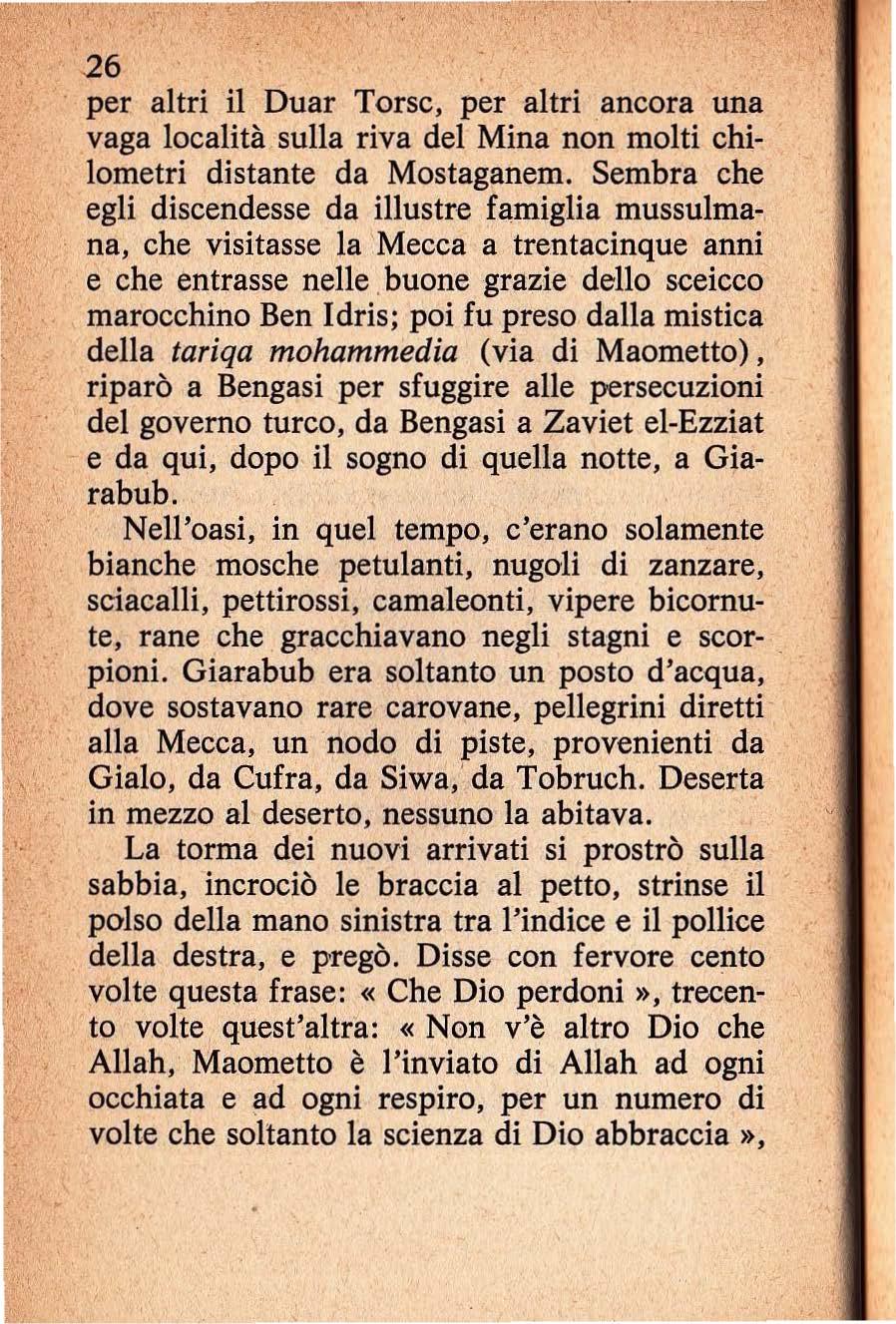 Raggiunse i discepoli con una carovana di mille cammelli, dopo av~r viaggiato giorni e giorni. Era il 1856. Il fondatore della nuova setta reUgiosa si chiamava Mohammed ibn Ali es-Senusi, aveva settant'anni. ·Pochi tra i suoi discepoli ne avevano mai visto la faccia più giù degli occhi, avvolta da un velo tutte le volte che egli usciva in mezzo agli uomini; pochi ne conoscevano il luogo di nascita, che per alcuni era Mazuna, dipartimento di Orano in Algeria,