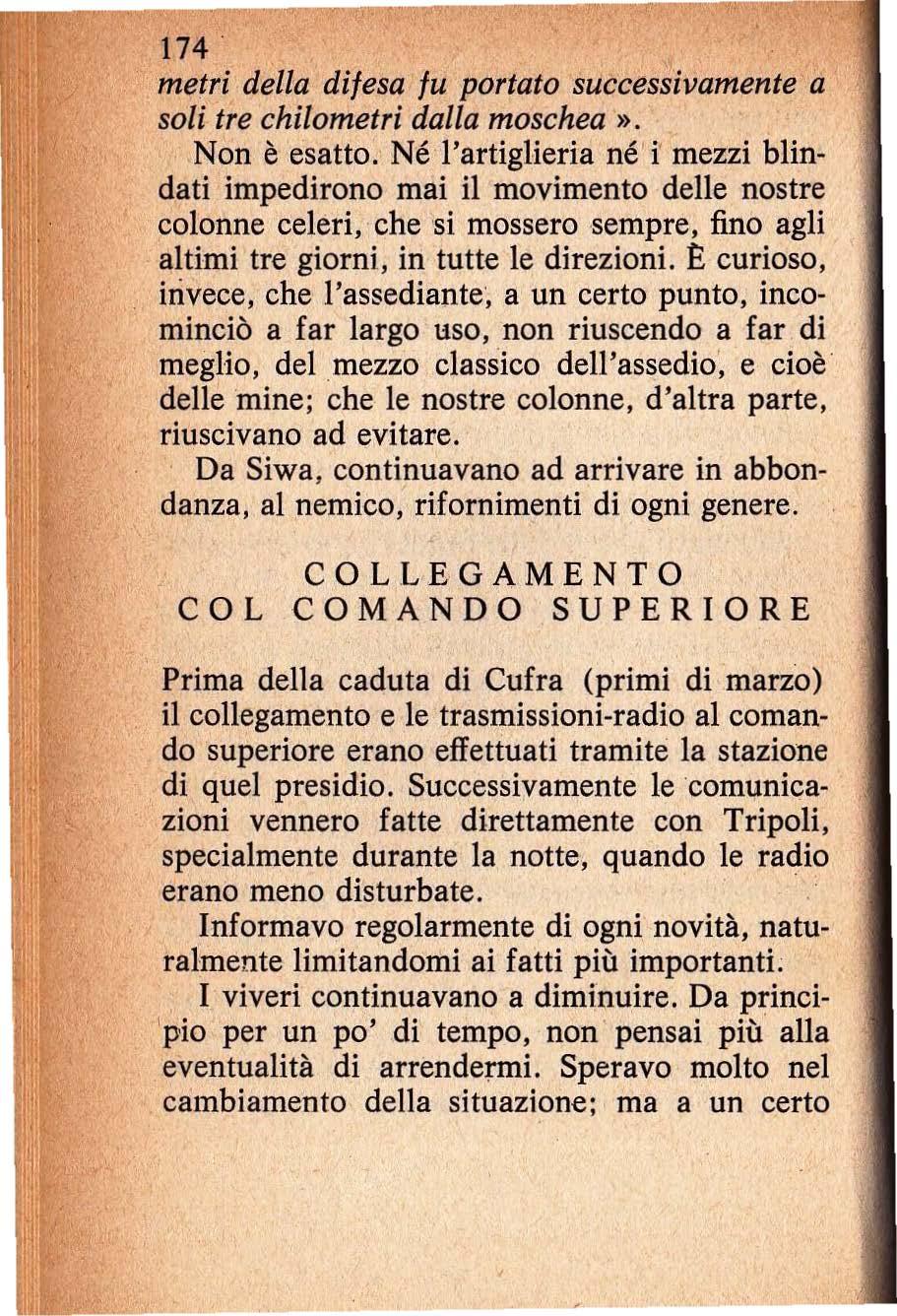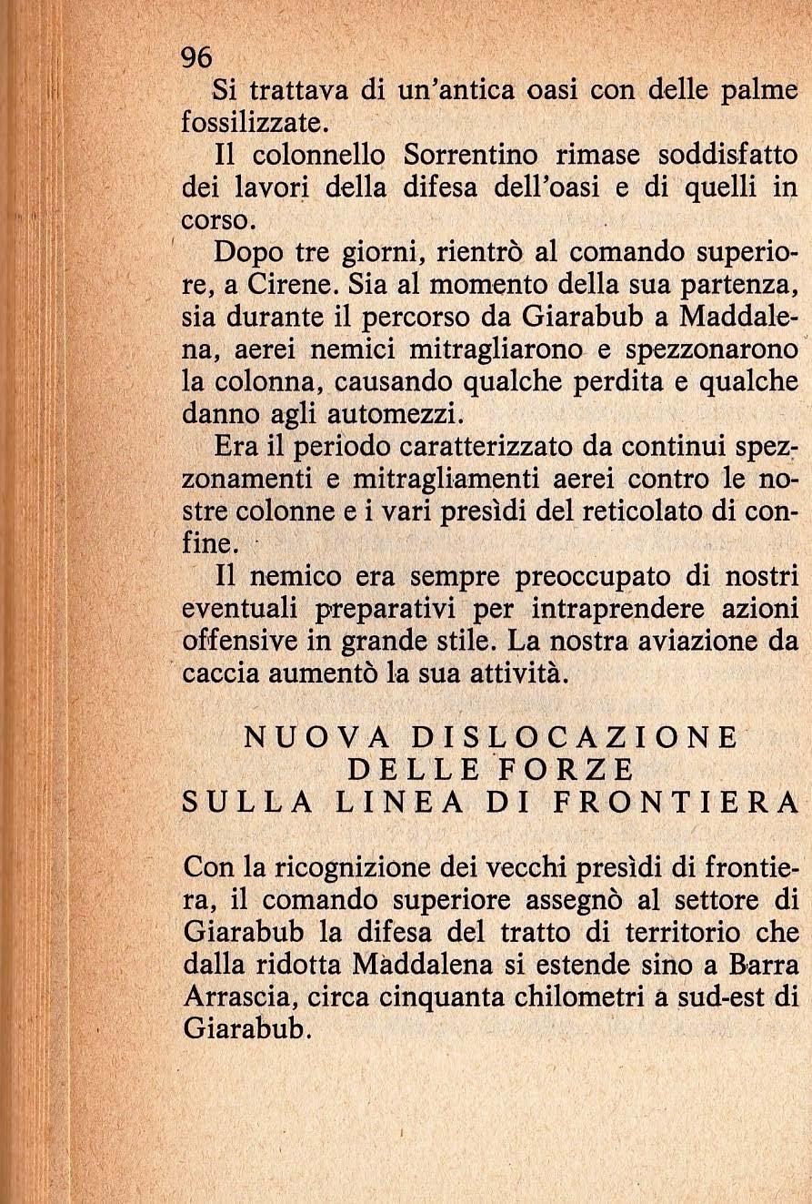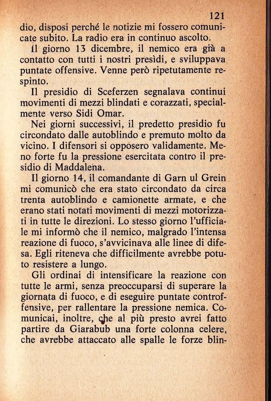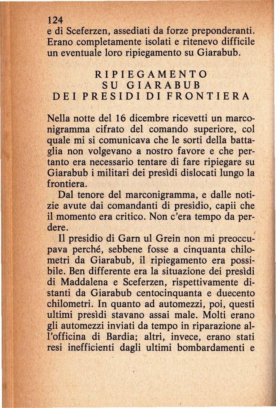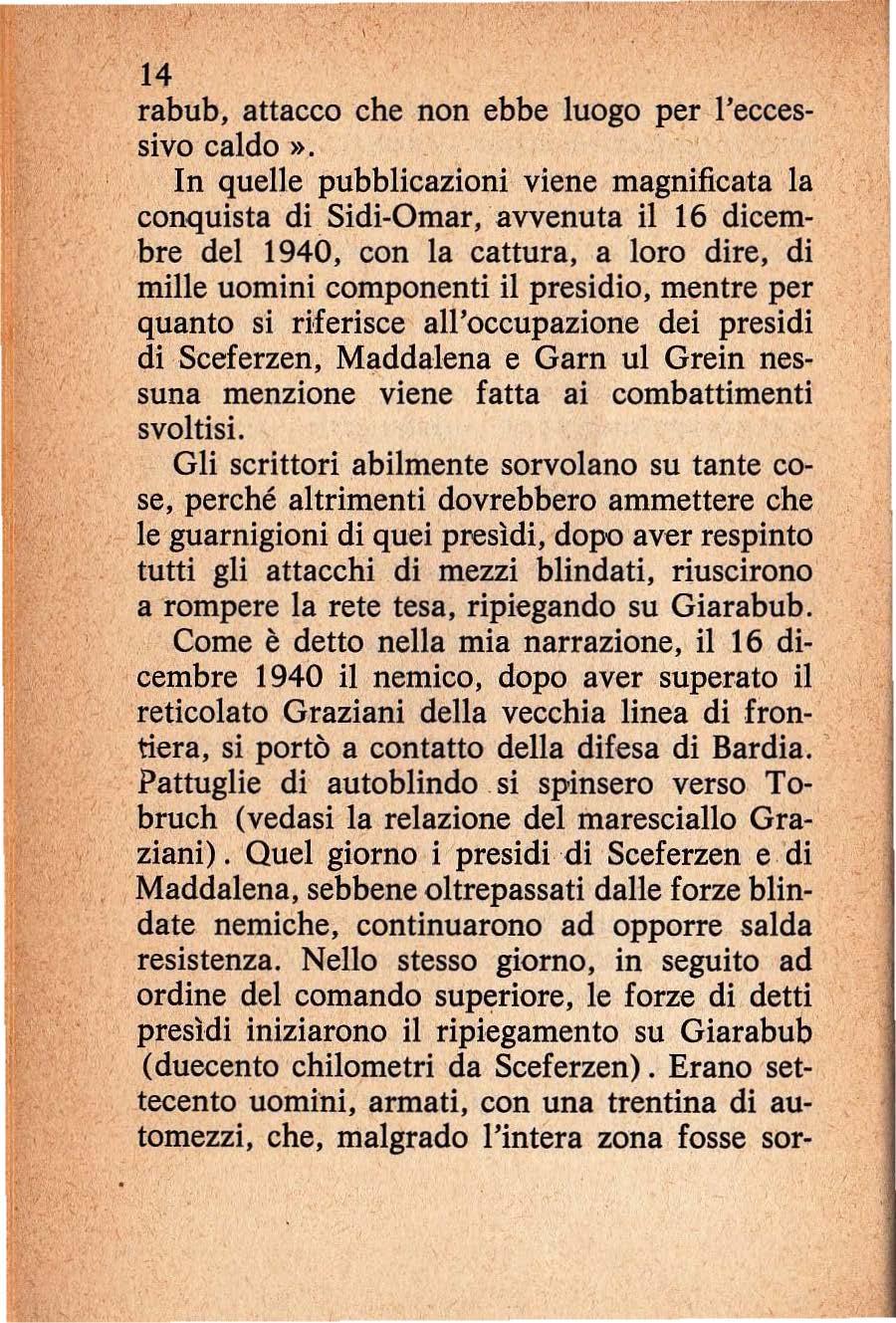 Gli scrittori abilmente sorvolano su tante cose, perché altrimenti dovrebbero ammettere che le guarnigioni di quei presìdi, dopo aver respinto tutti gli attacchi di mezzi blindati, riuscirono a rompere la rete tesa, ripiegando su Giarabub. Come è detto nella mia narrazione, il 16 dicembre 1940 il nemico, dopo aver superato il reticolato Graziani della vecchia linea di .frontiera, si portò a contatto della difesa di Bardia. Pattuglie di autoblindo . si spinsero verso Tobruch (vedasi la relazione del maresciallo Graziani) . Quel giorno i presidi di Sceferzen e 'di Maddalena, sebbene oltrepassati dalle forze blindate nemiche, continuarono ad opporre salda resistenza. Nello stesso giorno, in seguito ad ordine del comando superiore, le forze di detti presìdi iniziarono il ripiegamento su Giarabub (duecento chilometri da Sceferzen) . Erano settecento uomìni, armati, con una trentina di automezzi , che, malgrado l'intera zona fosse sor-