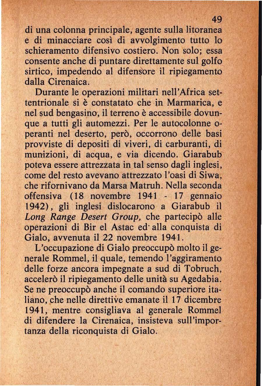 quattrocento automezzi , partirono da Giarabub per Bir el Atasc e poi puntarono su Gialo, che occupavano il 22 novembre 1941. Se ne preoccupò il nostro comando supremo, invitando il mart!sciallo Rommel, già impegn a to con la ma ssa delle sue forze a sud di Tobruch, a riprendere l'oasi di Gialo , onde assicurarsi il fianco destro.