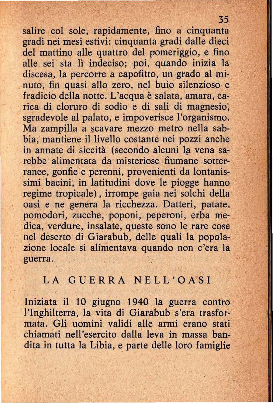 salire col sole, rapidamente , fino a' cinquanta gradi nei mesi estivi: cinquanta gradi dalle dieci del mattino alle quattro del pomeriggio, e fino alle sei sta lì indeciso; -poi, quando inizia la discesa, la percorre a capofitto, un grado al minuto , fin quasi allo zero, nel buio silenzioso e fradicio della notte. L ' acqua è salata, amara, tàrica di cloruro di sodio e di sali di magnesio; sgr adevole al palato , e impoverisce l'organismo, Ma zampilla a scavare mezzo metro nella sabbia , mantiene il livello costante nei pozzi anche in annate di siccità (secondo alcuni l!l vena -sarebbe ' alimentata da misteriose fiumane sotterranee , gonfie e perenni , provenienti da lontanissimi bacini , fn latitudini dove le piogge hanno regime tropicale) , irrompe gaia nei solchi della oa si e ne genera la ricchezza. Datteri , patate , pomodori, zucche, poponi, peperoni , erba medica, verdure, insalate , queste sono le rare cose nel deserto di Giarabub , delle quali la popolazione locale si alimentava quando non c'era la guerra .