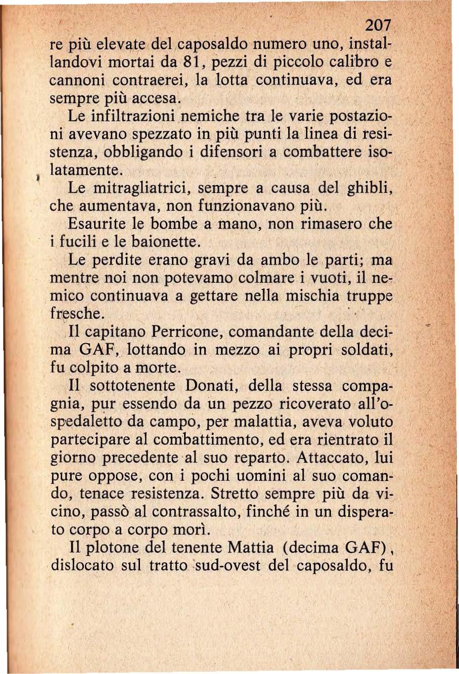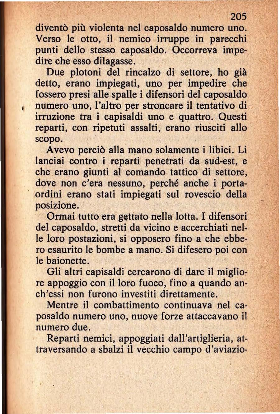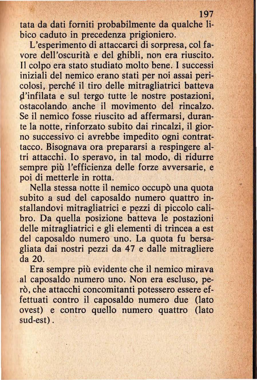 Lasciando il caposaldo numero uno vidi che il nemico irrompeva negli altri capisalqi, anche dal tergo . I nostri, però, si difesero per oltre tre ore , passando spes so al contra ssalto, mentre il