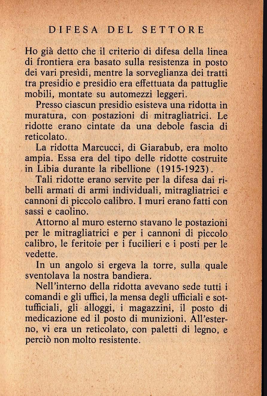 La ridott a Marcucci, che sorgeva fuori della zauia, sopra una piccola gobba del, terreno, con l'atrio coperto di rami di palme che creano l'ombra e lasciano passare l ' aria, era stata evacuata. Essa avrebbe costituito un obbiettivo troppo facilmente individuabile e vulnerabile sia da1le artiglierie nemiche, sia dal bombardamento aereo. Erano stati sgombrati gli uffici, i magazzini , le camere dove in tempo di pace dormivano gli ufficiali. Nella ridotta era rimasta soltanto la bandiera, che una sentinella vigilava in armi notte e giorno, sull'alta torre merlata.
