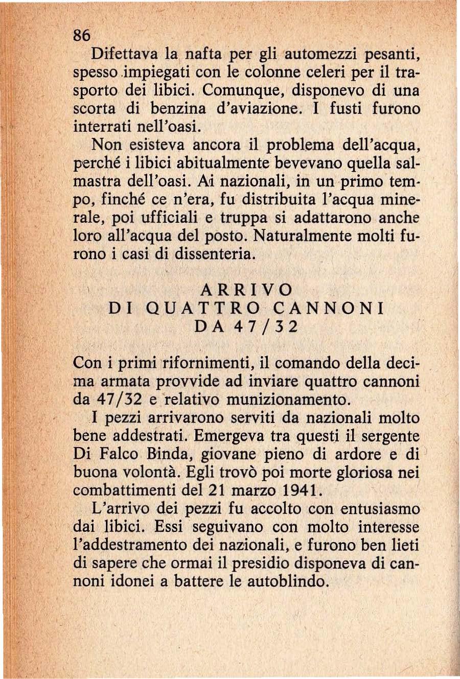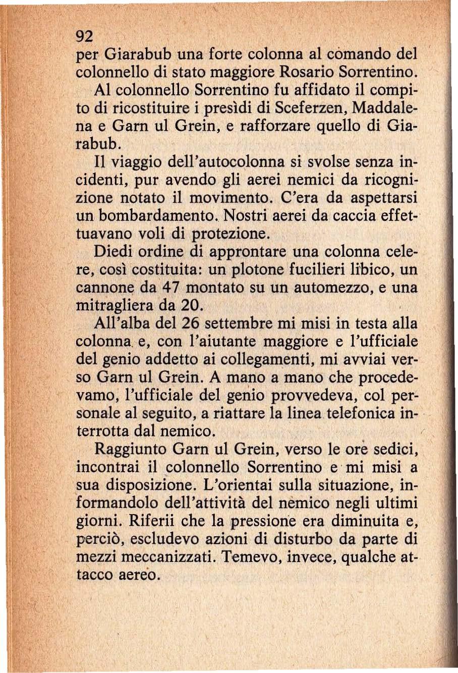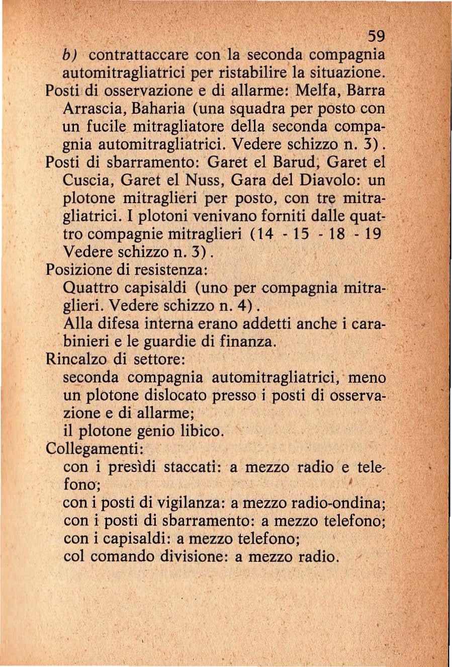 Contro i repar ti che ag ivano alle spalle erano impegnati il sottotenente Di Vincenzo, comandante di un plotone della settima GAF, ed i tenenti Manganare , Cribari e Rossett , a mia disposizione. Sul lato est erano. invece i tenenti. Farfaglia, Savino e Messina. Contro le forze penetrate nell'interno del caposaldo operavano i libici.