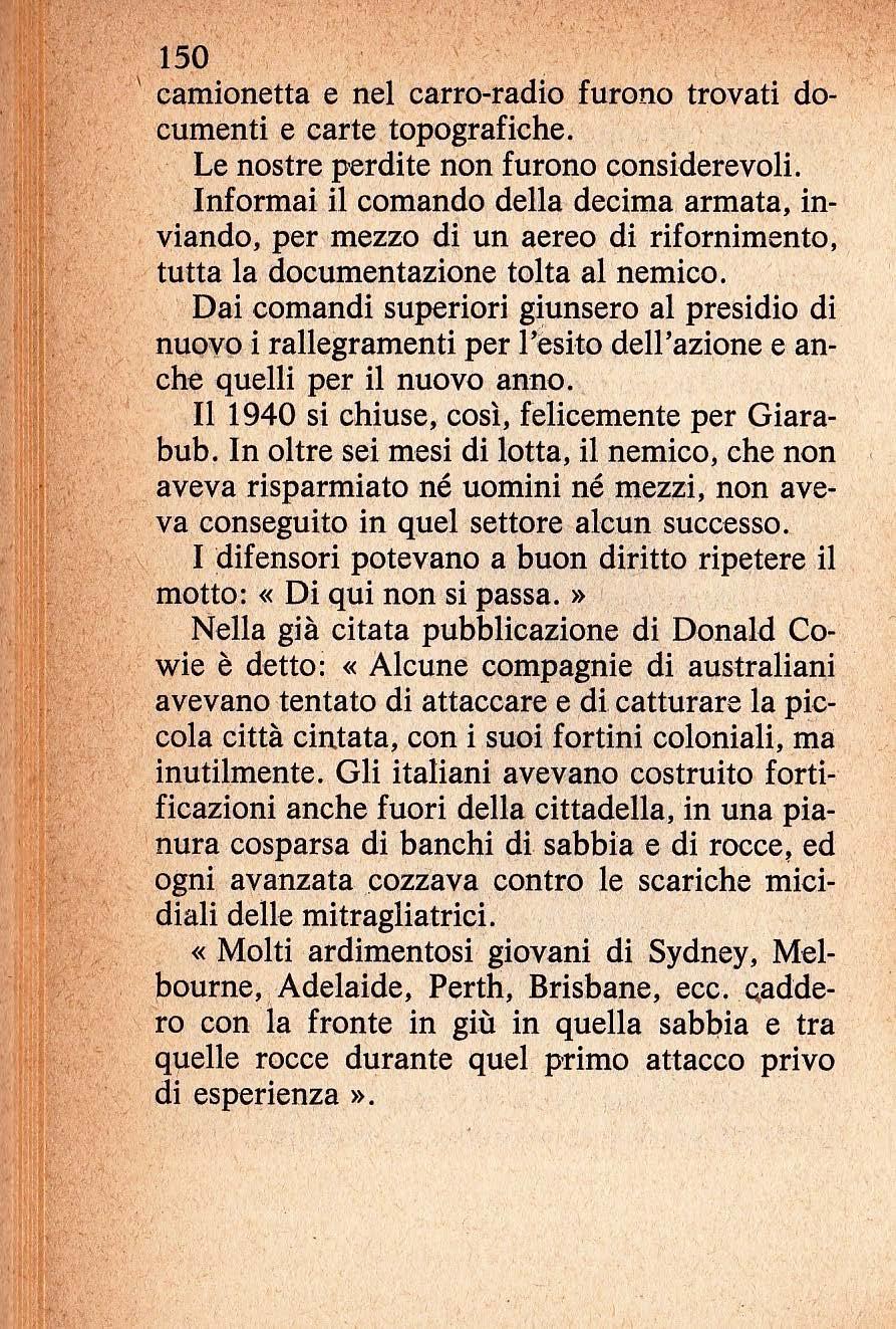 Per la parte che mi riguarda direttamente, cioè la difesa di Giarabub, alcuni scrittori hanno cavallerescamente ammesso che, nell'ultimo periodo d'assedio (12 dicembre 1940 - 21 marzo 1941) reparti australiani effettuavano violenti infruttuosi attacchi intesi a sopr;3ffare la resistenza dell'oasi.