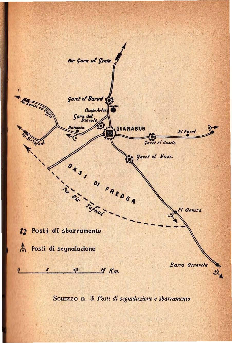 L'organizzazione difensiva dell'oasi comprendeva :. posti di osservazione e di allarme; posti di sbarramento; una postazione di difesa attorno alla zauia, suddivisa in capisaldi di compagnie · (perimetro quattro chilometri) .