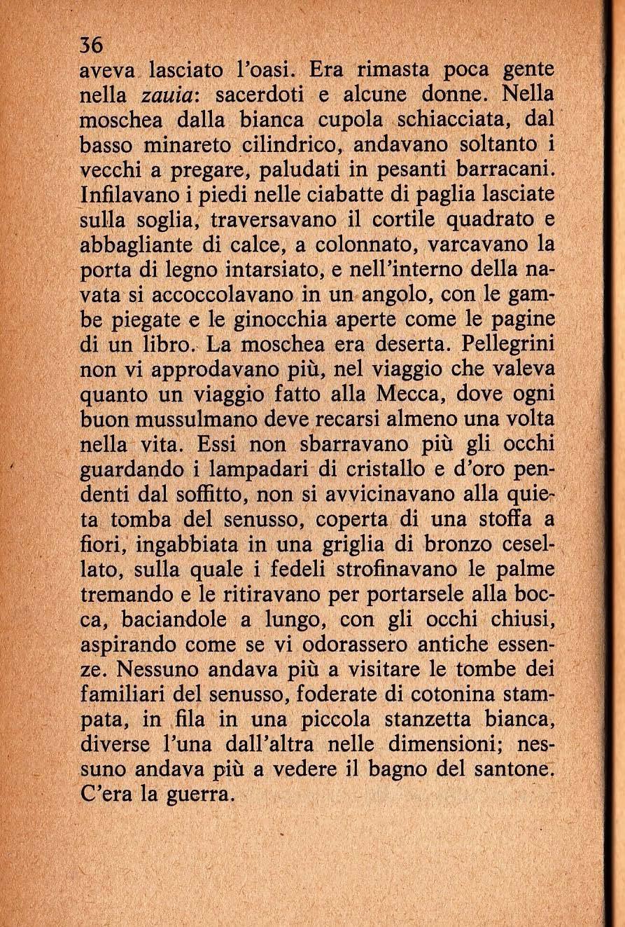 aveva . lasciato l'oasi. Era rimasta poca gente nella zauia: sacerdoti e alcune donne. Nella moschea dalla bianca cupola schiacciata, dal · basso minareto cilindrico, andavano soltanto i vecchi a pregarè, paludati in pesanti barracani. Infilavano i piedi nelle ciabatte di paglia lasciate s u1\a soglia, traversavano il cortile quadrato e abbagliante di calce, a colonnato , varcavano la porta di legno intarsiato, e nell'interno della navata s _ i accoccolavano in un -angqlo , con le gambe piegate e le ginocchia aperte comè le pagine di un libro. - La moschea era deserta. Pellegrini non vi approdavano più , nel viaggio che valeva quanto un viaggìo fatto alla Mecca, dove ogni buon mussulmano deve ,recarsi almeno una volta nella vita. Essi non sbarravano più gli occhi guardando i lampadari di cristallo e d'oro pendenti dal soffitto, non si avvicinavano alla quie, ' ta tomba del senusso, coperta _ di una stoffa a fiori ,' ingabbiata in una griglia di bronzo cesel- , lato, sulla quale i fedeli ·strofinavano le palme tremando e le ritiravano per portarsele alla bocca , baciandole a lungo, con gli occhi chiusi, aspirando come se vi odorassero antiche essenze. Nessuno andava più a visitare le tombe dei familiari del senusso, foderate di cotonina stampata , in ,fila in una piccola stanzetta bianca, diverse l'una dall'altra nelle dimensioni; nessuno andava più a vedere il bagno del santon e . C'era la guerra . ·