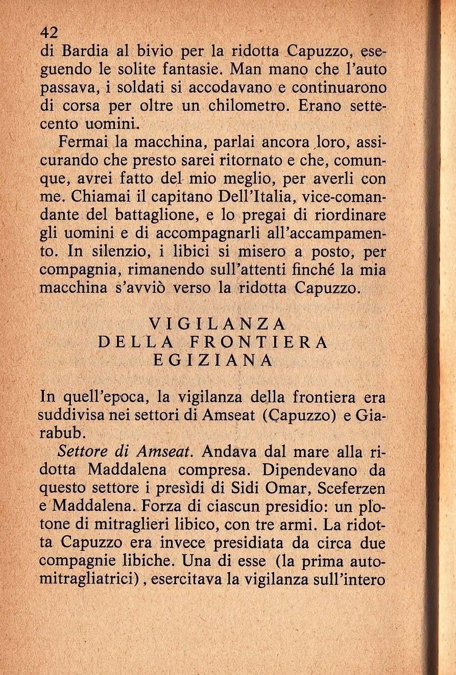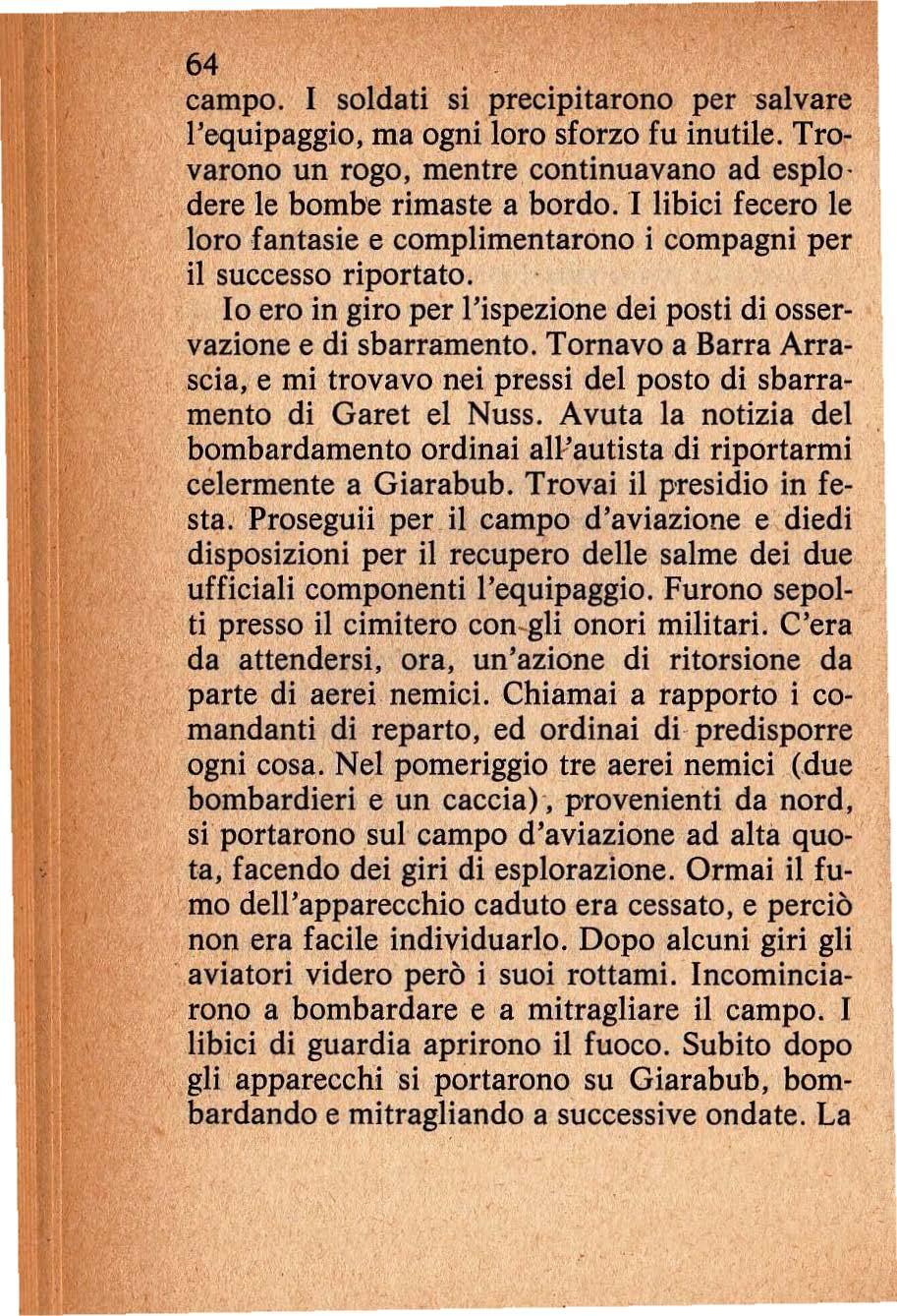 Rinunciai, quindi, ripromettendomi di far ciò al mio rimpatrio. I favorevoli avvenimenti militari del 1941, facevano prevedere prossima la fine delle ostilità, speravo di rimpatriare presto, e di ritornare in Giarabub. Attendevo tale gior-