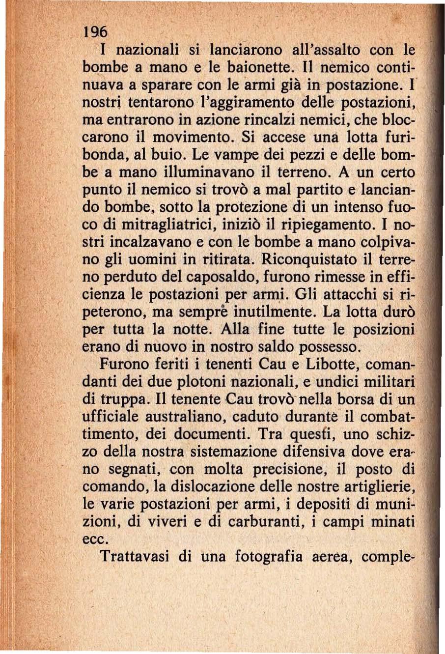 « L'aereo si rese poi protagonista di un 'altra azione di cooperazione ancora più notevole. Lo obbiettivo, un centinaio di mitragliatrici e di fu. ciii italiani , era costantemente controllato e sorvolato come da uno sciocco e ostinato uccello sopra i combattenti. Alla fine l'aereo gettò un messaggio agli australiani , avvertendo che una dozzina di loro stava per essere accerchiata e