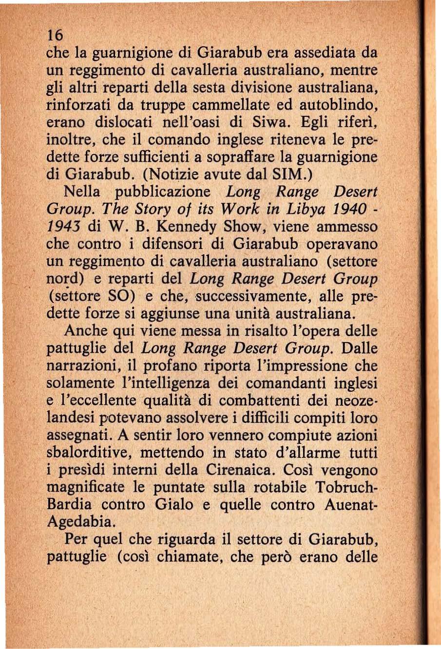 Nella pubblicazione Long Range Desert Group. The Story of its Work in Libya 19401943 di W . B. Kennedy Show, viene ammesso che contro i difensori di Giarabub operavano un reggim ento di cavalleria australiano (settore nord) e reparti del Long Range Desert Group (séttore SO) e che, successivamente, alle preqette forze si aggiunse una unità australiana.