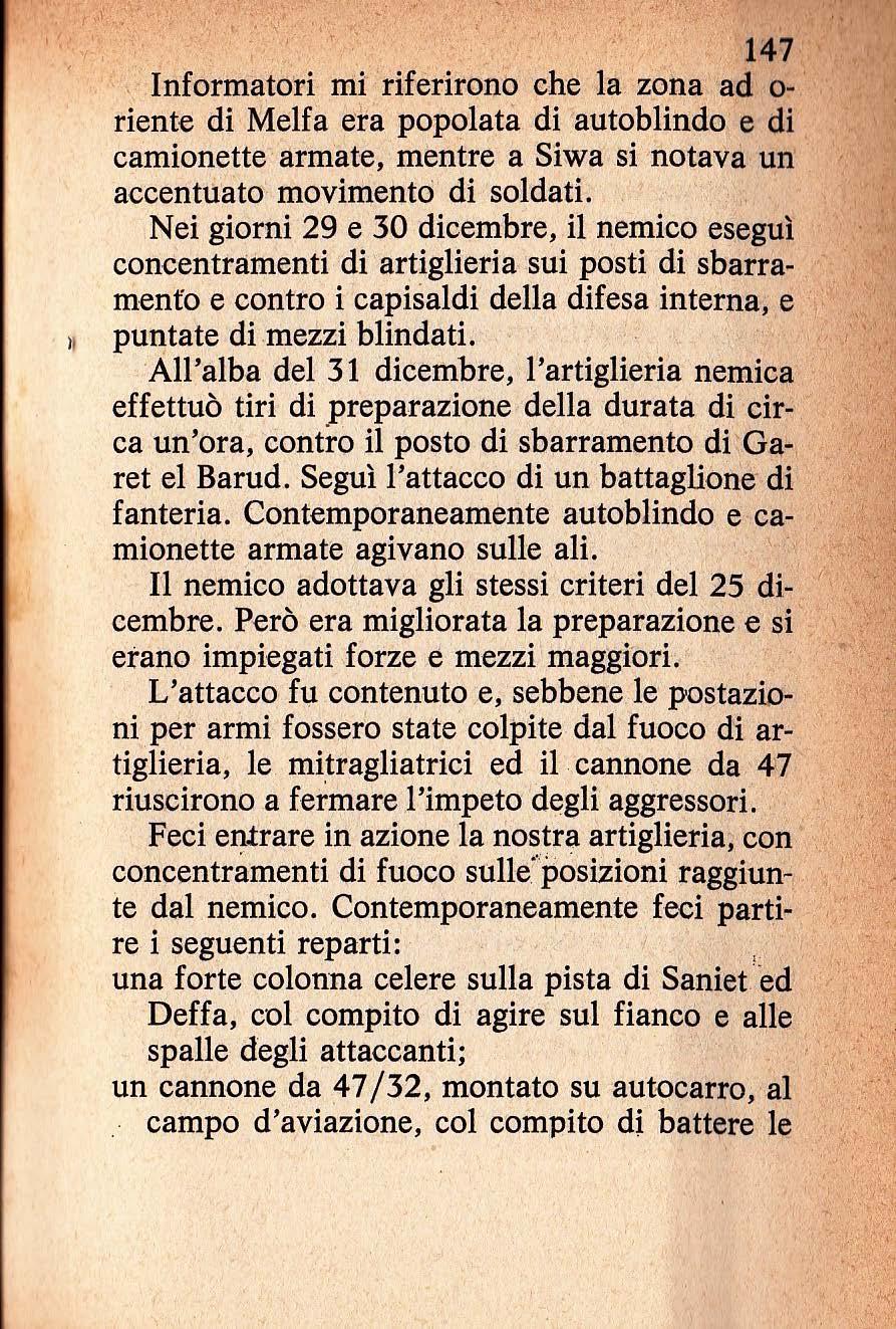 Ho già detto precedentemente che , dopo la seconda intimazione di resa, il nemico sferrò consistenti attacchi intesi a penetrare nel nostro sistema difensivo , attacchi nettamente respinti dal posto di sbarramento di Garet el Cuscia e dalle colonne celeri.