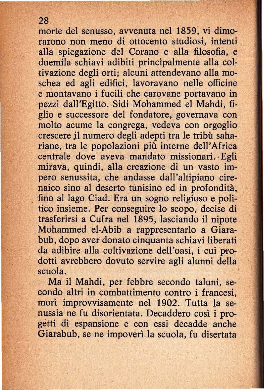 morte del senusso, avvenuta nel 1859, vi dimorarono non meno di ottocento studiosi, intenti alla spiegazione del Corano e alla filosofia, e duemila schiavi adibiti principalmente alla coltivazione degli orti; alcuni attendevano alla moschea ed agli edifici, lavoravano nelle officine e montavano i fucili che carovane portavano in pezzi dall'Egitto. Sidi Mohammed el Mahdi, figlio e successore del fondatore, governava con molto acume la congrega , vedeva con orgoglio crescere j! numero degli adepti tra le tribù sahariane, tra le popolazioni più interne dell'Africa centrale dove aveva mandato missionari. , Egli mirava , quindi, alla creazione di un vasto impero senussita, che andasse dall ' altip iano cirenaico sino al deserto tunisino ed in profondità, . fino al lago Ciad . Era un sogno religioso e politico insieme. Per conseguire lo scopo , decise di trasferirsi a Cufra nel 1895 , lasciando il nipote Mohammed el-Abib a rappresentarlo a Giarabub , dopo aver donato cinquanta schiavi liberati da adibire alla coltivazione dell 'oasi, i cui prodotti avrebbero ·dovuto servire agli alunni della scuola .