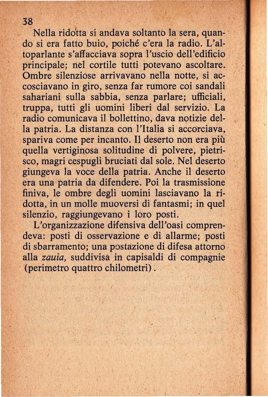 Nella riddtta si andava soltanto la sera, quan- · do si era fatto buio, pojché c'era la ' radio. L'altoparlante s'affacciava sopra l'uscio dell'edificio principale; riel cortile tutti potevano ascoltare. Ombre silenziose arrivavano nella notte, si accosciavano in giro, senza fa'.r rumore coi sanda)i sahariani sulla sabbia, senza parlare; ufficiali, truppa, tutti gli uomini liberi dal servizio . La radio comunicava il bollettino, dava nç,tizie della patria. La distanza con l'Italia si accorciava, spariva come per incanto . Il deserto non era più quella ve1'tiginosa solitudine di polvere, pietrisco, magri cespugli bruciati da.J sole. Nel deserto · giungeva la voce della patria . Anche il deserto era una patria da difendere. Poi la trasmissione finiva, le ombre degli uomini lasciavano la ridotta, in un molle muoversi di fantasmi; in quel silenzio, raggiungevano i loro posti.