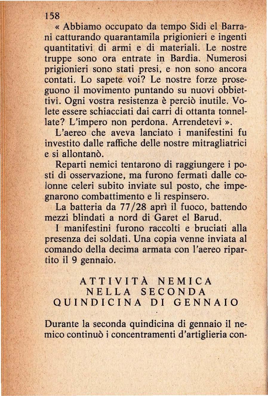 In quelle pubblicazioni viene magnificata la conquista di Sidi-Omar ," avvenuta il 16 dicembre del 194Ò, con la cattura, a loro dire, di mille uomini componenti il presidio, mentre per quanto si riferisce all'occupazione dei presidi di Sceferzen, Maddalena e Garn ul Grein nessuna menzione viene fatta ai combattimenti svoltisi.