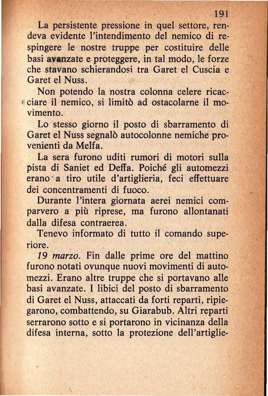 Gli inglesi, che in precedenza erano perfettamente al corrente di quanto avveniva nelle nostre linee, nulla sapevano, nella seconda decade di marzo, dell'imminente offensiva del maresciallo Rommel. Se ne fossero stati a conoscenza, certamente avrebbero fatto affluire sulla costa molte delle predette forze, per arginare l'impetuosa controffensiva . In tal caso, avrei agito con ·colonne celeri verso Gialo, agevolando le nostre colonne provenienti da Marada.