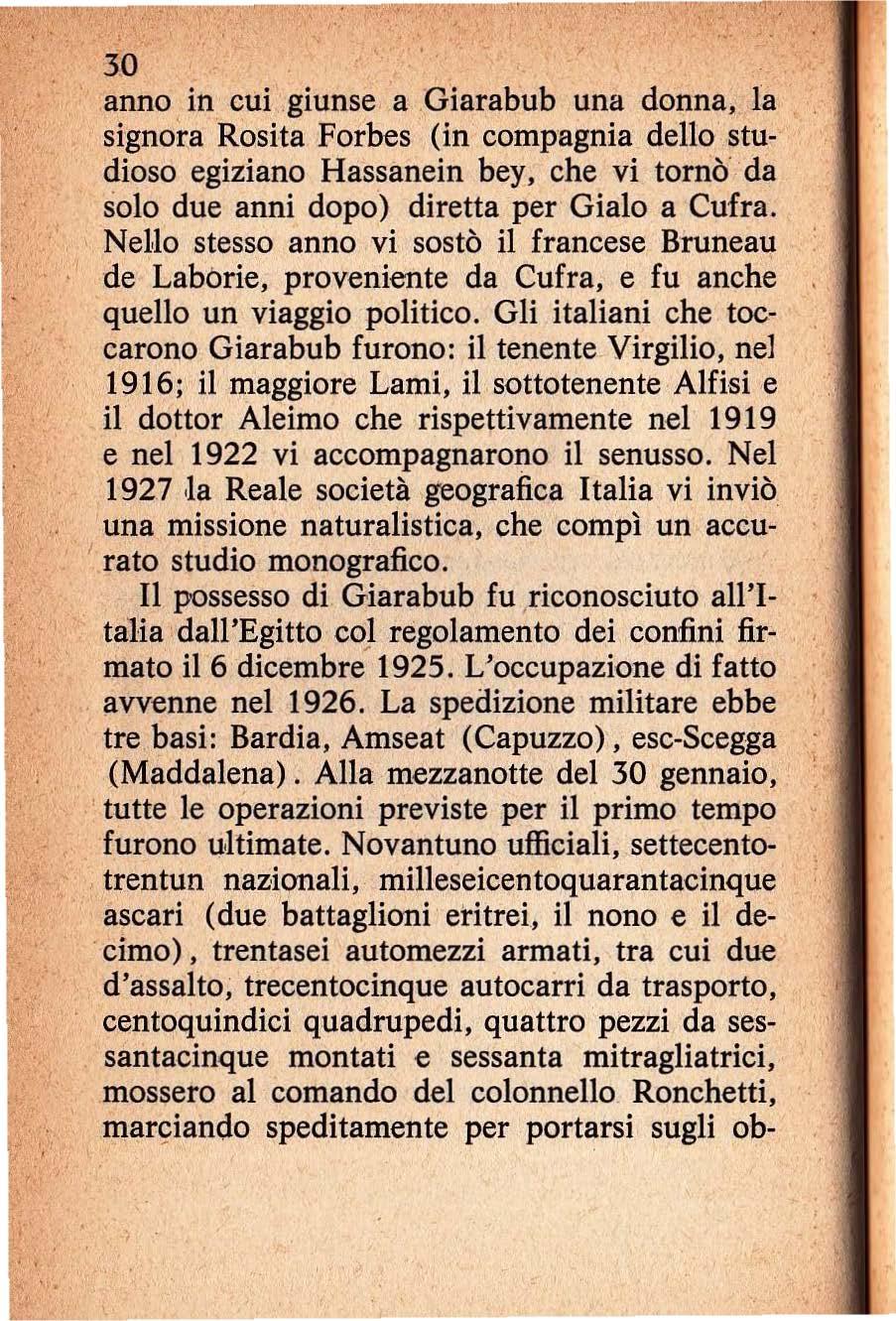 anno in cui giunse a Giarabub una donna, la signora Rosita Forbes (in compagnia dello studioso egiziano Hassanein bey, che vi tornò· da solo due anni dopo) diretta per Gialo a Cufra . Nello stesso anno vi sostò il fran cese Bruneau de Labòrie, proveniente da Cufra , e fu anche quello un viaggio politico . Gli italiani che toccarono Giarabub furono : il tenente Virgilio , nel 1916; il maggiore Lami, il sottotenente Alfis i e il dottor Aleimo che rispettivamente nel 1919 e nel 1922 vi accompagnarono il senus so. Nel 1927 ,la Reale società geografica Italia vi inviò una missione naturalistica, che compì un accurato studio monografico . Il possesso di Giarabub fu ,riconosciuto all ' 1talia dall'Egitto coJ regolamento dei confini firmato il 6 dicembre 1925. L' occupazione di fatto avvenne nel 1926 . La spedizione militare ebbe tre basi: Bardia , Amseat (Capuzzo) , esc-Scegga (Maddalena) . Alla mezzanotte del 30 gennaio, tutte le operazioni prev iste per il primo tempo furono ultimate. Novantuno ufficiali , settecentotrentun na:z;ionali , milleseicentoquarantacinque ascari (due battaglioni eritrei, il nono e il decimo) , trentasei automezzi armati, tra cui due d ' assalto, trecentocinque autocarri da trasporto , centoquindici quadrupedi, quattro pezzi da sessantacinque montati e sessanta mitragliatrici, mossero al comando del colonnello Ronchetti , marçiando speditamente per portarsi sugli ob-