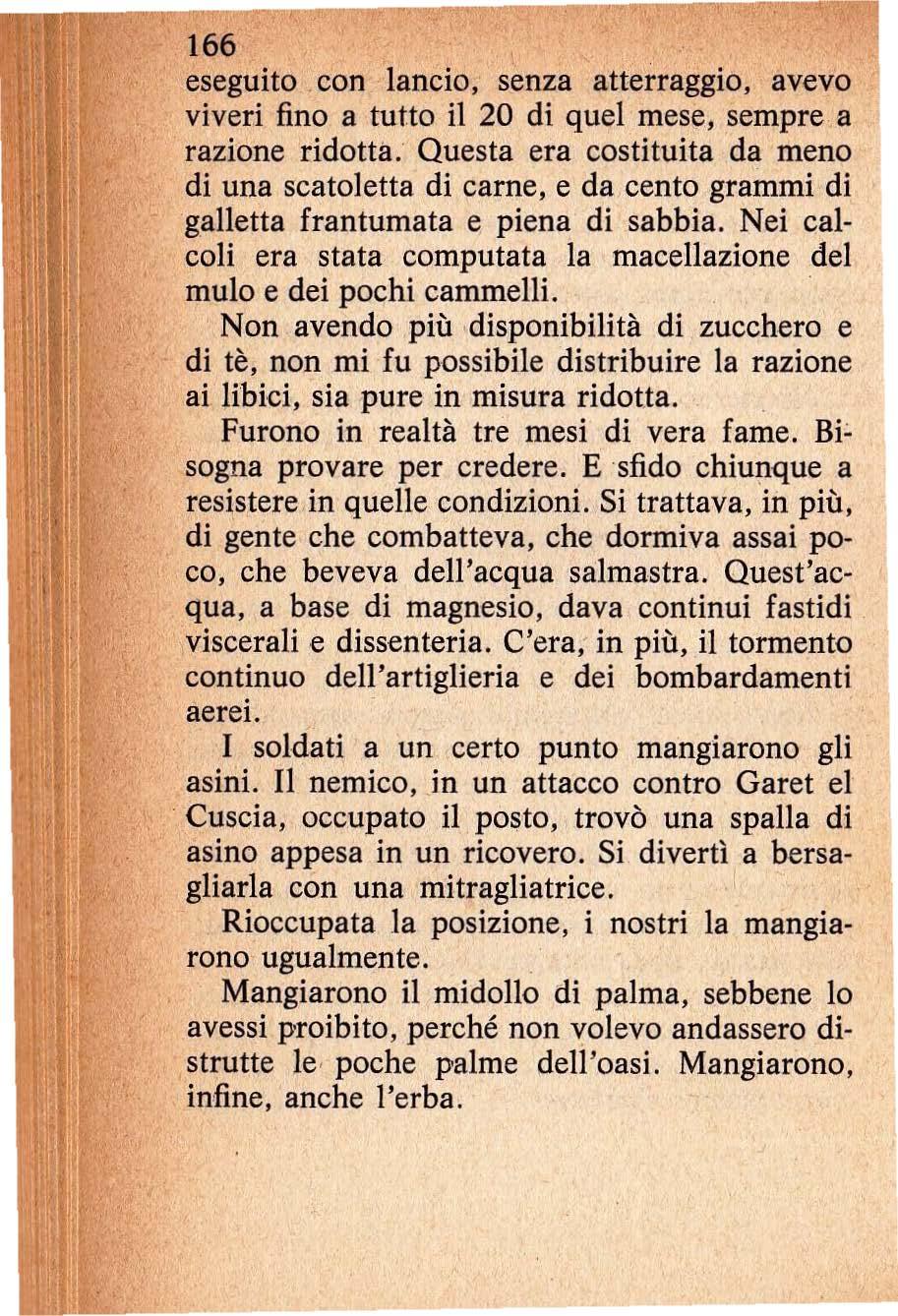 Al Cairo , durante il mio interrogatorio, l ' ufficiale inglese, ebbe a dirmi che i sacrifici fatti erano stat i vani, perché mai saremmo riusciti a liberarci dalla tenaglia delle forze britanniche . Mi limitai a rispondere di aver voluto dimostrare ancora una volta che le insinuazioni di radio-Londra contro il soldato italiano erano prive di fondamento, e che nessun soldato al ·mondo può eguagliarlo in spirito di sacrificio, valore e sentimento del dovere. Dopo di che l'ufficiale inglese disse : « Noi non concepiamo una resistenza senza i mezzi necessari; a voi non solo mancava tutto, ma non avevate ne ssuna possibilità di successo ».
