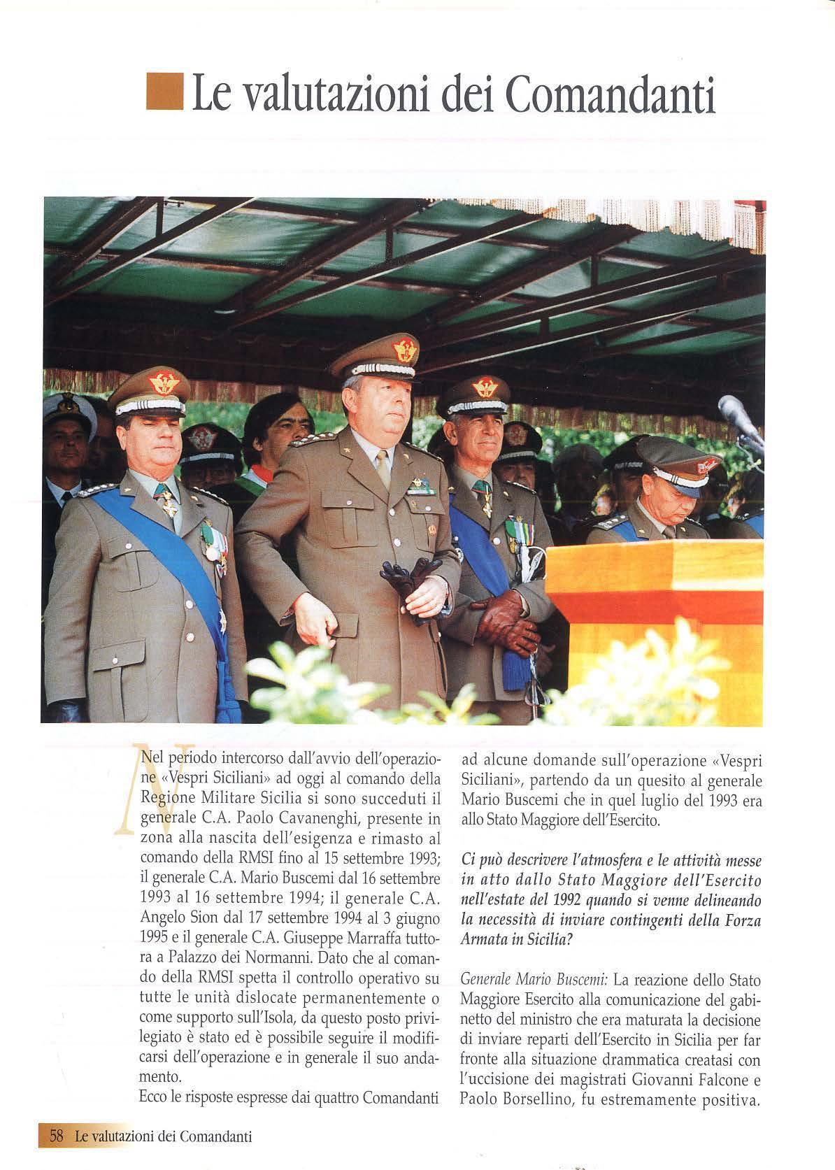 In conclusione, i rappresentanti del popo lo e delle Istituzioni, e in par ticolare la Magistratura palermitana e la popolazione tutta hanno riconosciuto e riconos cono la grande va lenza dell'impiego dei militari dell'Esercito in concorso con tutte le altre Forze istituzionali, politiche e sociali, in questa dura lotta contro la criminalità organizzata che affligge l'Isola e di questo tutti noi appartenenti all'Es ercito siamo orgogliosi» .