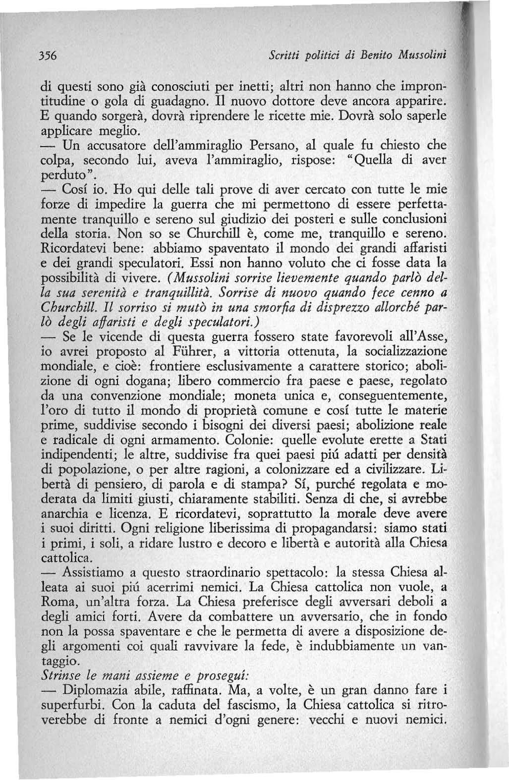 - Se le vicende di questa guerra fossero state favorevoli all'Asse, io avrei proposto al Fiihrer, a vittoria ottenuta, la socializzazione mondiale, e cioè: frontiere esclusivamente a carattere storico; abolizione di ogni dogana; libero commercio fra paese e paese, rego1ato da una convenzione mondiale; moneta unica e, conseguentemente, l'oro di tutto il mondo di proprietà comune e co sl tutte le materie prime, suddivise secondo i bisogni dei diver si paesi; abolizione reale e radicale di ogni armamento. Colonie: quelle evolute erette a Stati indipendenti; le altre, suddivise fra quei paesi piu adatti per densità di popolazione, o per altre ragioni, a colonizzare ed a civilizzare. Libertà di pensiero , cli parola e cli stampa? Si, purché regolata e moderata da limiti giusti, chiaramente stabiliti. Senza cli che, si avrebbe anarchia e licenza. E ricordatevi, soprattutto la morale deve avere i suoi diritti. Ogni religione liberissima di propagandarsi: siamo stati i primi, i soli , a ridare lustro e decoro e libertà e autorità alla Chiesa cattolica.