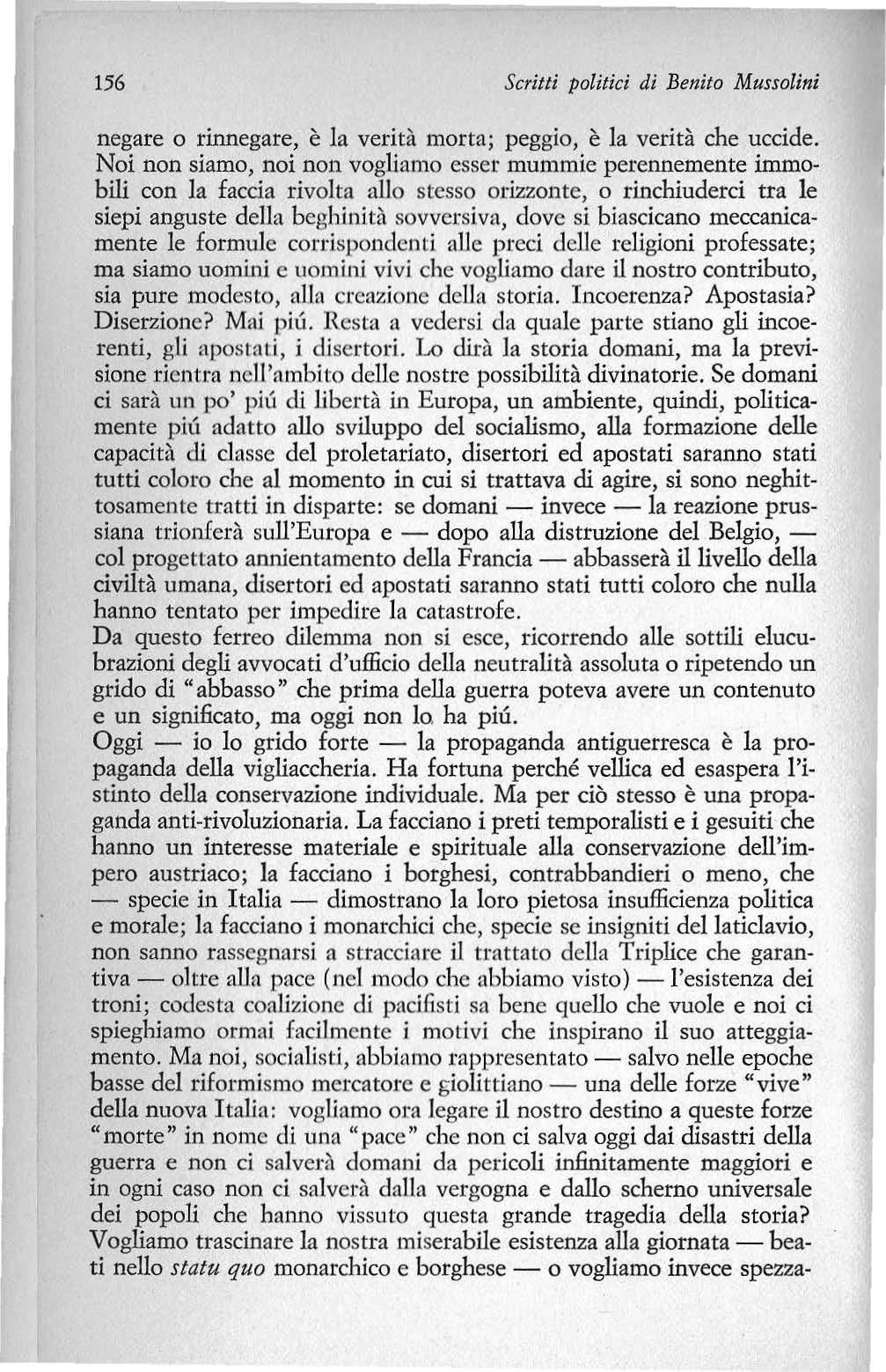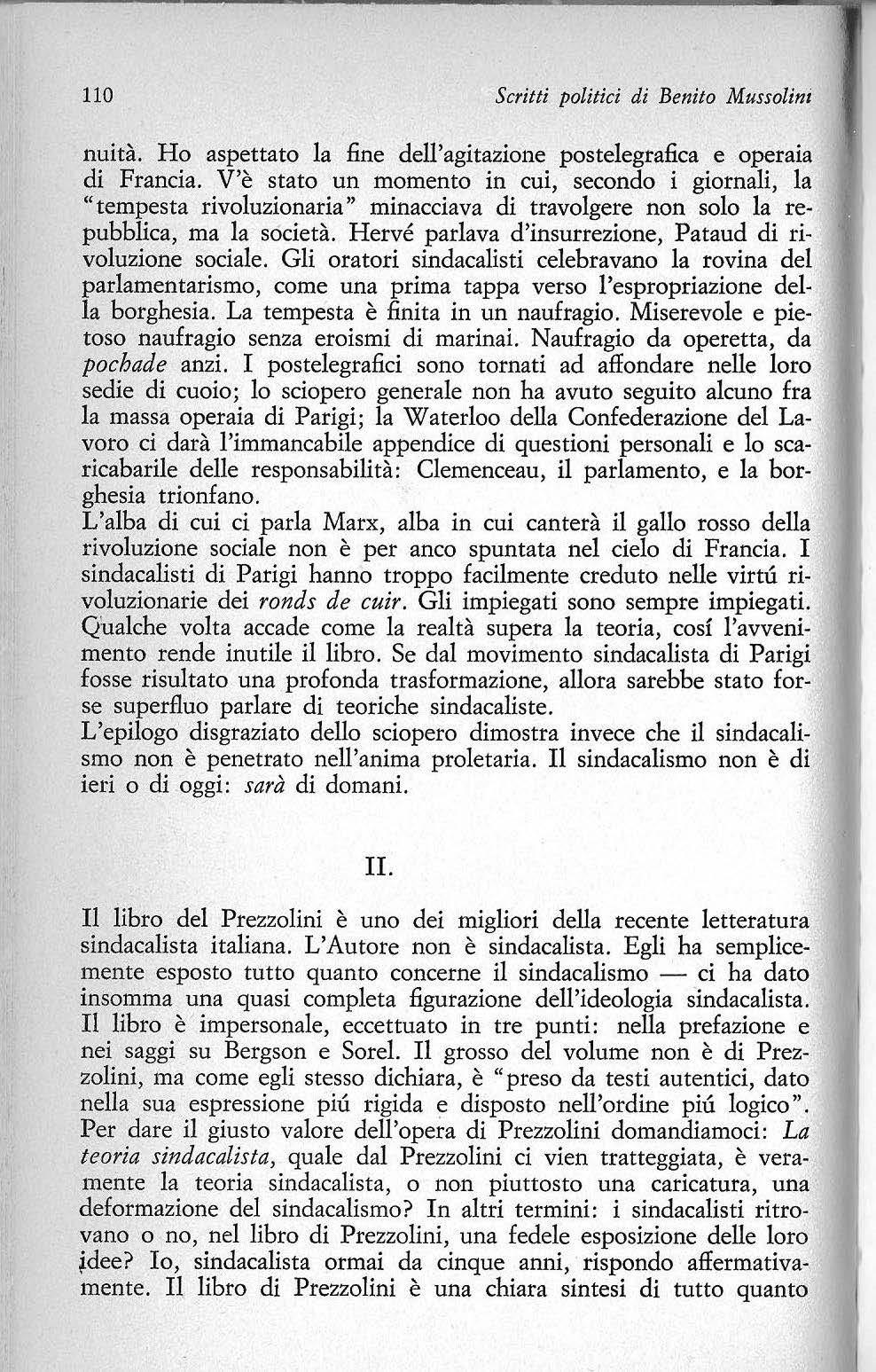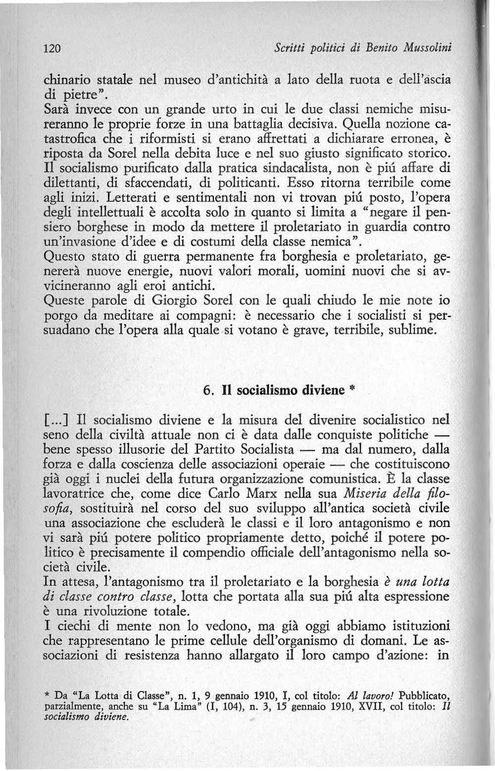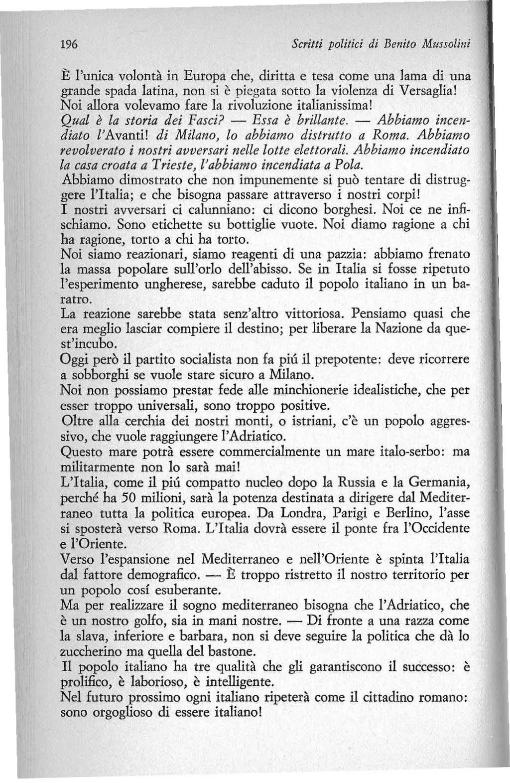 alcuni anni. Un altro punto notevole, dopo lo sciopero gwerale di settembre, è la sua difesa della « teppa", nelt>omonimo articolo di fine d'anno, in cui approva ed esalta "la violenza delle folle in movimento''. In questo stesso testo Mussolini accosta nozioni che gli derivano dalle scienze umane nella loro versione positivistica (" biologia» 11 meccanica", "vita inorganica" e "vita sociale;' ecc.) alle pulsioni che trae da !ma cultura politica elementare in lui certo profondamente radicate.