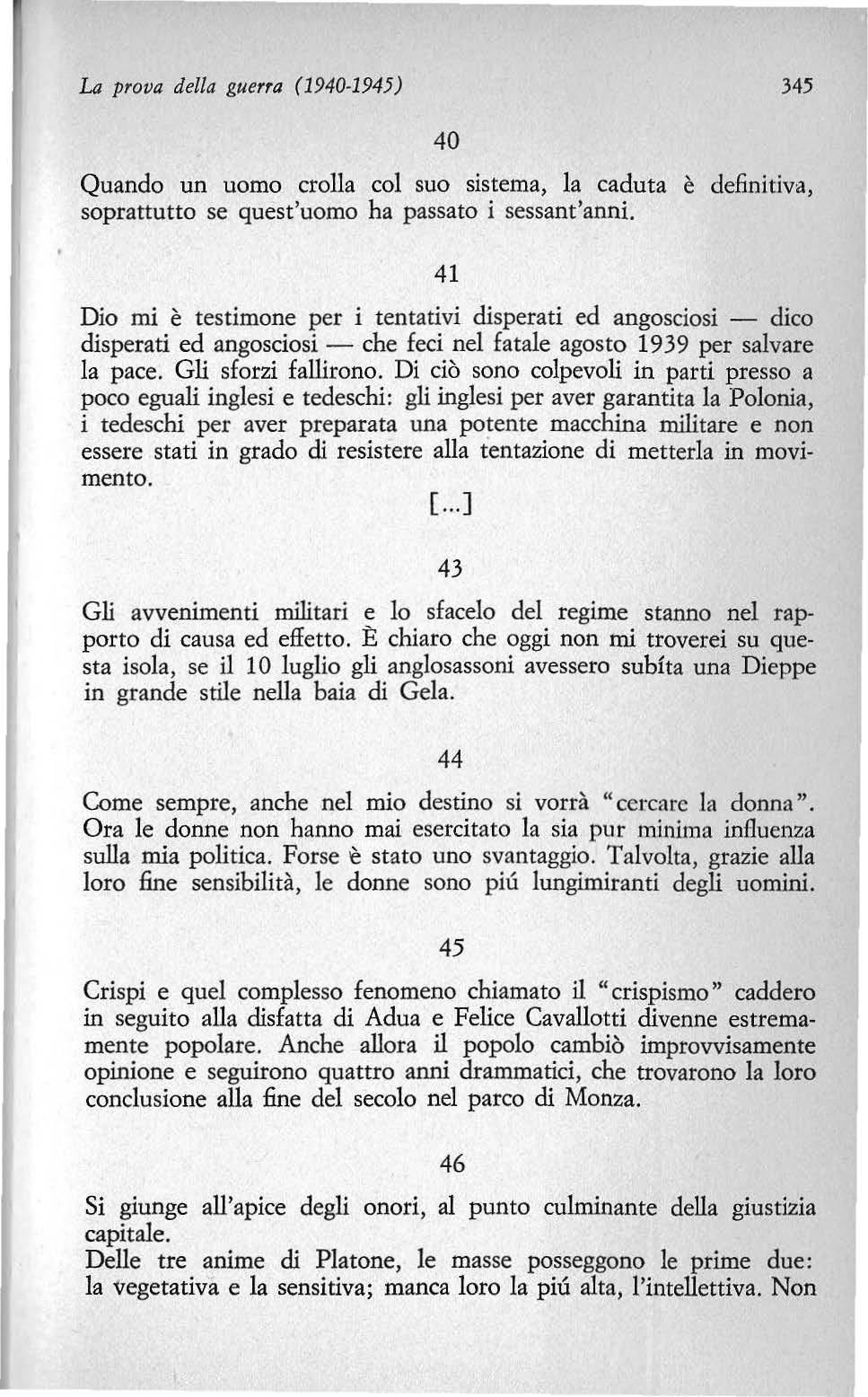 - Questa crisi, cominciata nel 1939 , non è stata superata dal popolo italiano . Risorgerà, ma l a convalescenza sarà lunga e triste e guai alle ricadute. Io sono come il grande clinico che non ha saputo fare la cura esatta e che non ha piu la fiducia dei familiari dell'importante degente. Molti medici si affollano per la successione. Molti