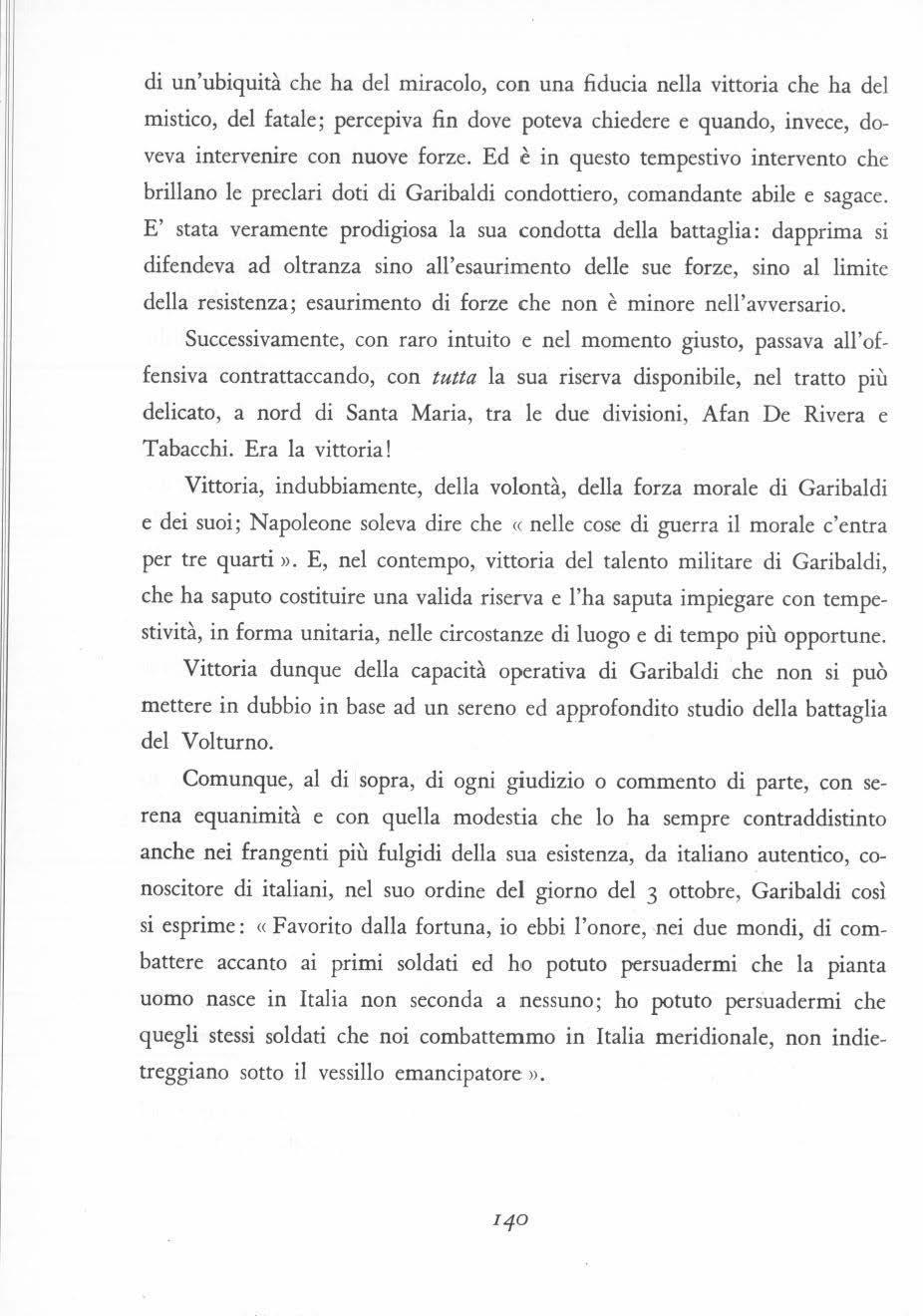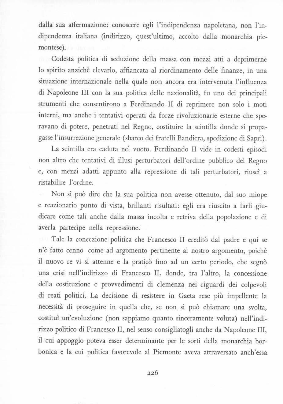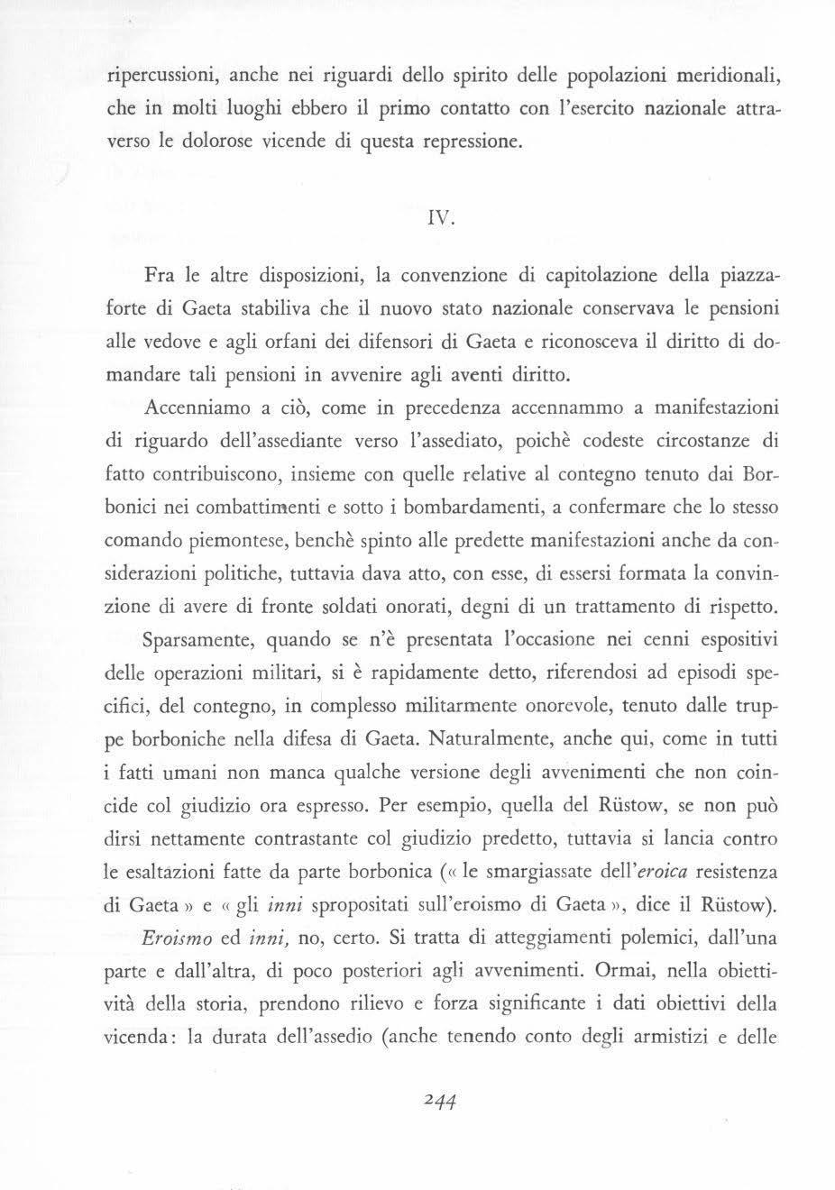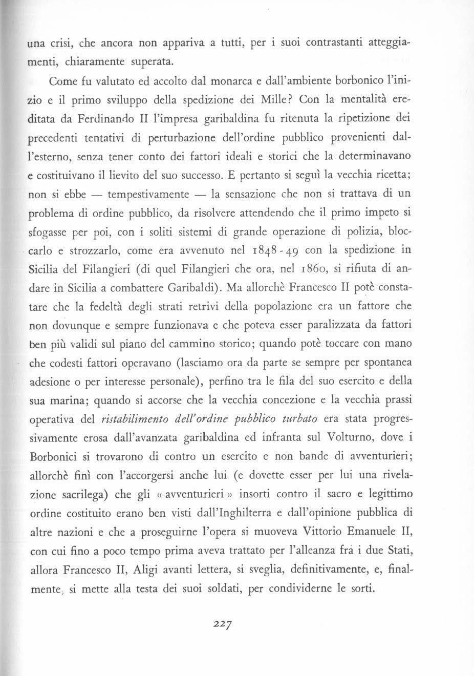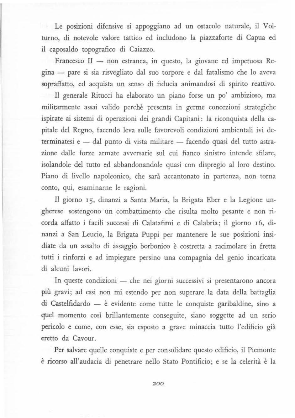 Si potrebbe prose~ire a lungo sulla via di questi contrasti e ci si Po" trebbe spostare dai casi individuali a quelli della collettività: sarebbe assai agevole contrapporre al facile successo garibaldino di Calatafimi la dura e sanguinosa giornata di Caiazzo; sarebbe naturale ed anche doveroso mettere in parallelo la resa di Palermo e la incruenta campagna delle Calabrie con la ostinata resistenza di Gaeta e con il sangue profuso sugli spalti di questa Piazza