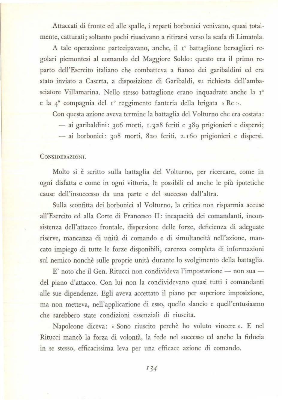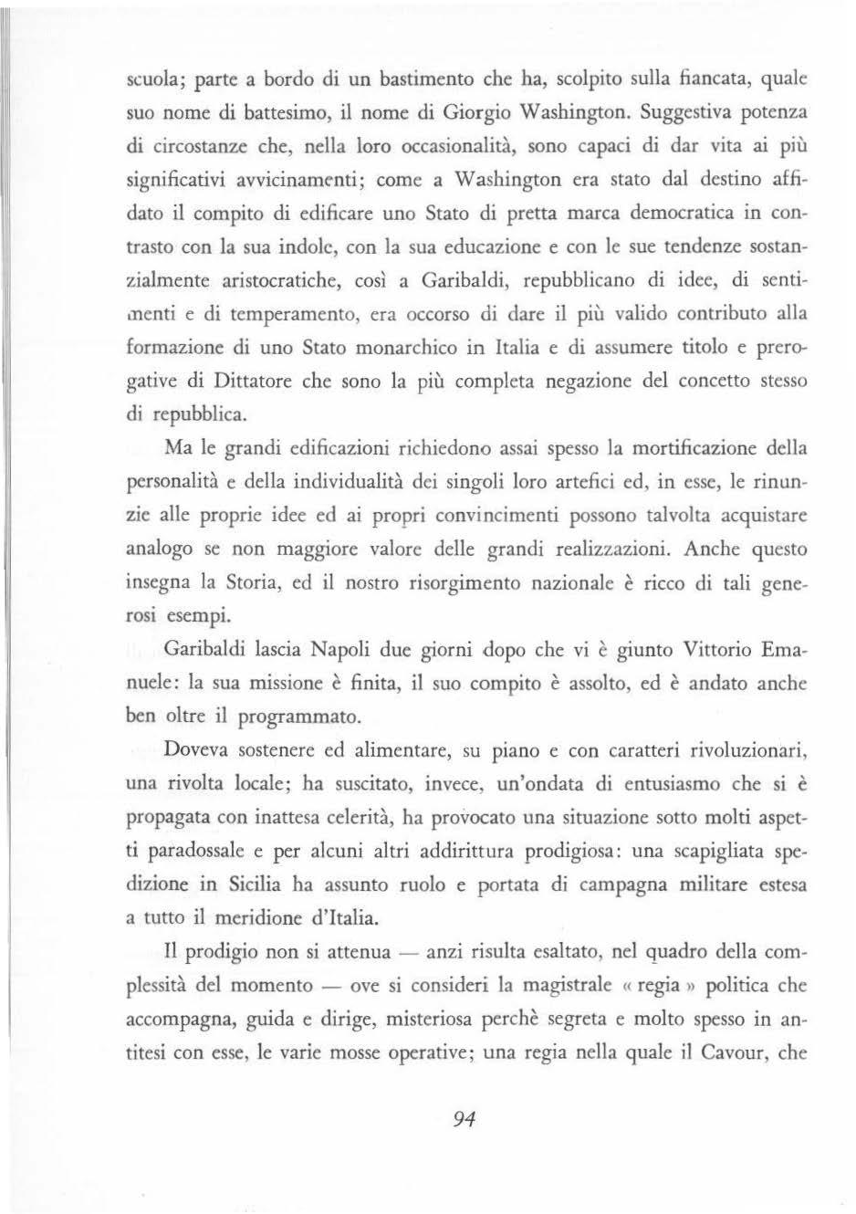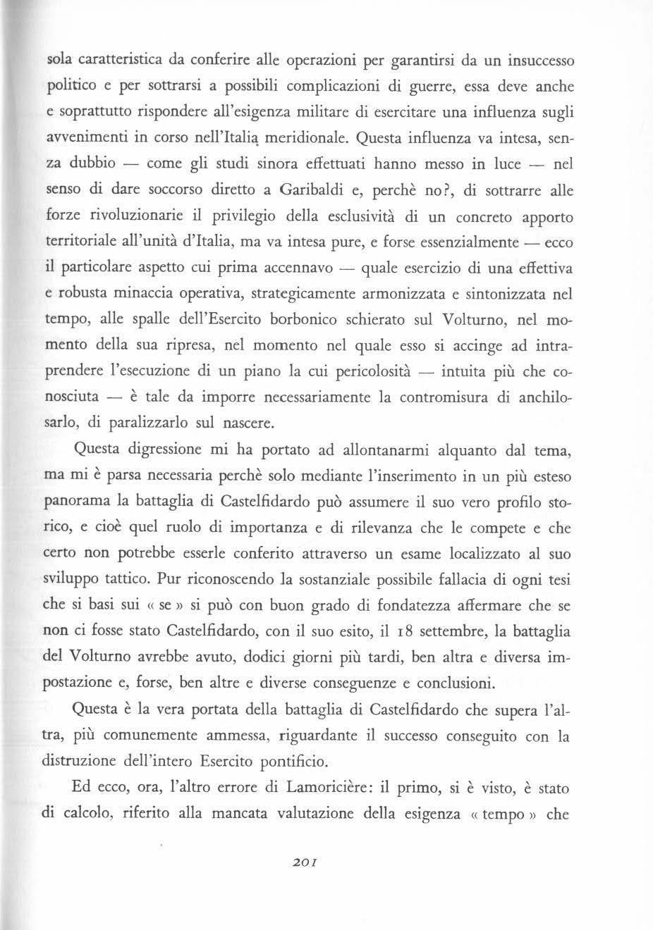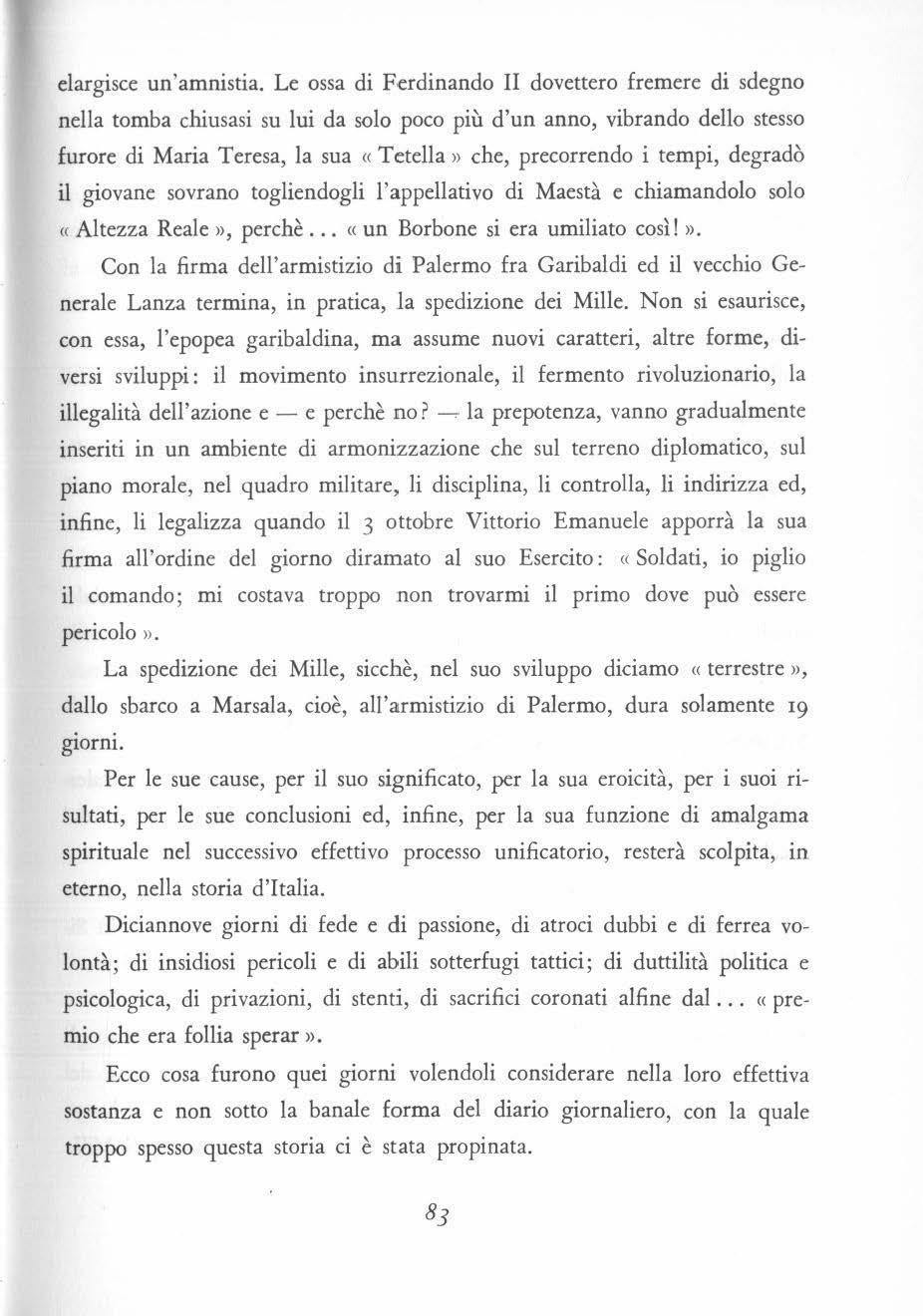 Si potrebbe prose~ire a lungo sulla via di questi contrasti e ci si Po" trebbe spostare dai casi individuali a quelli della collettività: sarebbe assai agevole contrapporre al facile successo garibaldino di Calatafimi la dura e sanguinosa giornata di Caiazzo; sarebbe naturale ed anche doveroso mettere in parallelo la resa di Palermo e la incruenta campagna delle Calabrie con la ostinata resistenza di Gaeta e con il sangue profuso sugli spalti di questa Piazza
