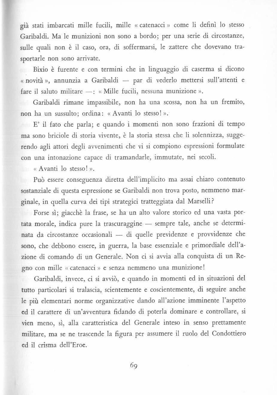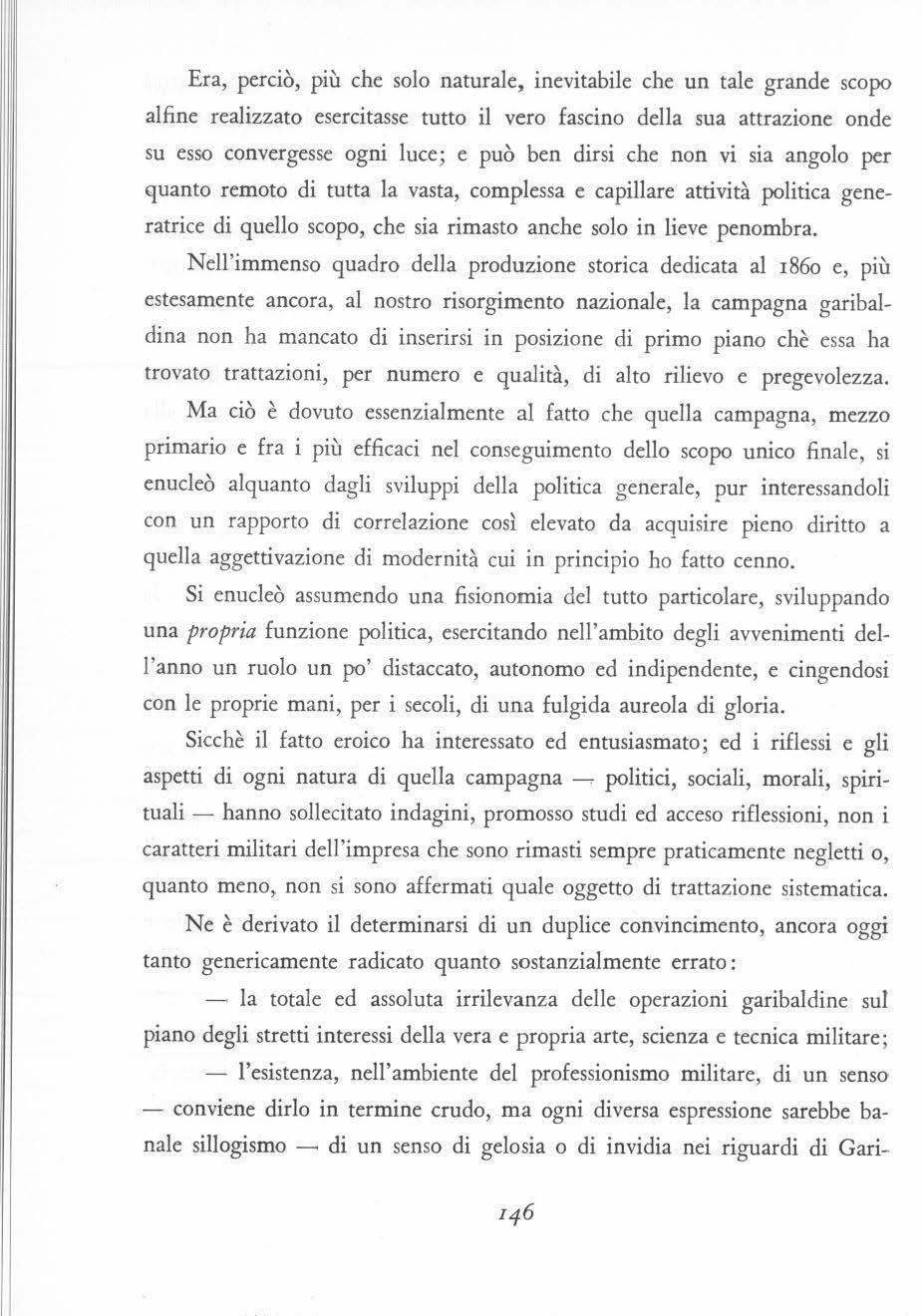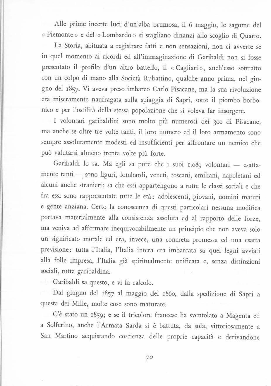 Una tale visione, piuttosto pessimistica ha portato il 1860, già di per se stesso in posizione compressa fra un '59 di euforia guerriera ed un '6I di giubilante esaltazione della più conclusiva, sostanziale e cospicua tappa del cammino risorgimentale, a non emergere, a non spaziare, a non assurgere a quel li vello di rilievo che ad esso competerebbe. E la stessa spedizione dei Mille, per la sua portata materiale e morale, ha assunto una fisonomia che potrebbe dirsi autonoma, cioè un po' staccata e distaccata, come una impresa a sè stante, con una propria aureola di gloria che la enuclea dagli avvenimenti dell'anno.