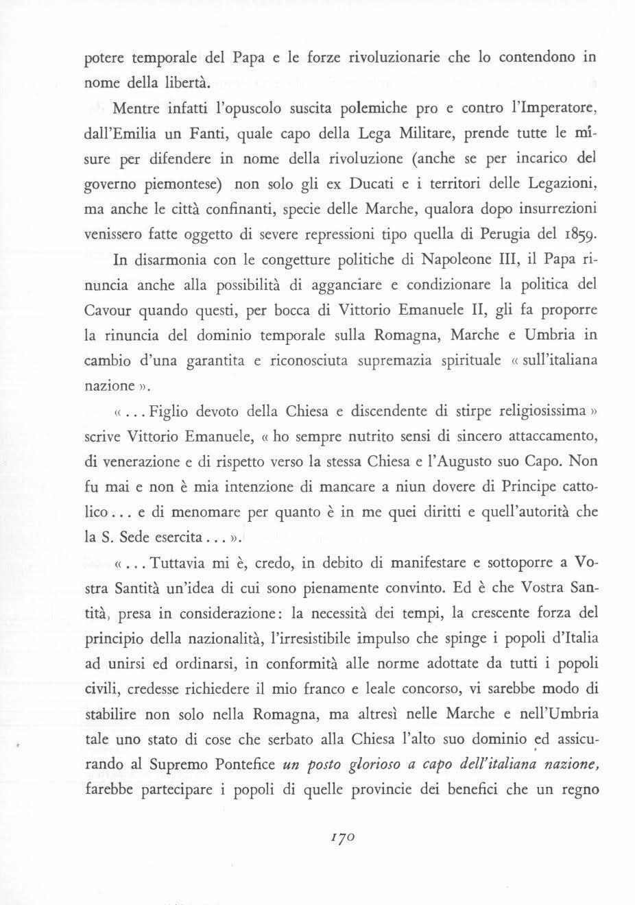 Se, dunque, il 1859 si era aperto con due squilli di guerra che si erano fatta eco sul piano di un 'alleanza, spirituale oltre che p0litica e mili'tare, sapientemente ideata e metodicamente perseguita, il 1860 si apriva su un panorama politico le cui tinte avevano i riflessi di luci ed ombre creatisi con Villafranca, con la ... benedetta pace di Villafranca. Le relazioni fra Papato e Francia, meglio fra Pio IX e Napoleone III, non erano più le tradizionali ed abituali; esse, anzi, avevano subito una vera incrinatura, una incrinatura non cos1 profonda da consentire l'integrale soluzione del problema dell'unificazione italiana mediante la sollecita rimozione dell'ostacolo rappresentato dalla intransigenza della Curia romana, ma sufficiente a promuovere, nel corso dell'anno, quella quasi tacita autorizzazione dell'Imperatore a penetrare nei territori p0ntifìci espressa con il noto, frettoloso « allez, faites, et faites vite n con cui Nap0leone III si era congedato, a Chambery, il 28 agosto, dal generale Cialdini e dal Parini, inviati straordinari di Cavour.