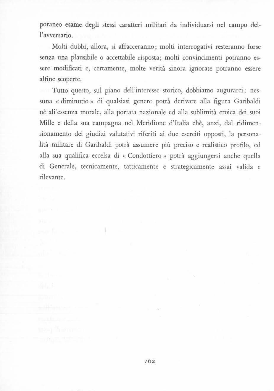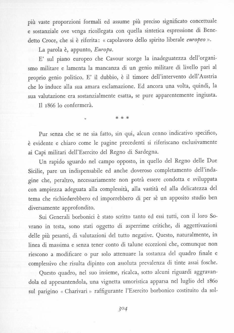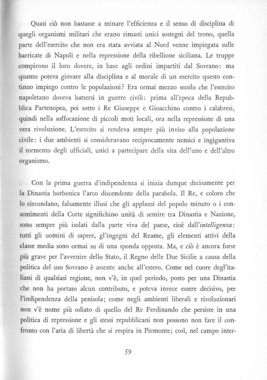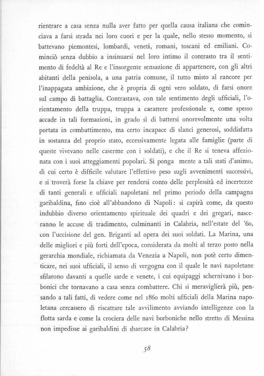 Se, però, ci si volesse mettere sul piano del più spregiudicato realismo, si dovrebbe pervenire alla constatazione che i Generali borbonici, proprio per effetto dell'assunzione di quel loro contegno che ha procurato ad essi tante critiche e tanta ignominia, si fossero esattamente allineati con i Generali piemontesi e fossero perciò meritori almeno quanto loro <lei conseguimento - con diversi mezzi e con opposti sistemi - di quel grande scopo dell'unità d'Italia che era stato passione e tormento di generosi spiriti e di intere generazioni di italiani.