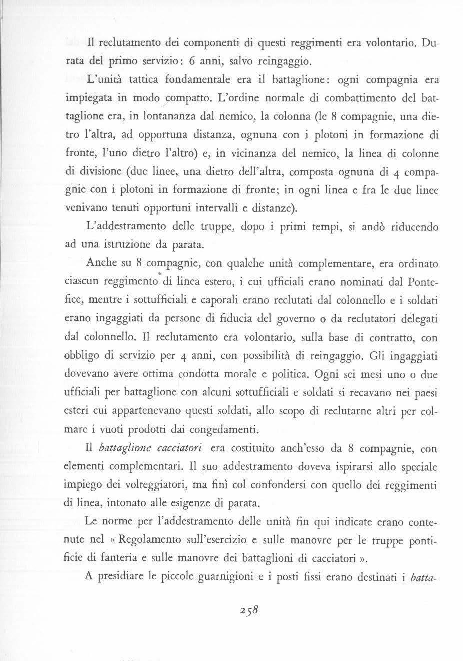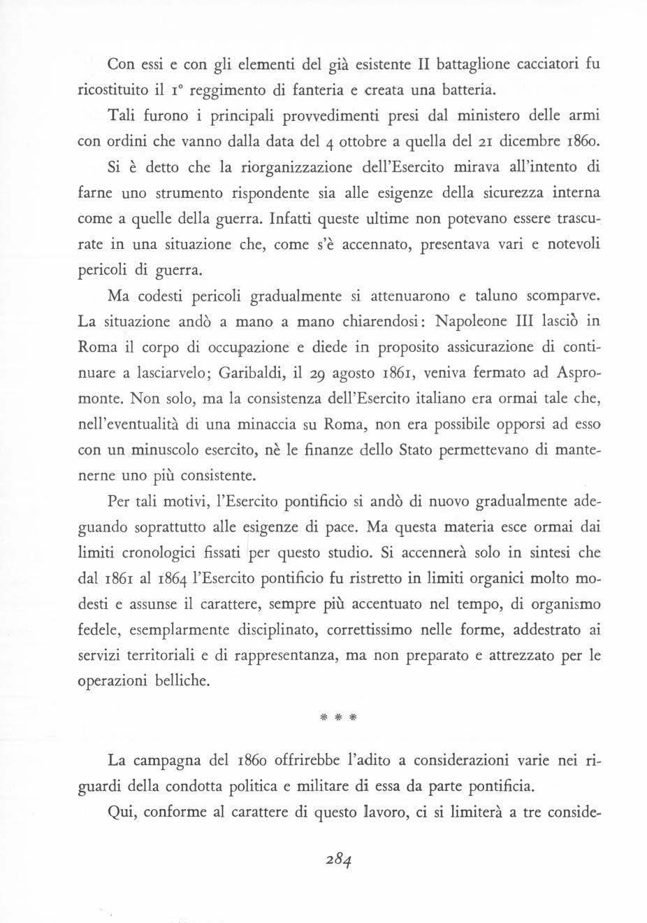 E invero quello dell'Esercito borbonico si presentava quale assai ingrato problema, per il fatto stesso che si trattava non già di un piccolo esercito municipale, come quello del Granducato di Toscana o dei Ducati di Modena e di Parma, bensì di uno dei due maggiori eserciti italiani, l'altro essendo quello sardo, al quale il borbonico aveva valorosamente tenuto testa a Gaeta, a Messina e a Civitella del Tronto, riscattando con la sua onorevole condotta le precedenti sconfitte. « Se non fossero italiani - aveva cavallerescamente dichiarato il Cialdini sotto le mura di Gaeta - sarei glorioso di combattere contro tali soldati » Si trattava dunque di un esercito pur sempre degno di rispetto, anche se battuto.