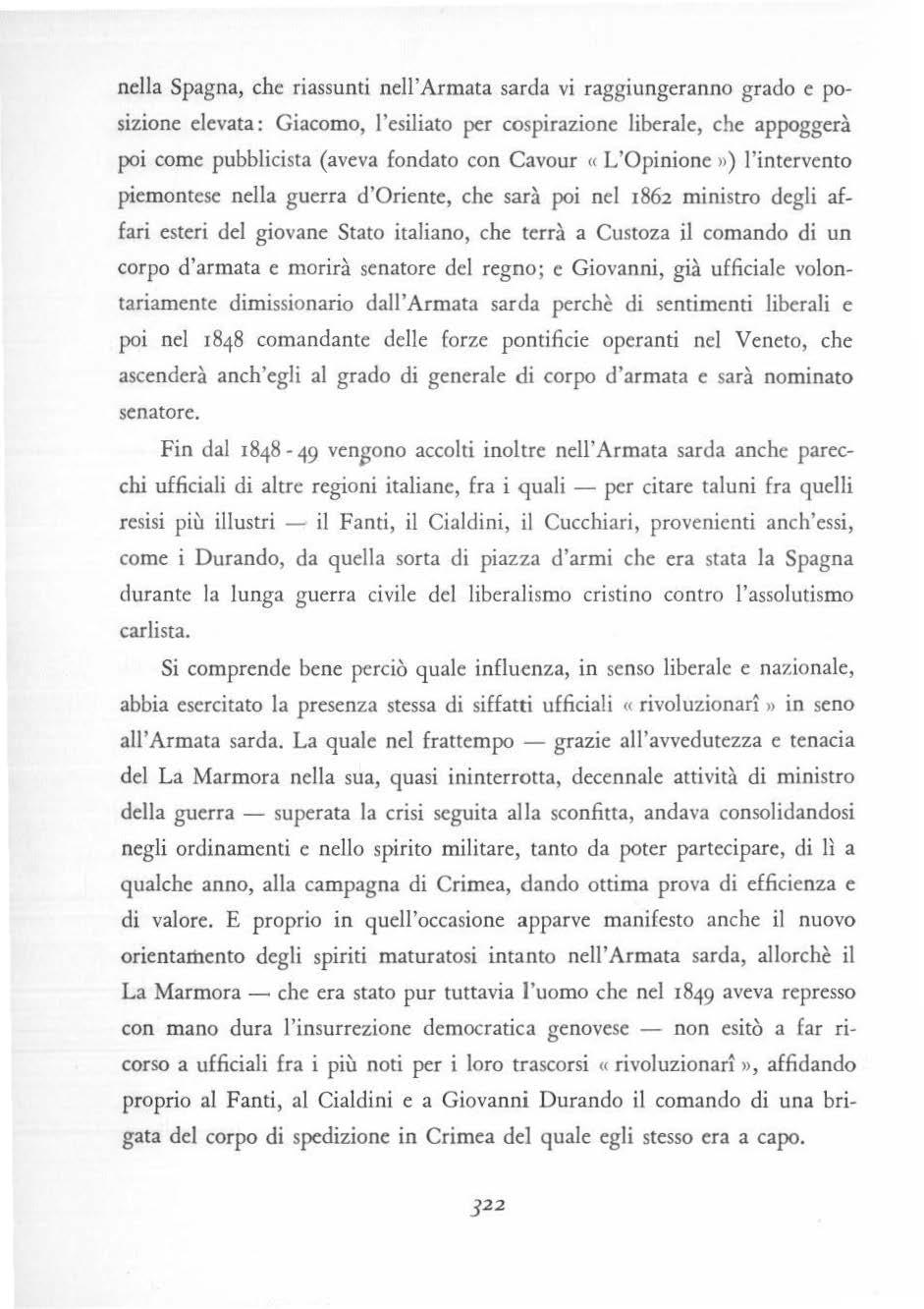 Fin dal 1848 - 49 venzono accolti inoltre nell'Armata sarda anche parecchi ufficiali di altre regioni italiane, fra i quali - per citare taluni fra quelli resisi più illustri - il Fanti, il Cialdini, il Cucchiari, provenienti anch'essi, come i Durando, da quella sorta di piazza d'armi che era stata la Spagna durante la lunga guerra civile del liberaJisrno cristino contro l'assolutismo carlista.