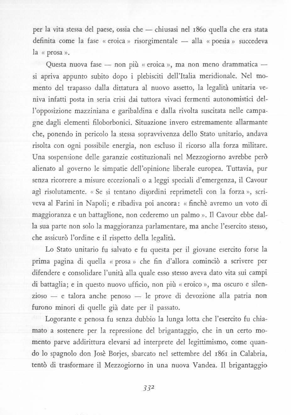 Lo Stato unitario fu salvato e fu questa per il giovane esercito forse la prima pagina di quella <<prosa » che fin d'allora cominciò a scrivere per difendere e consolidare l'unità alla quale esso stesso aveva dato vita sui campi di battaglia; e in questo nuovo ufficio, non più « eroico », ma oscuro e silenzioso - e talora anche penoso - le prove di devozione alla patria non furono minori di quelle già date per il passato.